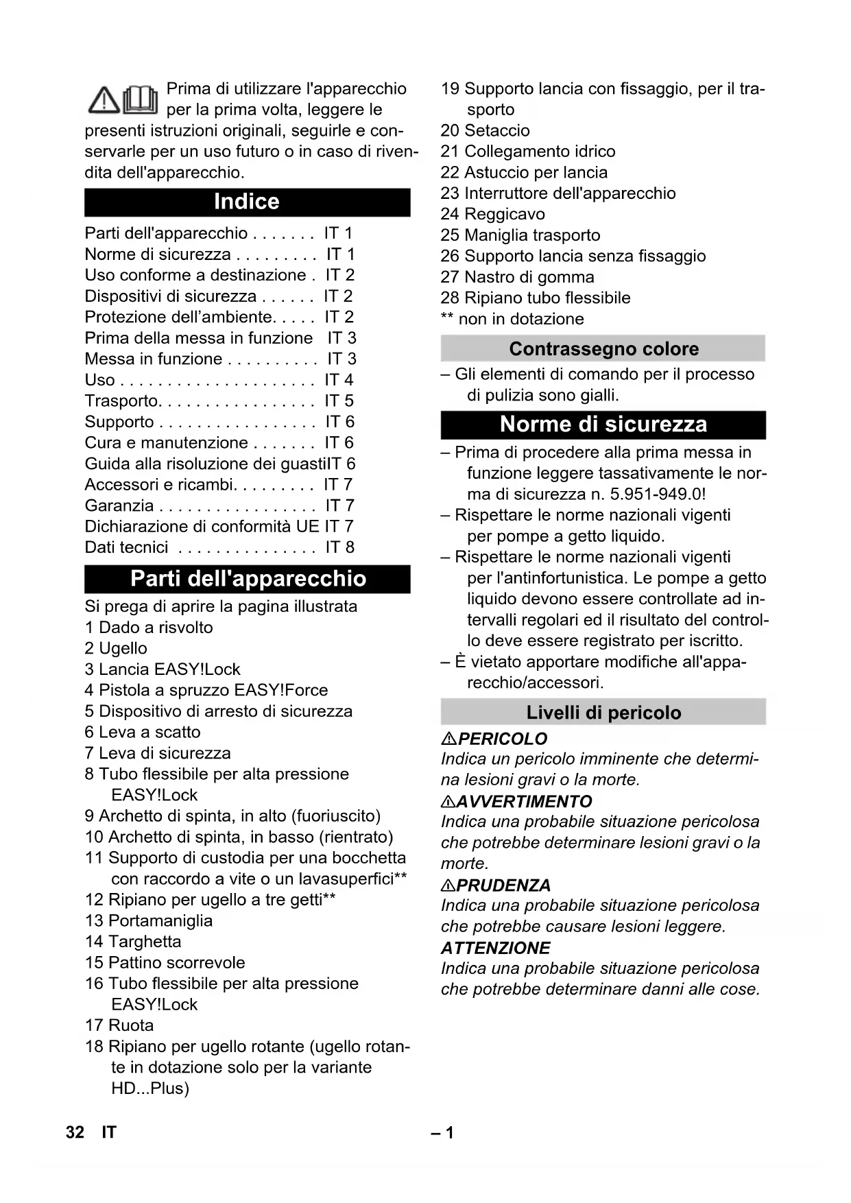 - dB(A) 89 Dimensions et poids Longueur mm 351 Largeur mm 312 Hauteur mm 904 Poids de fonctionnement typique kg 20,5 31FR– 1 Prima di utilizzare l'apparecchio per la prima volta, leggere le presenti istruzioni originali, seguirle e con- servarle per un uso futuro o in caso di riven- dita dell'apparecchio. Si prega di aprire la pagina illustrata 1 Dado a risvolto 2 Ugello 3 Lancia EASY!Lock 4 Pistola a spruzzo EASY!Force 5 Dispositivo di arresto di sicurezza 6 Leva a scatto 7 Leva di sicurezza 8 Tubo flessibile per alta pressione EASY!Lock 9 Archetto di spinta, in alto (fuoriuscito) 10 Archetto di spinta, in basso (rientrato) 11 Supporto di custodia per una bocchetta con raccordo a vite o un lavasuperfici** 12 Ripiano per ugello a tre getti** 13 Portamaniglia 14 Targhetta 15 Pattino scorrevole 16 Tubo flessibile per alta pressione EASY!Lock 17 Ruota 18 Ripiano per ugello rotante (ugello rotan- te in dotazione solo per la variante HD Plus) 19 Supporto lancia con fissaggio, per il tra- sporto 20 Setaccio 21 Collegamento idrico 22 Astuccio per lancia 23 Interruttore dell'apparecchio 24 Reggicavo 25 Maniglia trasporto 26 Supporto lancia senza fissaggio 27 Nastro di gomma 28 Ripiano tubo flessibile ** non in dotazione – Gli elementi di comando per il processo di pulizia sono gialli. – Prima di procedere alla prima messa in funzione leggere tassativamente le nor- ma di sicurezza n. 5.951-949.0! – Rispettare le norme nazionali vigenti per pompe a getto liquido. – Rispettare le norme nazionali vigenti per l'antinfortunistica. Le pompe a getto liquido devono essere controllate ad in- tervalli regolari ed il risultato del control- lo deve essere registrato per iscritto. – È vietato apportare modifiche all'appa- recchio/accessori. PERICOLO Indica un pericolo imminente che determi- na lesioni gravi o la morte. 몇 AVVERTIMENTO Indica una probabile situazione pericolosa che potrebbe determinare lesioni gravi o la morte. 몇 PRUDENZA Indica una probabile situazione pericolosa che potrebbe causare lesioni leggere. ATTENZIONE Indica una probabile situazione pericolosa che potrebbe determinare danni alle cose. Indice Parti dell'apparecchio IT 1 Norme di sicurezza IT 1 Uso conforme a destinazione . IT 2 Dispositivi di sicurezza IT 2 Protezione dell’ambiente IT 2 Prima della messa in funzione IT 3 Messa in funzione IT 3 Uso IT 4 Trasporto IT 5 Supporto IT 6 Cura e manutenzione IT 6 Guida alla risoluzione dei guastiIT 6 Accessori e ricambi IT 7 Garanzia IT 7 Dichiarazione di conformità UE IT 7 Dati tecnici IT 8 Parti dell'apparecchio Contrassegno colore Norme di sicurezza Livelli di pericolo 32 IT– 2 Getti ad alta pressione possono risultare pericolosi se usati in modo non conforme a destinazio- ne. Il getto non va mai puntato su persone, animali, equipaggiamenti elettrici attivi o sull'apparecchio stesso. Secondo quanto prescritto dalle regolamentazioni in vigore è ne- cessario che l'apparecchio non venga usato mai senza separatore di sistema sulla rete di acqua potabile. Uti- lizzare un idoneo separatore di sistema del- la ditta KÄRCHER oppure in alternativa un separatore di sistema secondo la norma EN 12729 tipo BA. L'acqua che scorre attraverso un separato- re di sistema non è classificata come acqua potabile. Utilizzare esclusivamente questa idropuli- trice – Per la pulitura con getto ad alta pressio- ne (p. es. pulizia di facciate, terrazzi, at- trezzi di giardinaggio). Con l'accessorio opzionale può essere ag- giunto del detergente. Per lo sporco più resistente raccomandia- mo l'utilizzo di un ugello rotante (in dotazio- ne solo per la variante HD