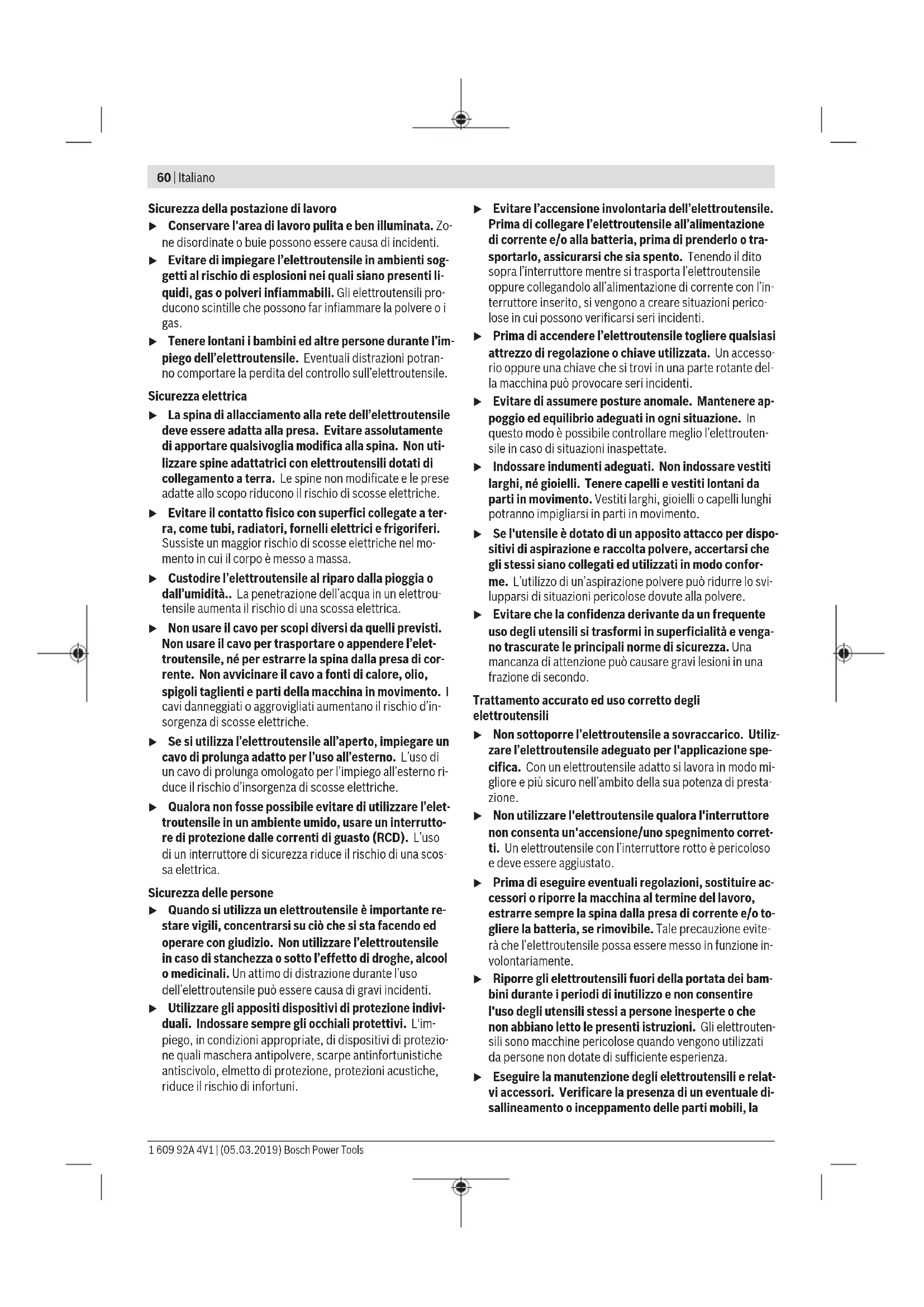 22CF | 23 | 29CF | 30 Pressione o anel de marcação (17) com uma lâmina fina da chave de parafusos, uma espátula ou um utensílio semelhante. Empurre o anel de retenção (33) para trás, sobre a carcaça, utilizando um alicate para anéis de retenção. Ambas as metades da carcaça do suporte LED (16) que envolvem a luz de trabalho LED (18) podem ser agora colocadas na respetiva posição desejada. Assegure-se de que o cabo na luz de trabalho LED não é danificado e empurre-o, sem o dobrar, na cavidade (34) prevista para o efeito existente na carcaça. Volte a envolver a luz de trabalho LED (18) com ambas as metades da carcaça do suporte LED (16). Empurre o anel de retenção (33) e o anel de marcação (17) de volta para a posição original. Manutenção e assistência técnica Manutenção e limpeza u A bateria deverá ser retirada antes de todos os trabalhos na ferramenta elétrica (p. ex. manutenção, troca de ferramenta etc.) e antes de transportar ou de armazenar a mesma. Há perigo de ferimentos se o interruptor de ligar/desligar for acionado involuntariamente. 1 609 92A 4V1 | (05.03.2019) Bosch Power ToolsItaliano | 59 u Manter a ferramenta elétrica e as aberturas de ventilação sempre limpas, para trabalhar bem e de forma segura. Lubrificação da ferramenta elétrica Lubrificante: Massa consistente especial para engrenagens (225 ml) Número de produto 3 605 430 009 Massa Molykote Óleo para motores SAE 10/SAE 20 – Após as primeiras 150 horas de serviço, limpe a engrenagem com um solvente suave. Siga as indicações do fabricante do solvente em termos de utilização e eliminação. No final, lubrifique a engrenagem com massa consistente especial para engrenagens da Bosch. Repita o processo de limpeza respetivamente após 300 horas de serviço a contar a partir da primeira limpeza. – Lubrifique as peças móveis do acoplamento de desligamento a cada 100000 aparafusamentos com algumas gotas de óleo para motores SAE 10/SAE 20. Lubrifique as partes deslizantes e rotativas com massa Molykote. Nesta ocasião, verifique se o acoplamento apresenta sinais de desgaste, a fim de garantir que a capacidade de repetição e a exatidão não foram afetadas. De seguida, é necessário voltar a ajustar o binário do acoplamento. u Mande executar os trabalhos de manutenção e reparação apenas por pessoal especializado e qualificado. Desta forma é assegurada a segurança da ferramenta elétrica. Uma oficina de serviço pós-venda Bosch autorizada executa estes trabalhos de forma rápida e fiável. u Elimine os materiais de lubrificação e limpeza de forma ecológica. Respeite as disposições legais. Serviço pós-venda e aconselhamento O serviço pós-venda responde às suas perguntas a respeito de serviços de reparação e de manutenção do seu produto, assim como das peças sobressalentes. Desenhos explodidos e informações acerca das peças sobressalentes também em: www.bosch-pt.com A nossa equipa de consultores Bosch esclarece com prazer todas as suas dúvidas a respeito dos nossos produtos e acessórios. Indique para todas as questões e encomendas de peças sobressalentes a referência de 10 dígitos de acordo com a placa de caraterísticas do produto. Portugal Robert Bosch LDA Avenida Infante D. Henrique Lotes 2E – 3E 1800 Lisboa Para efetuar o seu pedido online de peças entre na página www.ferramentasbosch.com. Tel.: 21 8500000 Fax: 21 8511096 Brasil Robert Bosch Ltda. – Divisão de Ferramentas Elétricas Caixa postal 1195 – CEP: 13065-900 Campinas – SP Tel.: 0800 7045 446 www.bosch.com.br/contato Eliminação As ferramentas elétricas, as baterias, os acessórios e as embalagens devem ser enviados a uma reciclagem ecológica de matéria prima. Não deitar ferramentas elétricas e baterias/ pilhas no lixo doméstico! Apenas para países da UE: Conforme a Diretiva Europeia 2012/19/UE e segundo a Diretiva Europeia 2006/66/CE é necessário recolher separadamente as ferramentas elétricas que já não são mais usadas e as baterias/pilhas defeituosas ou gastas e encaminhá-las para uma reciclagem ecológica. Baterias/pilhas: Ni-Cd: níquel-cádmio Atenção: Estas baterias contêm cádmio, um metal pesado altamente tóxico. Ni-MH: níquel-hidreto metálico Italiano Avvertenze di sicurezza Avvertenze generali di sicurezza per elettroutensili ATTENZIONE Leggere tutte le avvertenze di pe- ricolo, le istruzioni operative, le fi- gure e le specifiche fornite in dotazione al presente elet- troutensile. Il mancato rispetto di tutte le istruzioni sottoe- lencate potrà comportare il pericolo di scosse elettriche, in- cendi e/o gravi lesioni. Conservare tutte le avvertenze di pericolo e le istruzioni operative per ogni esigenza futura. Il termine "elettroutensile" riportato nelle avvertenze fa rife- rimento ai dispositivi dotati di alimentazione elettrica (a filo) o a batteria (senza filo). Bosch Power Tools 1 609 92A 4V1 | (05.03.2019)60 | Italiano Sicurezza della postazione di lavoro u Conservare l'area di lavoro pulita e ben illuminata. Zo- ne disordinate o buie possono essere causa di incidenti. u Evitare di impiegare l’elettroutensile in ambienti sog- getti al rischio di esplosioni nei quali siano presenti li- quidi, gas o polveri infiammabili. Gli elettroutensili pro- ducono scintille che possono far infiammare la polvere o i gas. u Tenere lontani i bambini ed altre persone durante l’im- piego dell’elettroutensile. Eventuali distrazioni potran- no comportare la perdita del controllo sull’elettroutensile. Sicurezza elettrica u La spina di allacciamento alla rete dell’elettroutensile deve essere adatta alla presa. Evitare assolutamente di apportare qualsivoglia modifica alla spina. Non uti- lizzare spine adattatrici con elettroutensili dotati di collegamento a terra. Le spine non modificate e le prese adatte allo scopo riducono il rischio di scosse elettriche. u Evitare il contatto fisico con superfici collegate a ter- ra, come tubi, radiatori, forne