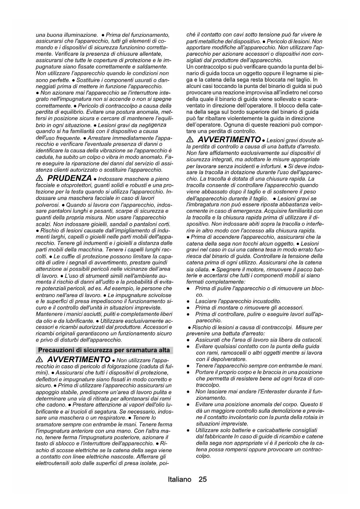 • Dichiarazione di conformità UE Italiano 25 una buona illuminazione. ● Prima del funzionamento, assicurarsi che l'apparecchio, tutti gli elementi di co- mando e i dispositivi di sicurezza funzionino corretta- mente. Verificare la presenza di chiusure allentate, assicurarsi che tutte le coperture di protezione e le im- pugnature siano fissate correttamente e saldamente. Non utilizzare l’apparecchio quando le condizioni non sono perfette. ● Sostituire i componenti usurati o dan- neggiati prima di mettere in funzione l'apparecchio. ● Non azionare mai l'apparecchio se l'interruttore inte- grato nell'impugnatura non si accende o non si spegne correttamente. ● Pericolo di contraccolpo a causa della perdita di equilibrio. Evitare una postura anomala, met- tersi in posizione sicura e cercare di mantenere l’equili- brio in ogni situazione. ● Lesioni gravi da negli genza quand o si ha familiarità con il dispositivo a causa dell' uso frequente. ● Arrestare immediatamente l'appa- recchio e verificare l'eventuale presenza di danni o identificare la causa della vibrazione se l'apparecchio è caduta, ha subito un colpo o vibra in modo anomalo. Fa- re eseguire la riparazione dei danni dal servizio di assi- stenza clienti autorizzato o sostituire l'apparecchio. 몇 PRUDENZA ● Indossare maschere a pieno facciale e otoprotettori, guanti solidi e robusti e una pro- tezione per la testa quando si utilizza l'apparecchio. In- dossare una maschera facciale in caso di lavori polverosi. ● Quando si lavora con l'apparecchio, indos- sare pantaloni lunghi e pesanti, scarpe di sicurezza e guanti della propria misura. Non usare l'apparecchio scalzi. Non indossare gioielli, sandali o pantaloni corti. ● Rischio di lesioni causate dall’impigliamento di indu- menti larghi, capelli o gioielli nelle parti mobili dell'appa- recchio. Tenere gli indumenti e i gioielli a distanza dalle parti mobili della macchina. Tenere i capelli lunghi rac- colti. ● Le cuffie di protezione possono limitare la capa- cità di udire i segnali di avvertimento, prestare quindi attenzione ai possibili pericoli nelle vicinanze dell’area di lavoro. ● L'uso di strumenti simili nell'ambiente au- menta il rischio di danni all'udito e la probabilità di evita- re potenziali pericoli, ad es. Ad esempio, le persone che entrano nell'area di lavoro. ● Le impugnature scivolose e le superfici di presa impediscono il funzionamento si- curo e il controllo dell'unità in situazioni impreviste. Mantenere i manici asciutti, puliti e completamente liberi da olio e da lubrificante. ● Utilizzare esclusivamente ac- cessori e ricambi autorizzati dal produttore. Accessori e ricambi originali garantiscono un funzionamento sicuro e privo di disturbi dell'apparecchio. Precauzioni di sicurezza per sramatura alta 몇 AVVERTIMENTO ● Non utilizzare l'appa- recchio in caso di pericolo di folgorazione (caduta di ful- mini). ● Assicurarsi che tutti i dispositivi di protezione, deflettori e impugnature siano fissati in modo corretto e sicuro. ● Prima di utilizzare l’apparecchio assicurarsi un appoggio stabile, predisporre un’area di lavoro pulita e determinare una via di ritirata per allontanarsi dai rami che cadono. ● Prestare attenzione ai vapori dell'olio lu- brificante e ai trucioli di segatura. Se necessario, indos- sare una maschera o un respiratore. ● Tenere lo sramatore sempre con entrambe le mani. Tenere ferma l'impugnatura anteriore con una mano. Con l'altra ma- no, tenere ferma l'impugnatura posteriore, azionare il tasto di sblocco e l'interruttore dell'apparecchio. ● Ri- schio di scosse elettriche se la catena della sega viene a contatto con linee elettriche nascoste. Afferrare gli elettroutensili solo dalle superfici di presa isolate, poi- ché il contatto con cavi sotto tensione può far vivere le parti metalliche del dispositivo. ● Pericolo di lesioni. Non apportare modifiche all’apparecchio. Non utilizzare l'ap- parecchio per azionare accessori o dispositivi non con- sigliati dal produttore dell’apparecchio. Un contraccolpo si può verificare quando la punta del bi- nario di guida tocca un oggetto oppure il legname si pie- ga e la catena della sega resta bloccata nel taglio. In alcuni casi toccando la punta del binario di guida si può provocare una reazione improvvisa all’indietro nel corso della quale il binario di guida viene sollevato e scara- ventato in direzione dell’operatore. Il blocco della cate- na della sega sul bordo superiore del binario di guida può far ribaltare violentemente la guida in direzione dell’operatore. Ognuna di queste reazioni può compor- tare una perdita di controllo. 몇 AVVERTIMENTO ● Lesioni gravi dovute al- la perdita di controllo a causa di una battuta d'arresto. Non fare affidamento esclusivamente sui dispositivi di sicurezza integrati, ma adottare le misure appropriate per lavorare senza incidenti e infortuni. ● Si deve indos- sare la tracolla in dotazione durante l'uso dell'apparec- chio. La tracolla è dotata di una chiusura rapida. La tracolla consente di controllare l'apparecchio quando viene abbassato dopo il taglio e di sostenere il peso dell'apparecchio durante il taglio. ● Lesioni gravi se l'imbragatura non può essere riposta abbastanza velo- cemente in caso di emergenza. Acquisire familiarità con la tracolla e la chiusura rapida prima di utilizzare il di- spositivo. Non indossare abiti sopra la tracolla o interfe- rire in altro modo con l'accesso alla chiusura rapida. ● Prima di accendere l'apparecchio, assicurarsi che la catena della sega non tocchi alcun oggetto. ● Lesioni gravi nel caso in cui una catena tesa in modo errato fuo- riesca dal binario di guida. Controllare la tensione della catena prima di ogni utilizzo. Assicurarsi che la catena sia oliata. ● Spegnere il motore, rimuovere il pacco bat- terie e accertarsi che tutti i componenti mobili si siano fermati completamente: ● Prim