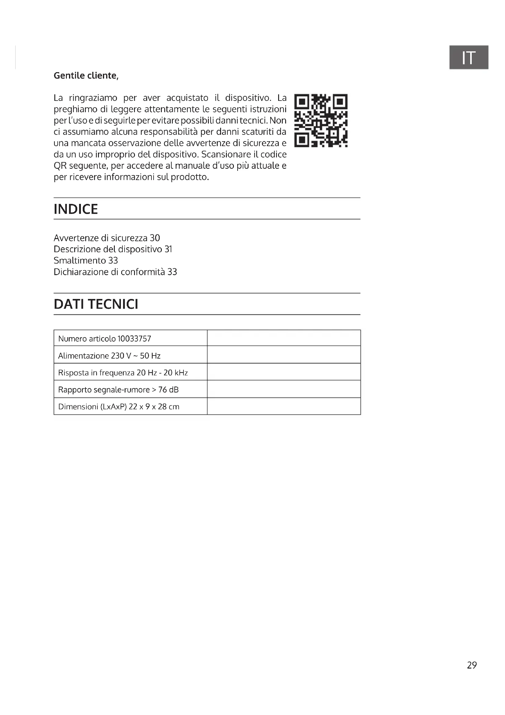 Gentile cliente, La ringraziamo per aver acquistato il dispositivo. La preghiamo di leggere attentamente le seguenti istruzioni per l’uso e di seguirle per evitare possibili danni tecnici. Non ci assumiamo alcuna responsabilità per danni scaturiti da una mancata osservazione delle avvertenze di sicurezza e da un uso improprio del dispositivo. Scansionare il codice QR seguente, per accedere al manuale d’uso più attuale e per ricevere informazioni sul prodotto. INDICE Avvertenze di sicurezza 30 Descrizione del dispositivo 31 Smaltimento 33 Dichiarazione di conformità 33 DATI TECNICI Numero articolo 10033757 Alimentazione 230 V ~ 50 Hz Risposta in frequenza 20 Hz - 20 kHz Rapporto segnale-rumore > 76 dB Dimensioni (LxAxP) 22 x 9 x 28 cm30