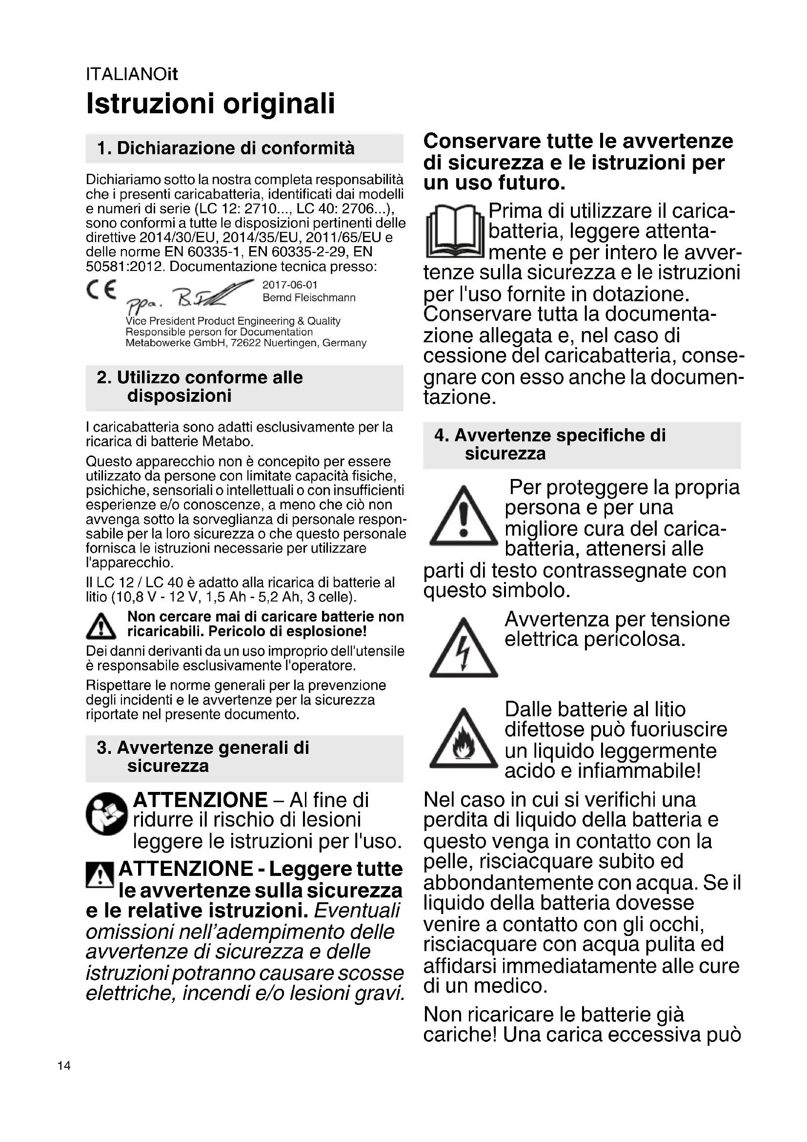 Dichiariamo sotto la nostra completeness che i presenti caricabatteria, identificati dai modelli e numero di series (LC 12: 2710..., LC 40: 2706...), sono conformi a tutte le disposizioni pertinenti delle direttive 2014/30/EU, 2014/35/EU, 2011/65/EU e delle norme EN 60335-1, EN 60335-2-29, EN 50581:2012. Documentazione tecnica presso: