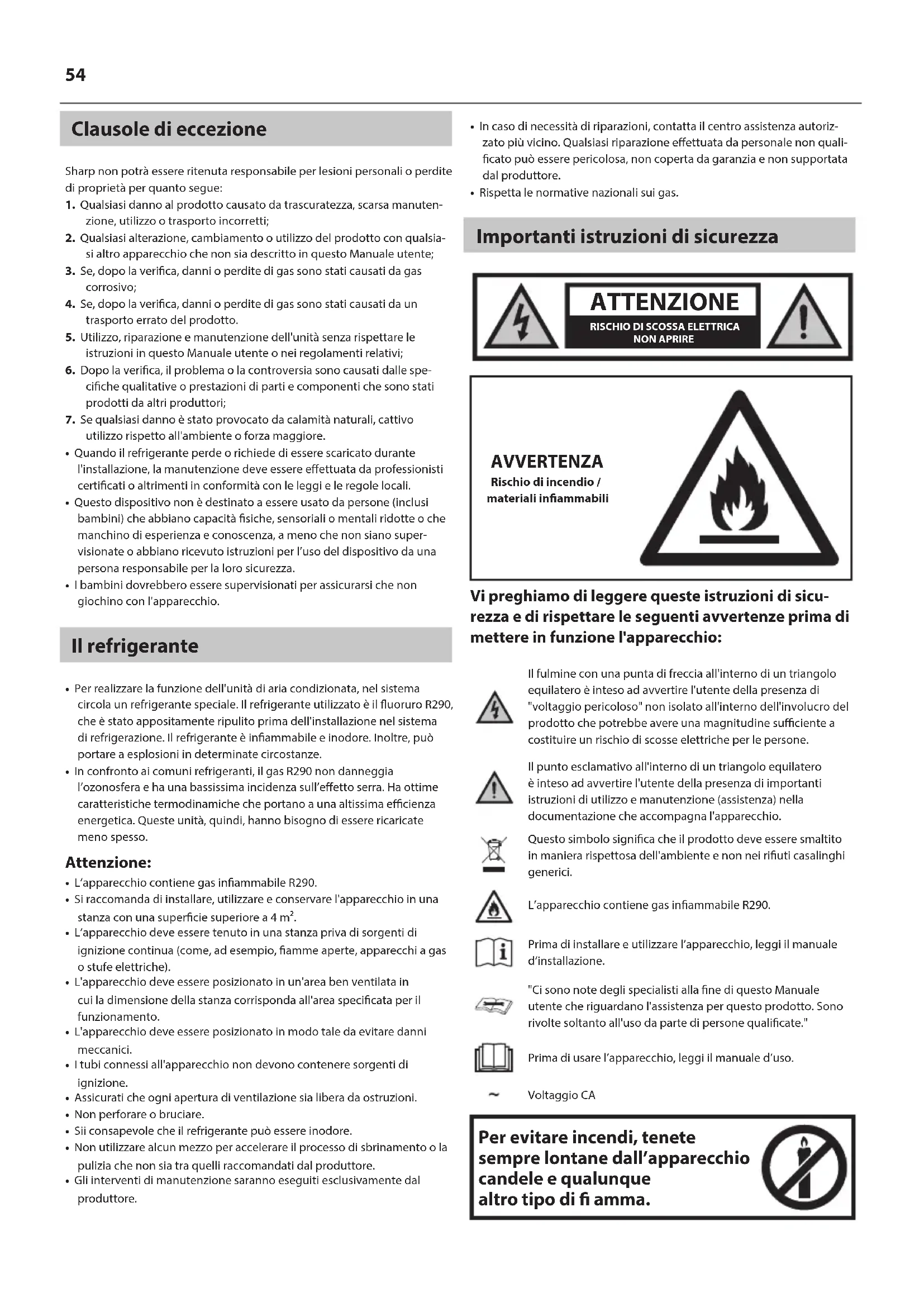 temporairement. j. Une fois les bouteilles correctement remplies et le processus terminé, assurez-vous que les bouteilles et l’équipement sont retirés du site rapidement et que toutes les vannes d’isolement de l’équipement sont fermées. k. Le réfrigérant récupéré ne doit pas être chargé dans un autre système de réfrigération à moins qu’il n’ait été nettoyé et vérié. Étiquetage L'équipement doit être étiqueté en indiquant qu'il a été déclassé et vidé de réfrigérant. L’étiquette doit être datée et signée. Pour les appareils conte- nant des réfrigérants inammables, assurez-vous qu'il y a des étiquettes sur l'équipement indiquant que l'équipement contient un réfrigérant inammable. Récupération Lorsque vous retirez du réfrigérant d'un système, que ce soit pour l'entretien ou la mise hors service, il est recommandé de retirer tous les réfrigérants de manière sûre. Lors du transfert de réfrigérant dans des bouteilles, veillez à n'utiliser que des bouteilles de récupération de réfrigérant appropriées. Assurez-vous que le nombre correct de bouteilles permettant de contenir la charge totale du système est disponible. Tous les cylindres à utiliser sont désignés pour le réfrigérant récupéré et étiquetés pour que ce réfrigérant (Ayez des cylindres spéciaux pour la récupération du réfrigérant). Les bouteilles doivent comporter une soupape de surpression et les vannes d'arrêt correspondantes en bon état de fonctionnement. Les cylindres de récupé- ration vides sont évacués et, si possible, refroidis avant la récupération. L’appareil de récupération doit être en bon état de marche avec un ensemble d’instructions concernant l’appareil à portée de main et doit être adapté à la récupération de tous les réfrigérants appropriés, y compris, le cas échéant, les réfrigérants inammables. En outre, un ensemble de ba- lances étalonnées doit être disponible et en bon état de fonctionnement. Les tuyaux doivent être complets avec des raccords de débranchement sans fuite et en bon état. Avant d’utiliser la machine de récupération, véri- ez qu’elle est en bon état de fonctionnement, qu’elle a été correctement entretenue et que tous les composants électriques associés sont scellés pour empêcher l’inammation en cas de fuite de réfrigérant. Consulter le fabricant en cas de doute. Le réfrigérant récupéré doit être renvoyé au fournisseur de uide frigori- gène dans la bouteille de récupération appropriée, et l'avis de transfert de déchets correspondant doit être mis en place. Ne mélangez pas les réfrigé- rants dans les unités de récupération et en particulier dans les bouteilles. Si des compresseurs ou des huiles de compresseur doivent être retirés, as- surez-vous qu’ils ont été évacués à un niveau acceptable pour vous assurer que le réfrigérant inammable ne reste pas dans le lubriant. Le processus d'évacuation doit être eectué avant de retourner le compresseur aux four- nisseurs. Seul un chauage électrique du corps du compresseur doit être utilisé pour accélérer ce processus. Lorsque l'huile est purgée d'un système, cela doit être eectué en toute sécurité.FR Spécications techniques Modèle UL-C10EA-W UL-C12EA-W UL-Y12EA-W Alimentation électrique 220 – 240V CA, 50Hz 220 – 240V CA, 50Hz 220 – 240V CA, 50Hz Classe de rendement énergétique Refroidissement A+ A A Chauage N/A N/A A+ Consommation énergétique en fonctionnement Refroidissement (W) 935 1345 1345 Chauage (W) N/A N/A 1190 Consommation électrique en mode veille (W) 0,5 0,5 0,5 Capacité de refroidissement (W) 2900 3520 3520 Capacité de chauage (W) N/A N/A 3100 Niveau de bruit dB(A) (vitesse du ventilateur: haute/moyenne/faible) 65/64/62 65/64/62 65/64/62 Débit d'air (haut/moyen/bas) (m³/h) 385/355/325 385/355/325 385/355/325 Plage de températures de fonctionnement (°C) 16 - 30 16 - 30 16 - 30 Surface de la pièce (m²) 13 - 19 16 - 23 16 - 23 Dimensions (L x H x P en mm) 393 x 425 x 804 393 x 425 x 804 393 x 425 x 804 Poids (kg) 32,5 34,5 35,0 Réfrigérant R290 R290 R290 Les spécications techniques peuvent être modiées sans préavis.54 Clausole di eccezione Sharp non potrà essere ritenuta responsabile per lesioni personali o perdite di proprietà per quanto segue:1. Qualsiasi danno al prodotto causato da trascuratezza, scarsa manuten-zione, utilizzo o trasporto incorretti;2. Qualsiasi alterazione, cambiamento o utilizzo del prodotto con qualsia-si altro apparecchio che non sia descritto in questo Manuale utente;3. Se, dopo la verica, danni o perdite di gas sono stati causati da gas corrosivo;4. Se, dopo la verica, danni o perdite di gas sono stati causati da un trasporto errato del prodotto.5. Utilizzo, riparazione e manutenzione dell'unità senza rispettare le istruzioni in questo Manuale utente o nei regolamenti relativi;6. Dopo la verica, il problema o la controversia sono causati dalle spe-ciche qualitative o prestazioni di parti e componenti che sono stati prodotti da altri produttori;7. Se qualsiasi danno è stato provocato da calamità naturali, cattivo utilizzo rispetto all'ambiente o forza maggiore.• Quando il refrigerante perde o richiede di essere scaricato durante l'installazione, la manutenzione deve essere eettuata da professionisti certicati o altrimenti in conformità con le leggi e le regole locali.• Questo dispositivo non è destinato a essere usato da persone (inclusi bambini) che abbiano capacità siche, sensoriali o mentali ridotte o che manchino di esperienza e conoscenza, a meno che non siano super-visionate o abbiano ricevuto istruzioni per l’uso del dispositivo da una persona responsabile per la loro sicurezza.• I bambini dovrebbero essere supervisionati per assicurarsi che non giochino con l'apparecchio. Il refrigerante