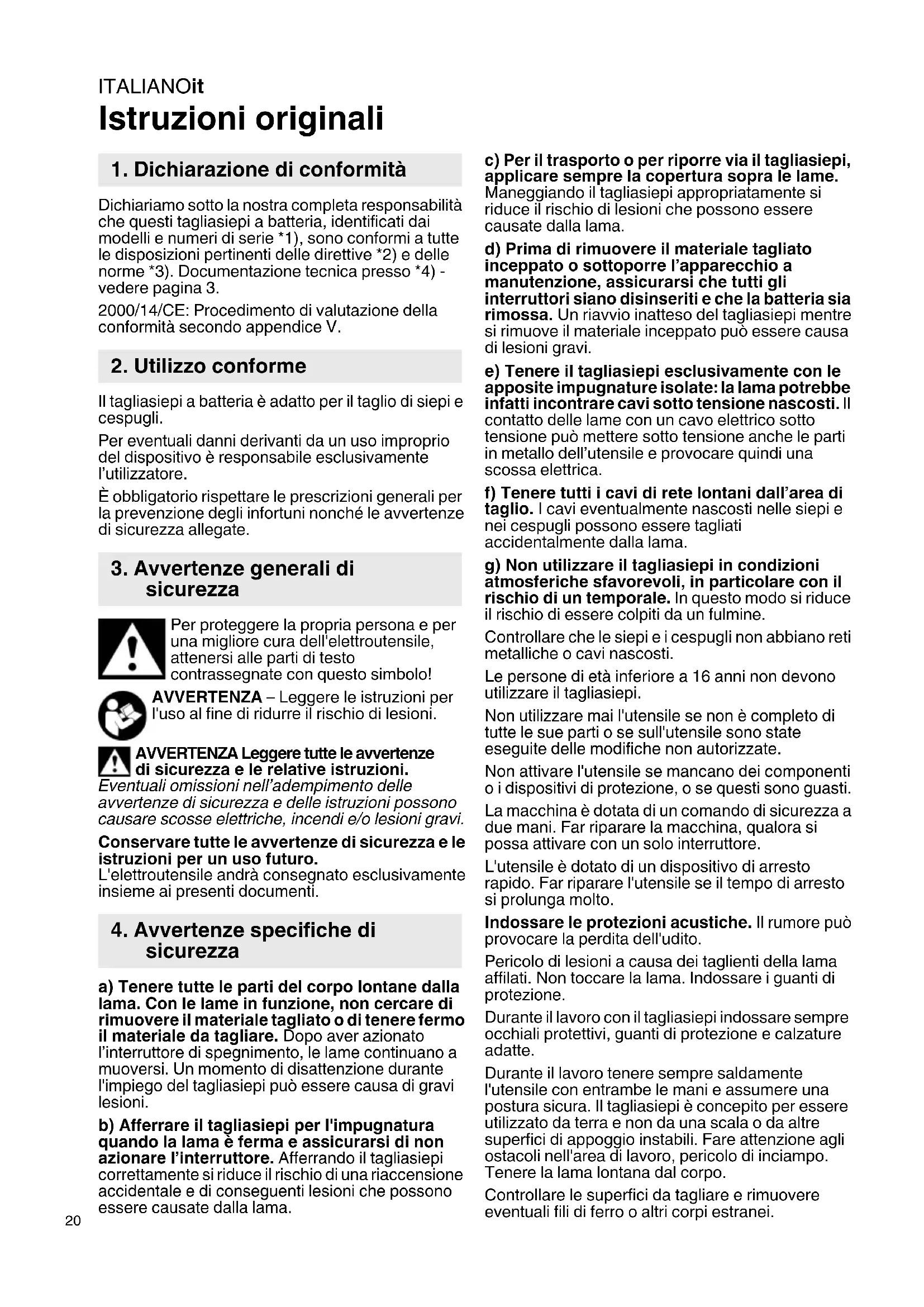 Istruzioni originali Dichiariamo sotto la nostra completa responsabilità che questi tagliasiepi a batteria, identificati dai modelli e numeri di serie *1), sono conformi a tutte le disposizioni pertinenti delle direttive *2) e delle norme *3). Documentazione tecnica presso *4) - vedere pagina 3. 2000/14/CE: Procedimento di valutazione della conformità secondo appendice V. Il tagliasiepi a batteria è adatto per il taglio di siepi e cespugli. Per eventuali danni derivanti da un uso improprio del dispositivo è responsabile esclusivamente l’utilizzatore. È obbligatorio rispettare le prescrizioni generali per la prevenzione degli infortuni nonché le avvertenze di sicurezza allegate. Per proteggere la propria persona e per una migliore cura dell'elettroutensile, attenersi alle parti di testo contrassegnate con questo simbolo! AVVERTENZA – Leggere le istruzioni per l'uso al fine di ridurre il rischio di lesioni. AVVERTENZA Leggere tutte le avvertenze di sicurezza e le relative istruzioni. Eventuali omissioni nell’adempimento delle avvertenze di sicurezza e delle istruzioni possono causare scosse elettriche, incendi e/o lesioni gravi. Conservare tutte le avvertenze di sicurezza e le istruzioni per un uso futuro. L'elettroutensile andrà consegnato esclusivamente insieme ai presenti documenti. a) Tenere tutte le parti del corpo lontane dalla lama. Con le lame in funzione, non cercare di rimuovere il materiale tagliato o di tenere fermo il materiale da tagliare. Dopo aver azionato l’interruttore di spegnimento, le lame continuano a muoversi. Un momento di disattenzione durante l'impiego del tagliasiepi può essere causa di gravi lesioni. b) Afferrare il tagliasiepi per l'impugnatura quando la lama è ferma e assicurarsi di non azionare l’interruttore. Afferrando il tagliasiepi correttamente si riduce il rischio di una riaccensione accidentale e di conseguenti lesioni che possono essere causate dalla lama. c) Per il trasporto o per riporre via il tagliasiepi, applicare sempre la copertura sopra le lame. Maneggiando il tagliasiepi appropriatamente si riduce il rischio di lesioni che possono essere causate dalla lama. d) Prima di rimuovere il materiale tagliato inceppato o sottoporre l’apparecchio a manutenzione, assicurarsi che tutti gli interruttori siano disinseriti e che la batteria sia rimossa. Un riavvio inatteso del tagliasiepi mentre si rimuove il materiale inceppato può essere causa di lesioni gravi. e) Tenere il tagliasiepi esclusivamente con le apposite impugnature isolate: la lama potrebbe infatti incontrare cavi sotto tensione nascosti. Il contatto delle lame con un cavo elettrico sotto tensione può mettere sotto tensione anche le parti in metallo dell’utensile e provocare quindi una scossa elettrica. f) Tenere tutti i cavi di rete lontani dall’area di taglio. I cavi eventualmente nascosti nelle siepi e nei cespugli possono essere tagliati accidentalmente dalla lama. g) Non utilizzare il tagliasiepi in condizioni atmosferiche sfavorevoli, in particolare con il rischio di un temporale. In questo modo si riduce il rischio di essere colpiti da un fulmine. Controllare che le siepi e i cespugli non abbiano reti metalliche o cavi nascosti. Le persone di età inferiore a 16 anni non devono utilizzare il tagliasiepi. Non utilizzare mai l'utensile se non è completo di tutte le sue parti o se sull'utensile sono state eseguite delle modifiche non autorizzate. Non attivare l'utensile se mancano dei componenti o i dispositivi di protezione, o se questi sono guasti. La macchina è dotata di un comando di sicurezza a due mani. Far riparare la macchina, qualora si possa attivare con un solo interruttore. L'utensile è dotato di un dispositivo di arresto rapido. Far riparare l'utensile se il tempo di arresto si prolunga molto. Indossare le protezioni acustiche. Il rumore può provocare la perdita dell'udito. Pericolo di lesioni a causa dei taglienti della lama affilati. Non toccare la lama. Indossare i guanti di protezione. Durante il lavoro con il tagliasiepi indossare sempre occhiali protettivi, guanti di protezione e calzature adatte. Durante il lavoro tenere sempre saldamente l'utensile con entrambe le mani e assumere una postura sicura. Il tagliasiepi è concepito per essere utilizzato da terra e non da una scala o da altre superfici di appoggio instabili. Fare attenzione agli ostacoli nell'area di lavoro, pericolo di inciampo. Tenere la lama lontana dal corpo. Controllare le superfici da tagliare e rimuovere eventuali fili di ferro o altri corpi estranei.