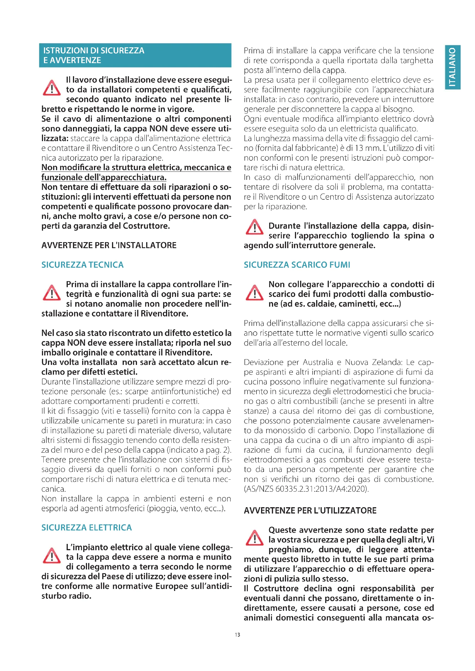 E AVVERTENZE Il lavoro d’installazione deve essere esegui- to da installatori competenti e qualicati, secondo quanto indicato nel presente li- bretto e rispettando le norme in vigore. Se il cavo di alimentazione o altri componenti sono danneggiati, la cappa NON deve essere uti- lizzata: staccare la cappa dall'alimentazione elettrica e contattare il Rivenditore o un Centro Assistenza Tec- nica autorizzato per la riparazione. Non modicare la struttura elettrica, meccanica e funzionale dell'apparecchiatura. Non tentare di eettuare da soli riparazioni o so- stituzioni: gli interventi eettuati da persone non competenti e qualicate possono provocare dan- ni, anche molto gravi, a cose e/o persone non co- perti da garanzia del Costruttore.
