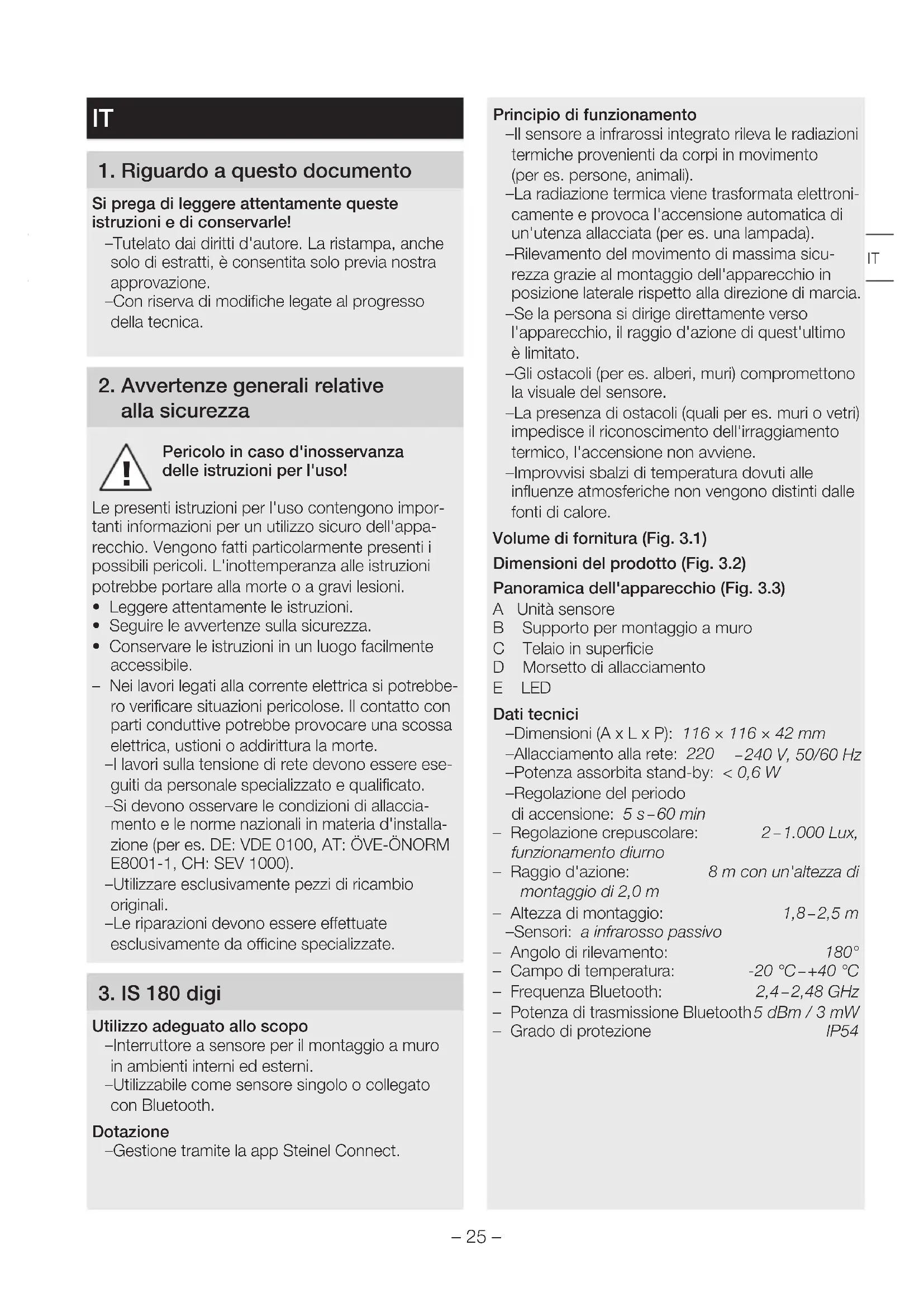 Utilizzo adeguato allo scopo – Interruttore a sensore per il montaggio a muro in ambienti interni ed esterni. – Utilizzabile come sensore singolo o collegato con Bluetooth. Dotazione – Gestione tramite la app Steinel Connect. Principio di funzionamento – Il sensore a infrarossi integrato rileva le radiazioni termiche provenienti da corpi in movimento (per es. persone, animali). – La radiazione termica viene trasformata elettroni- camente e provoca l'accensione automatica di un'utenza allacciata (per es. una lampada). – Rilevamento del movimento di massima sicu- rezza grazie al montaggio dell'apparecchio in posizione laterale rispetto alla direzione di marcia. – Se la persona si dirige direttamente verso l'apparecchio, il raggio d'azione di quest'ultimo è limitato. – Gli ostacoli (per es. alberi, muri) compromettono la visuale del sensore. – La presenza di ostacoli (quali per es. muri o vetri) impedisce il riconoscimento dell'irraggiamento termico, l'accensione non avviene. – Improvvisi sbalzi di temperatura dovuti alle influenze atmosferiche non vengono distinti dalle fonti di calore. Volume di fornitura (Fig.3.1) Dimensioni del prodotto (Fig.3.2) Panoramica dell'apparecchio (Fig.3.3) A Unità sensore B Supporto per montaggio a muro C Telaio in superficie D Morsetto di allacciamento E LED Dati tecnici – Dimensioni (A x L x P): 116×116×42mm – Allacciamento alla rete: 220 – 240V, 50/60Hz – Potenza assorbita stand-by: <0,6W – Regolazione del periodo di accensione: 5s – 60min – Regolazione crepuscolare: 2 – 1.000Lux, funzionamento diurno – Raggio d'azione: 8m con un'altezza di montaggio di 2,0 m – Altezza di montaggio: 1,8 – 2,5m – Sensori: a infrarosso passivo – Angolo di rilevamento: 180° – Campo di temperatura: -20°C – +40°C – Frequenza Bluetooth: 2,4 – 2,48GHz – Potenza di trasmissione Bluetooth 5dBm/3mW – Grado di protezione IP54 IT– 26 – Potere di rottura: – Carico lampadine incandescenti / lampade alogene: 1.000W – Carico LED / ECG: 350 W (max. 50 unità c < 132 µF)