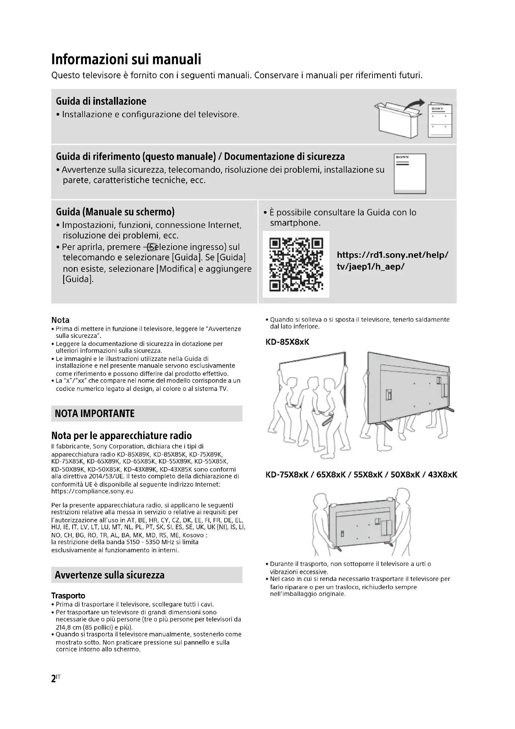 - La “x”/“xx” che compare nel nome del modello corrisponde a un codice numerico legato al design, al colore o al sistema TV. Nota per le apparecchiature radio Il fabbricante, Sony Corporation, dichiara che i tipi di apparecchiatura radio KD-85X89K, KD-85X85K, KD-75X89K, KD-75X85K, KD-65X89K, KD-65X85K, KD-55X89K, KD-55X85K, KD-50X89K, KD-50X85K, KD-43X89K, KD-43X85K sono conformi alla direttiva 2014/53/UE. Il testo completo della dichiarazione di conformità UE è disponibile al seguente indirizzo Internet: https://compliance.sony.eu Per la presente apparecchiatura radio, si applicano le seguenti restrizioni relative alla messa in servizio o relative ai requisiti per l’autorizzazione all’uso in AT, BE, HR, CY, CZ, DK, EE, FI, FR, DE, EL, HU, IE, IT, LV, LT, LU, MT, NL, PL, PT, SK, SI, ES, SE, UK, UK (NI), IS, LI, NO, CH, BG, RO, TR, AL, BA, MK, MD, RS, ME, Kosovo : la restrizione della banda 5150 - 5350 MHz si limita esclusivamente al funzionamento in interni. Trasporto