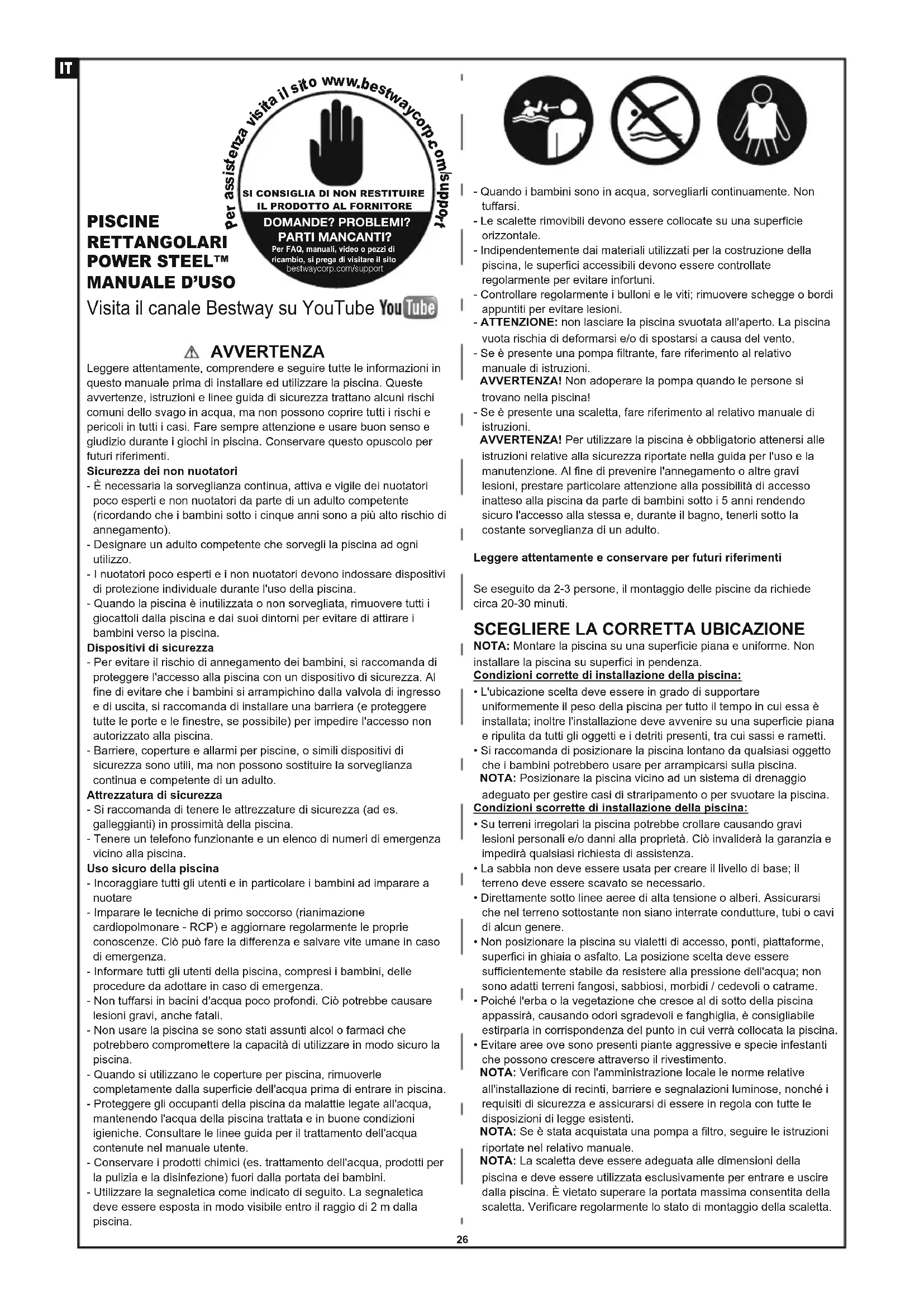 2. Wanneer het zwembad volledig droog is, besprenkel met talkpoeder om te vermijden dat het zwembad samenkleeft en vouw het zwembad dan zorgvuldig op. Als het zwembad niet volledig droog is, kan er schimmel ontstaan die de zwembadbekleding kan beschadigen. 3. Berg de bekleding en accessoires in een droge plaats op met een matige temperatuur tussen 5ºC / 41ºF and 38ºC / 100ºF. 4. Tijdens het regenseizoen moeten het zwembad en de accessoires ook volgens bovenstaan de instructies worden opgeborgen. 5. Het zwembad op incorrecte wijze laten leeglopen kan ernstig persoonlijk letsel en/of schade aan persoonlijke eigendom veroorzaken. 6. We bevelen ten zeerste aan het zwembad te demonteren buiten het seizoen (tijdens de wintermaanden). Berg op in een droge plaats en buiten het bereik van kinderen.26 AVVERTENZA Leggere attentamente, comprendere e seguire tutte le informazioni in questo manuale prima di installare ed utilizzare la piscina. Queste avvertenze, istruzioni e linee guida di sicurezza trattano alcuni rischi comuni dello svago in acqua, ma non possono coprire tutti i rischi e pericoli in tutti i casi. Fare sempre attenzione e usare buon senso e giudizio durante i giochi in piscina. Conservare questo opuscolo per futuri riferimenti.Sicurezza dei non nuotatori- È necessaria la sorveglianza continua, attiva e vigile dei nuotatori poco esperti e non nuotatori da parte di un adulto competente (ricordando che i bambini sotto i cinque anni sono a più alto rischio di annegamento).- Designare un adulto competente che sorvegli la piscina ad ogni utilizzo.- I nuotatori poco esperti e i non nuotatori devono indossare dispositivi di protezione individuale durante l'uso della piscina.- Quando la piscina è inutilizzata o non sorvegliata, rimuovere tutti i giocattoli dalla piscina e dai suoi dintorni per evitare di attirare i bambini verso la piscina.Dispositivi di sicurezza- Per evitare il rischio di annegamento dei bambini, si raccomanda di proteggere l'accesso alla piscina con un dispositivo di sicurezza. Al fine di evitare che i bambini si arrampichino dalla valvola di ingresso e di uscita, si raccomanda di installare una barriera (e proteggere tutte le porte e le finestre, se possibile) per impedire l'accesso non autorizzato alla piscina.- Barriere, coperture e allarmi per piscine, o simili dispositivi di sicurezza sono utili, ma non possono sostituire la sorveglianza continua e competente di un adulto.Attrezzatura di sicurezza- Si raccomanda di tenere le attrezzature di sicurezza (ad es. galleggianti) in prossimità della piscina.- Tenere un telefono funzionante e un elenco di numeri di emergenza vicino alla piscina.Uso sicuro della piscina- Incoraggiare tutti gli utenti e in particolare i bambini ad imparare a nuotare- Imparare le tecniche di primo soccorso (rianimazione cardiopolmonare - RCP) e aggiornare regolarmente le proprie conoscenze. Ciò può fare la differenza e salvare vite umane in caso di emergenza.- Informare tutti gli utenti della piscina, compresi i bambini, delle procedure da adottare in caso di emergenza.- Non tuffarsi in bacini d'acqua poco profondi. Ciò potrebbe causare lesioni gravi, anche fatali.- Non usare la piscina se sono stati assunti alcol o farmaci che potrebbero compromettere la capacità di utilizzare in modo sicuro la piscina.- Quando si utilizzano le coperture per piscina, rimuoverle completamente dalla superficie dell'acqua prima di entrare in piscina.- Proteggere gli occupanti della piscina da malattie legate all'acqua, mantenendo l'acqua della piscina trattata e in buone condizioni igieniche. Consultare le linee guida per il trattamento dell'acqua contenute nel manuale utente.- Conservare i prodotti chimici (es. trattamento dell'acqua, prodotti per la pulizia e la disinfezione) fuori dalla portata dei bambini.- Utilizzare la segnaletica come indicato di seguito. La segnaletica deve essere esposta in modo visibile entro il raggio di 2 m dalla piscina. PISCINE RETTANGOLARI POWER STEEL™