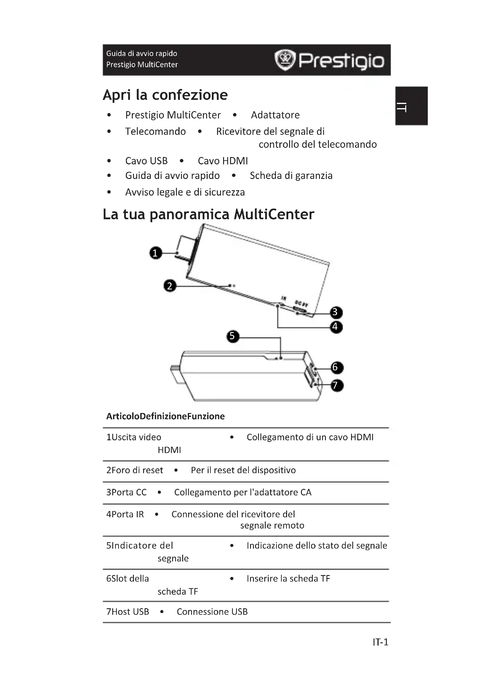- L'interfacciadellaProceduradiconfigurazioneguidataoffre l'opzionedisceglierelalinguadisistemadall'elencodelle lingueeilfusoorario.(IMPORTANTE:richiestodallamaggior partedelleAPP). Specifiche tecniche Articolo Specifica SO Android4.2 CPU DualcoreA91,5GHz GPU DualcoreMali400 RAM 1GBDDR3 Archiviazione 4GB WiFi 802.11b/g/n MiraCast A SchedaTF Finoa32GB USB2.0 *1pezzo Dimensioni 90*34*16mm SiccomeiprodottiPrestigiovengonocontinuamente aggiornatiemigliorati,ilsoftwareel'hardwaredel dispositivopotrebberoavereunaspetto leggermentediversoofunzionalitàmodificaterispettoaquelle presentatenellapresenteGuidadiAvvioRapido. ConlapresentePrestigiodichiarachequestoMultiCenterè conformeairequisitidibaseeallealtrenormativeapplicabili previstedalladirettivaUE1999/5/CE.Laversionecompleta delladichiarazionediconformitàèdisponibileall'indirizzo: http://www.prestigio.com/compliance. PAD2411 QSG.indd 54 2013/12/16 15:35:16Trumpas pradžios vadovas Prestigio MultiCenter