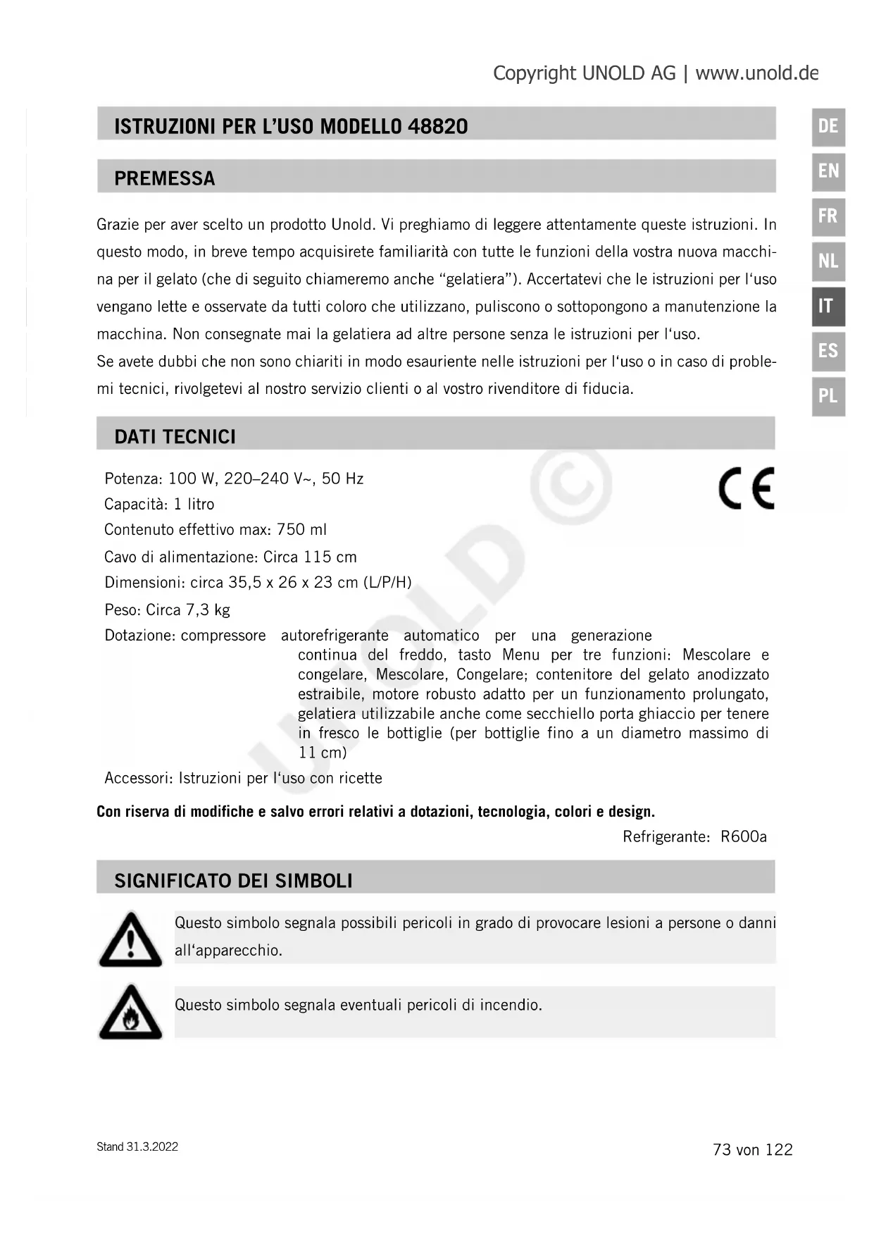 Questo simbolo segnala possibili pericoli in grado di provocare lesioni a persone o danni all‘apparecchio. Questo simbolo segnala eventuali pericoli di incendio. Grazie per aver scelto un prodotto Unold. Vi preghiamo di leggere attentamente queste istruzioni. In questo modo, in breve tempo acquisirete familiarità con tutte le funzioni della vostra nuova macchi- na per il gelato (che di seguito chiameremo anche “gelatiera”). Accertatevi che le istruzioni per l‘uso vengano lette e osservate da tutti coloro che utilizzano, puliscono o sottopongono a manutenzione la macchina. Non consegnate mai la gelatiera ad altre persone senza le istruzioni per l‘uso. Se avete dubbi che non sono chiariti in modo esauriente nelle istruzioni per l‘uso o in caso di proble- mi tecnici, rivolgetevi al nostro servizio clienti o al vostro rivenditore di fiducia. PREMESSA Refrigerante: R600a Copyright UNOLD AG | www.unold.de UNOLD ©74 von 122 Stand 31.3.2022