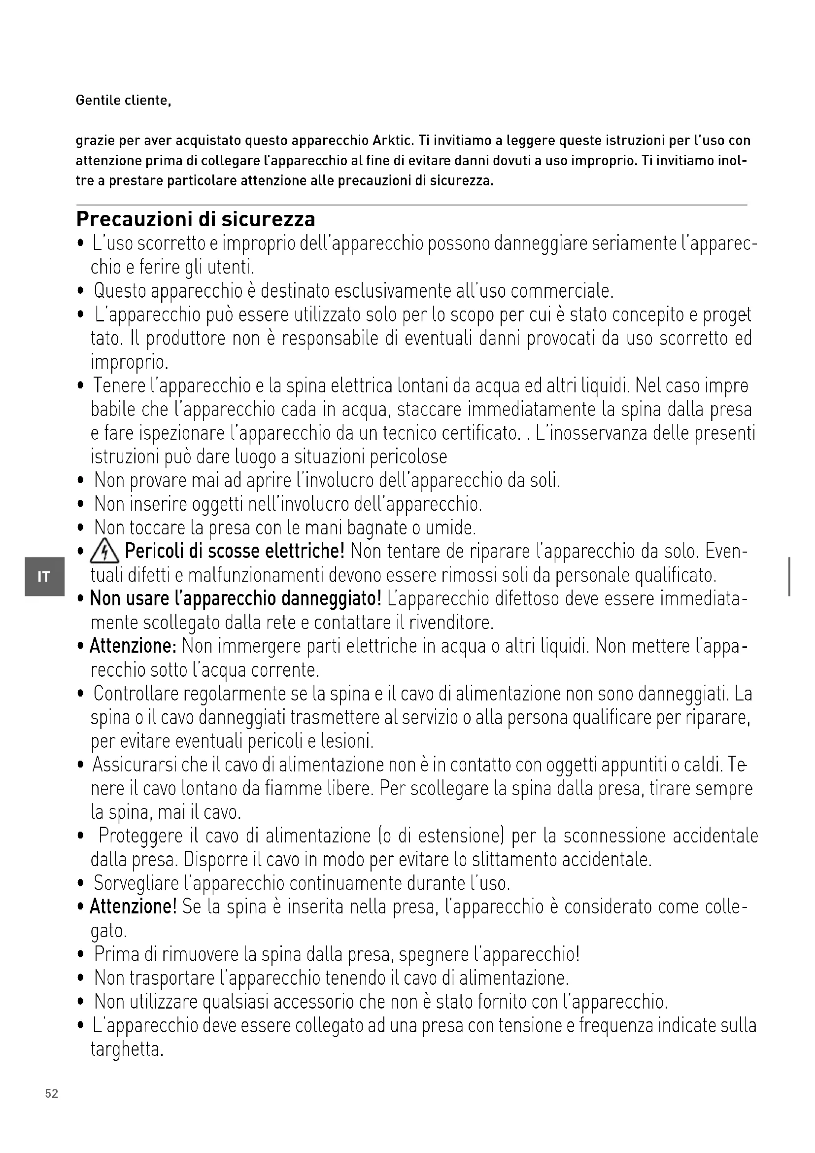 Gentile cliente, grazie per aver acquistato questo apparecchio Arktic. Ti invitiamo a leggere queste istruzioni per l’uso con attenzione prima di collegare l’apparecchio al fine di evitare danni dovuti a uso improprio. Ti invitiamo inol- tre a prestare particolare attenzione alle precauzioni di sicurezza. Precauzioni di sicurezza