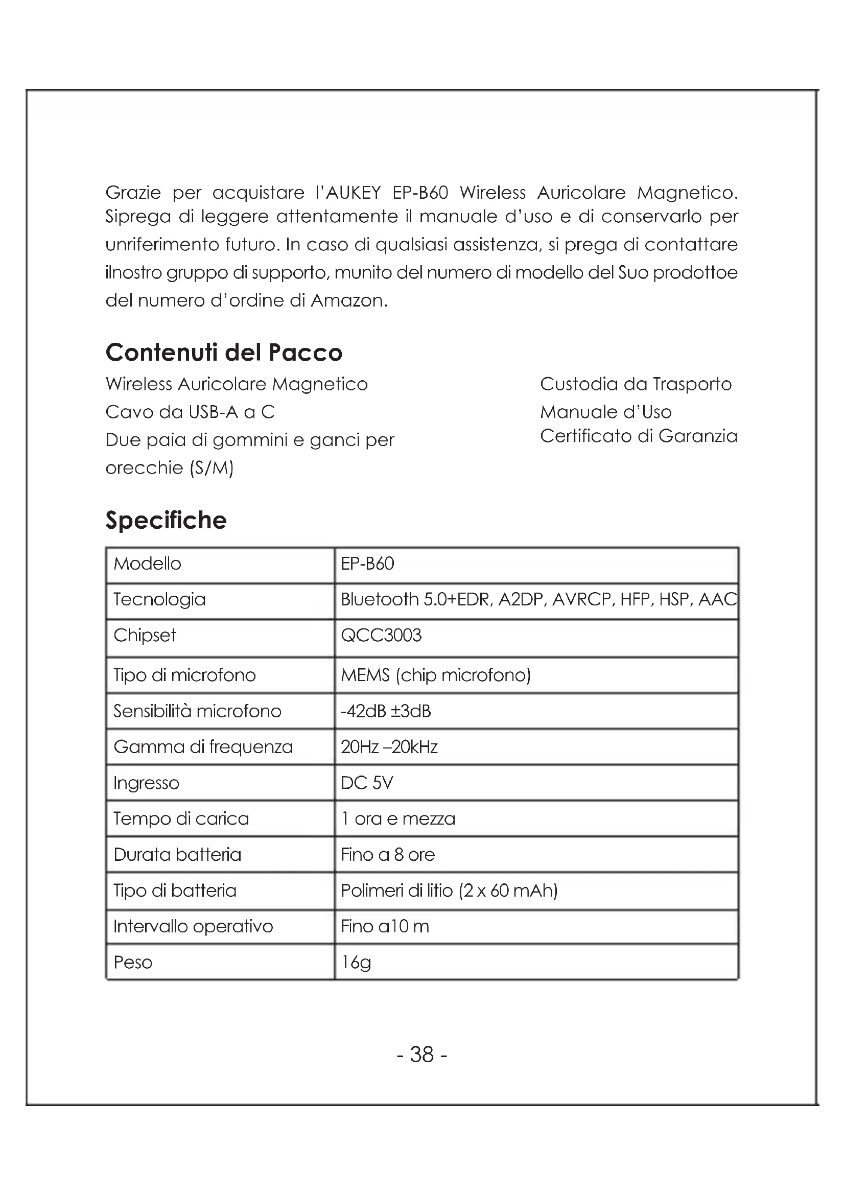 Separare gli auricolari, il dispositivo EP-B60 si accenderà ed entrerà in maniera automatica nella modalità di associazione Attivare la Bluetooth sul dispositivo che si vuole collegare agli auricolari Nella lista dei dispositivi disponibili, selezionare “AUKEY EP-B60” Se viene richiesto un codice o il PIN, inserire “0000” Per cancellare l'elenco di pairing, accendere gli auricolari e quindi tenere il volume + e il volume - contemporaneamente per 5 secondi finché il LED non si illumina in verde e bianco. Una volta azzerata la lista, si sentirà un segnale acustico e gli auricolari entreranno automaticamente in modalità associazione Gli auricolari si spegneranno automaticamente in modalità associazione dopo 5 minuti se non si collega alcun dispositivo Se il dispositivo collegato è spento o manualmente disconnesso, l’indicatore LED degli auricolari lampeggerà due volte con la luce bianca ogni 5 secondi e gli auricolari si spegneranno dopo 5 minuti Premere due volte il pulsante multifunzione dopo aver disattivato il Bluetooth su un dispositivo collegato per attivare la modalità di associazione. L'indicatore LED lampeggia alternativamente in bianco e verdeper 3 minuti. Se nessun dispositivo è associato, gli auricolari entreranno in modalità standby La copertura wireless del dispositivo raggiunge i 10 m. Se si supera questo valore, gli auricolari si scollegheranno dal dispositivo collegato e si sentirà un suono acustico. La connessione sarà ristabilita entro 5 minuti una volta rientrati nella distanza di copertura. Gli auricolari si collegheranno di nuovo in maniera automatica con l’ultimo dispositivo Play o pausa Regolazione del volume Passare alla tracciasuccessiva/ precedente Mantenere premuto sul pulsante volume +/- per 2 secondi Premere sul pulsante multifunzione una volta Premere una volta + o - collegato. Per collegare altri dispositivi, ripetere le fasi precedentiIndicatore a LED Luce bianca e verde che lampeggiano in maniera alternata Bianco lampeggiante ogni 5 secondi Bianco lampeggiante ogni 5 secondi Bianco lampeggiante una volta ogni secondo Verde lampeggiante ogni 5 secondi Verde Verde spento (dopo la carica) Stato Modalità associazione Modalità standby/ sconnesso Collegato / riproduzione della musica Chiamata Basso livello di batteria In carica Completamente carico ATTENZIONE RISCHO DI ESPLOSIONE SE LA BATTERIA VIENE SOSTITUITA CONUNA NON CORRETTA. SMALTIRE LE BATTERIE USATE SEGUENDO LEISTRUZIONI. Un’eccessiva pressione sonora dagli auricolari e dalle cuffiepotrebbero causare una perdita dell’udito. Shenzhen AUKEY E Business Co., Ltd. dichiara che l’apparecchiaturaradio (cuffie Bluetooth