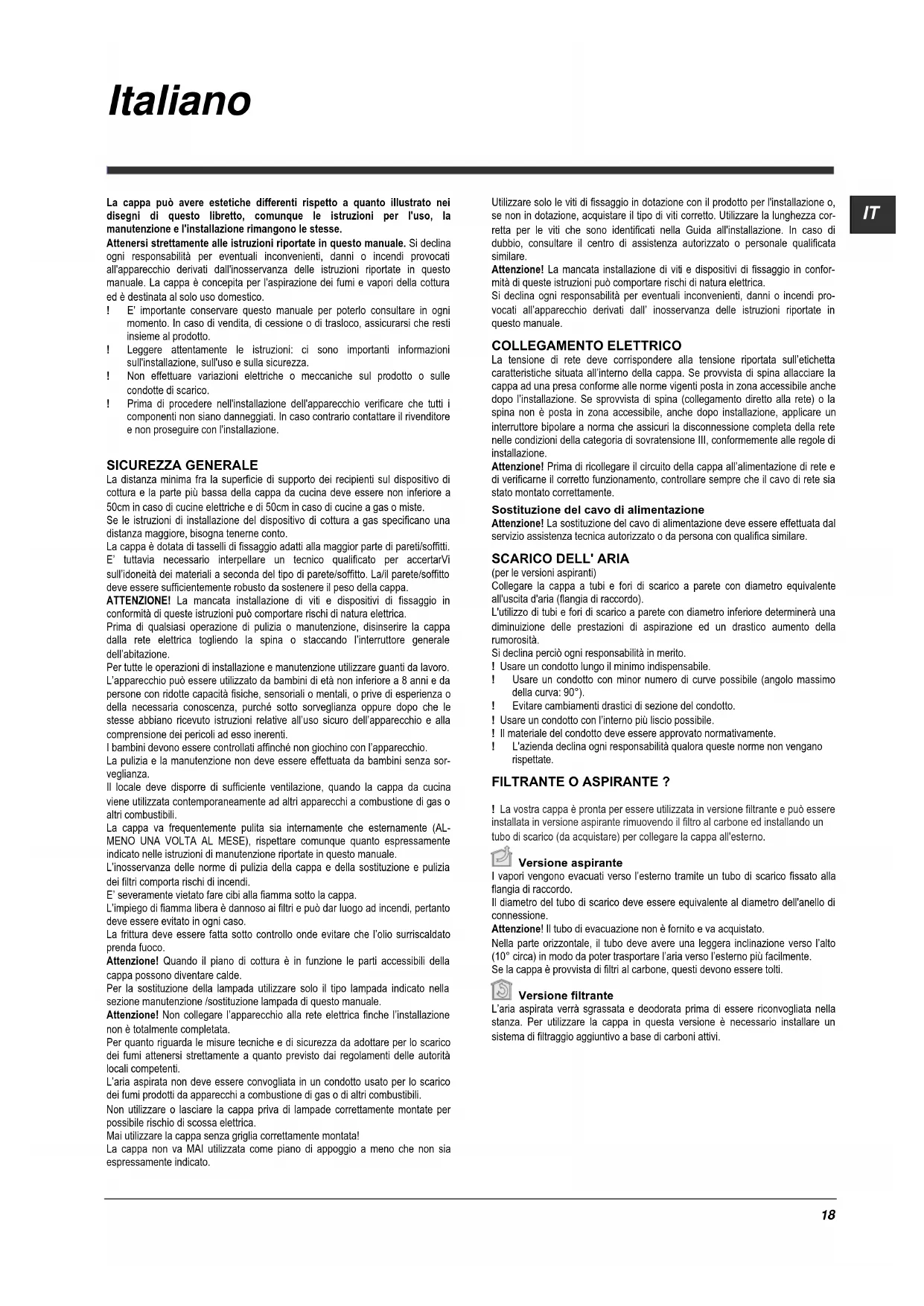 La cappa può avere estetiche differenti rispetto a quanto illustrato nei disegni di questo libretto, comunque le istruzioni per l'uso, la manutenzione e l'installazione rimangono le stesse. Attenersi strettamente alle istruzioni riportate in questo manuale. Si declina ogni responsabilità per eventuali inconvenienti, danni o incendi provocati all'apparecchio derivati dall'inosservanza delle istruzioni riportate in questo manuale. La cappa è concepita per l'aspirazione dei fumi e vapori della cottura ed è destinata al solo uso domestico. ! E' importante conservare questo manuale per poterlo consultare in ogni momento. In caso di vendita, di cessione o di trasloco, assicurarsi che resti insieme al prodotto. ! Leggere attentamente le istruzioni: ci sono importanti informazioni sull'installazione, sull'uso e sulla sicurezza. ! Non effettuare variazioni elettriche o meccaniche sul prodotto o sulle condotte di scarico. ! Prima di procedere nell'installazione dell'apparecchio verificare che tutti i componenti non siano danneggiati. In caso contrario contattare il rivenditore e non proseguire con l'installazione.