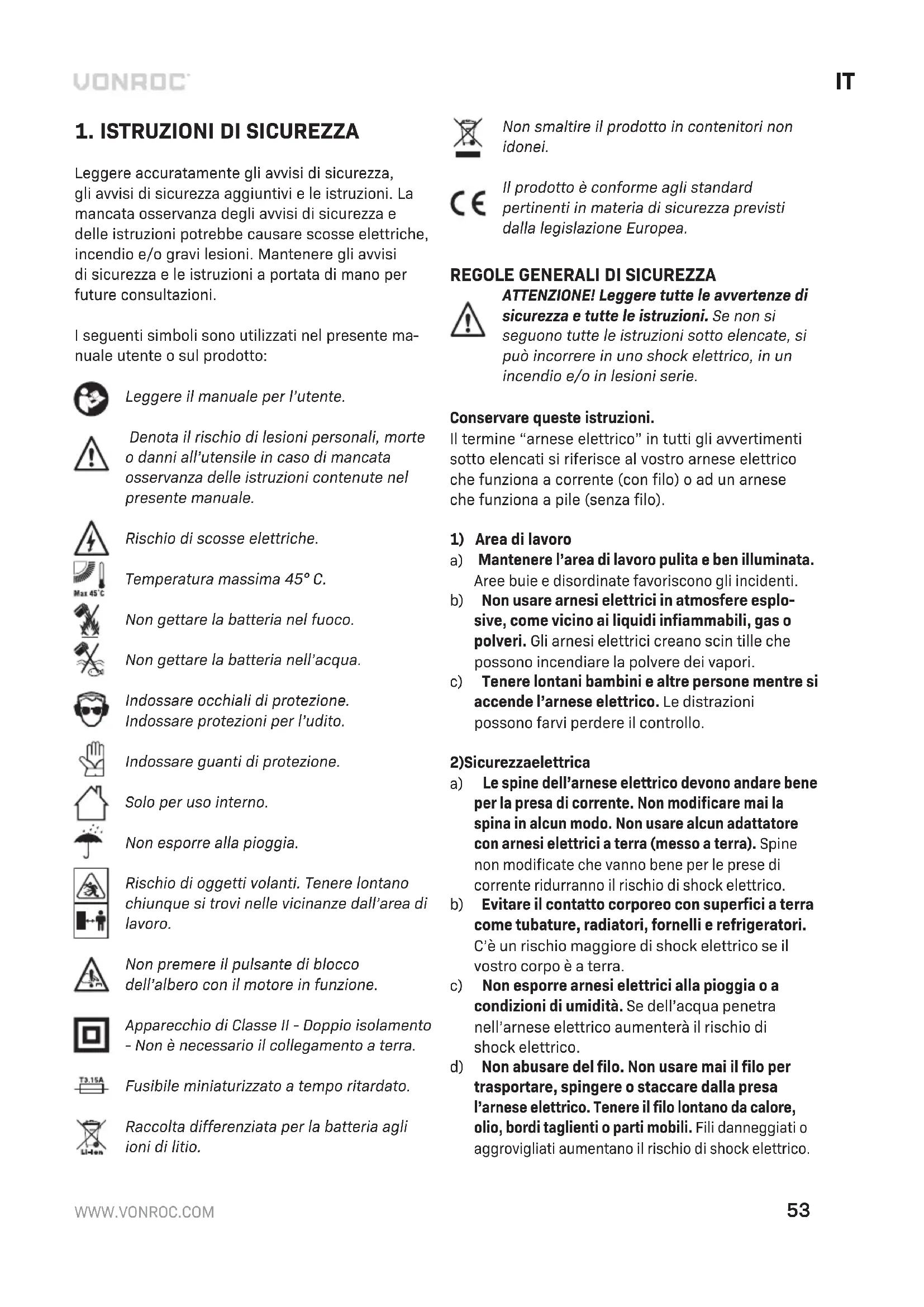 nuale utente o sul prodotto: Leggere il manuale per l’utente. Denota il rischio di lesioni personali, morte o danni all’utensile in caso di mancata osservanza delle istruzioni contenute nel presente manuale. Rischio di scosse elettriche. Temperatura massima 45° C. Non gettare la batteria nel fuoco. Non gettare la batteria nell’acqua. Indossare occhiali di protezione. Indossare protezioni per l’udito. Indossare guanti di protezione. Solo per uso interno. Non esporre alla pioggia. Rischio di oggetti volanti. Tenere lontano chiunque si trovi nelle vicinanze dall’area di lavoro. Non premere il pulsante di blocco dell’albero con il motore in funzione. Apparecchio di Classe II - Doppio isolamento - Non è necessario il collegamento a terra. Fusibile miniaturizzato a tempo ritardato. Raccolta differenziata per la batteria agli ioni di litio. Non smaltire il prodotto in contenitori non idonei. Il prodotto è conforme agli standard pertinenti in materia di sicurezza previsti dalla legislazione Europea.