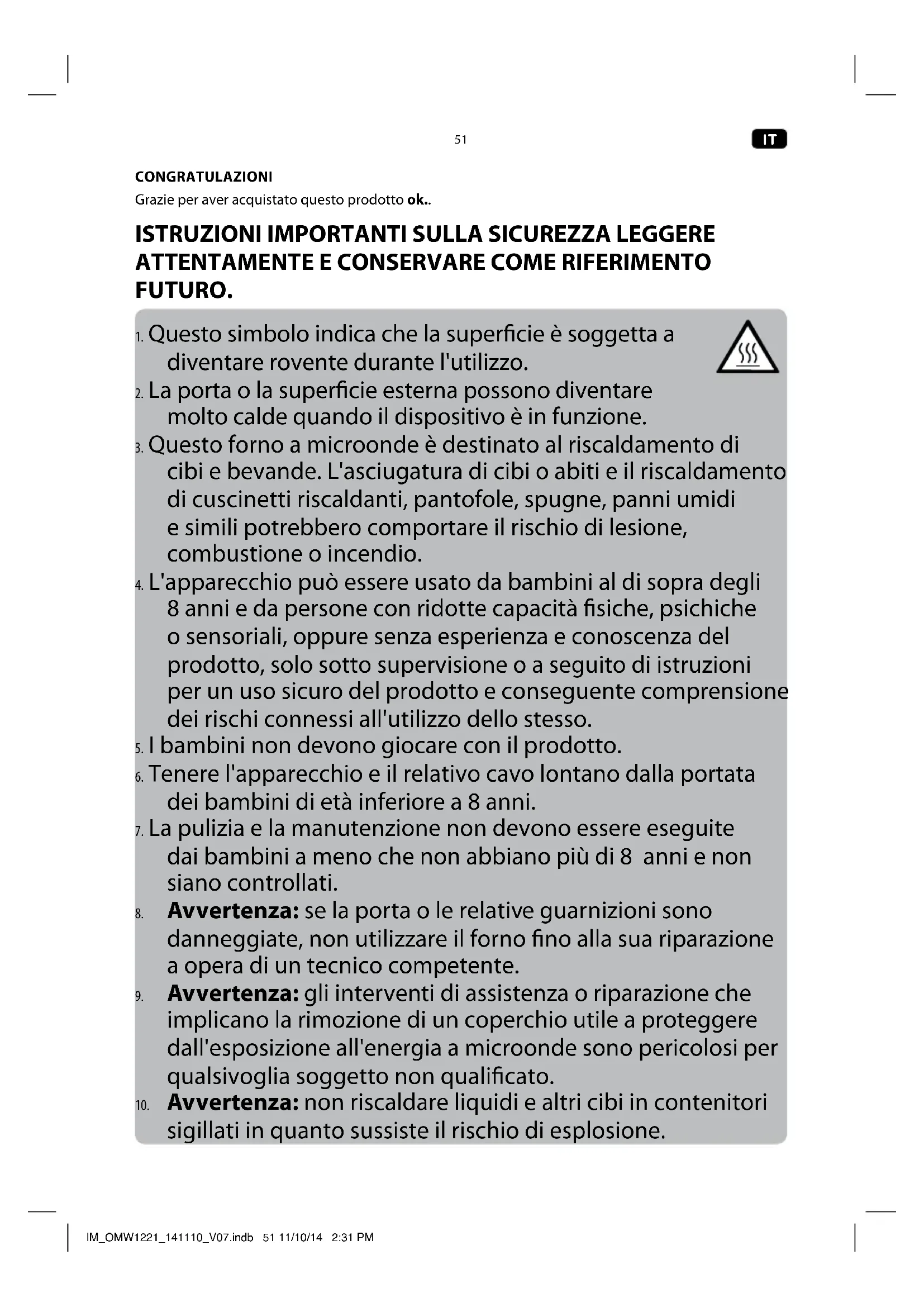 essere riscaldate nei forni a microonde in quanto potrebbero esplodere, anche a riscaldamento ultimato. IM_OMW1221_141110_V07.indb 52 11/10/14 2:31 PM53