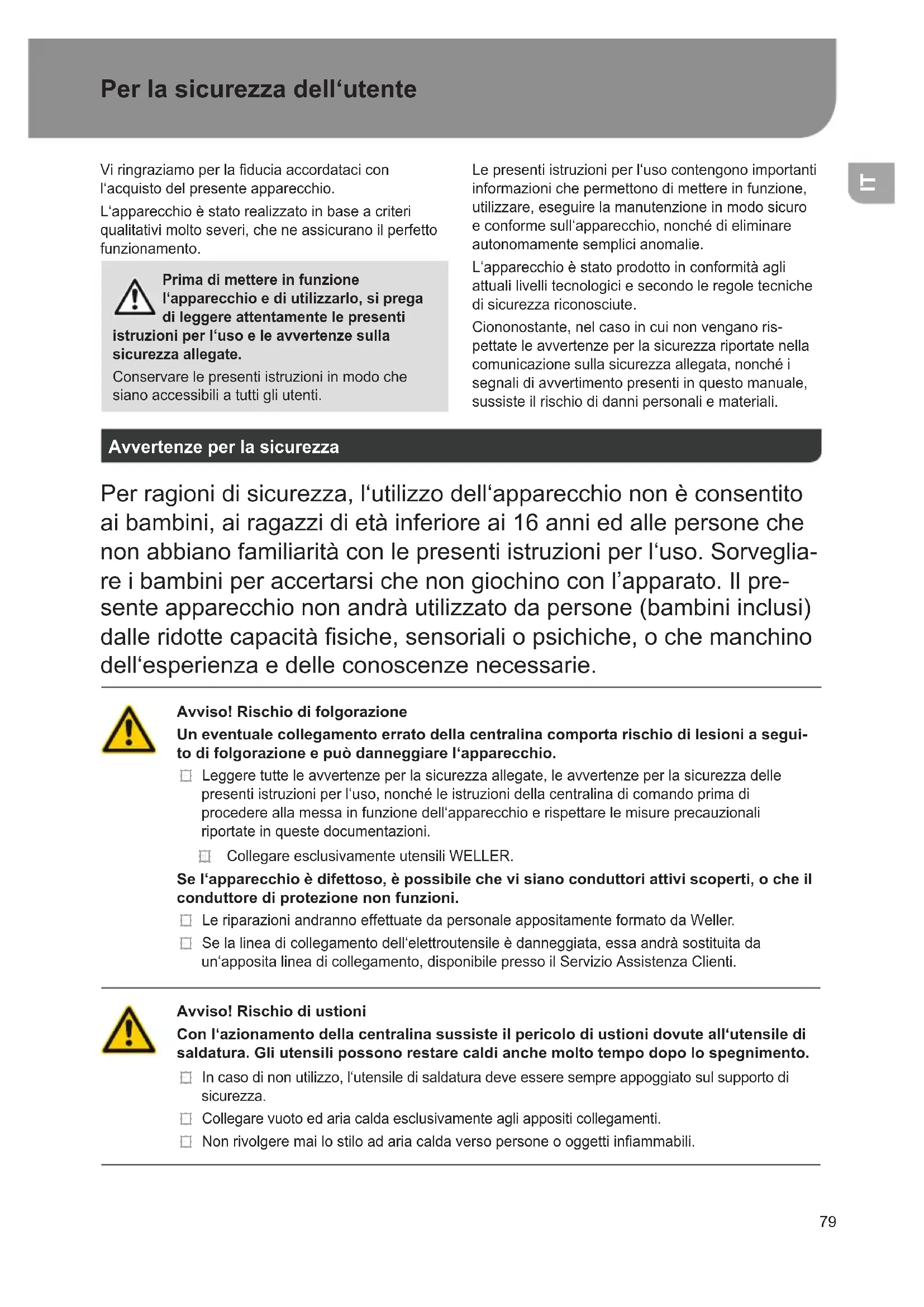 FR77 Messages d‘erreur et élimination des défauts Message / symptôme Cause possible Remède Afchage„---“ L‘outil n‘a pas été détecté Outil défectueux Contrôler le raccordement de l‘outil au niveau de l‘appareil Contrôler l‘outil raccordé Pas de fonctionnement de l‘afchage(Afcheuréteint) Pas de tension de réseau Enclencher l‘interrupteur d‘alimentation Contrôler la tension de réseau Contrôler la protection de l‘appareil Pas de vide au niveau de l‘outil à dessouder Vakuum nicht angeschlossen Buse de dessoudage bouchée Pompe défectueuse Raccorderleexibledevide au raccord de vide Nettoyerlabusededessouda- ge à l‘aide de l‘outil de nettoyage Videinsufsantauniveaude l‘outil à dessouder Cartouchedeltredel‘outilà dessouder pleine Filtre principal plein Remplacer la cartouche de ltredel‘outilàdessouder Remplacerleltreprincipalde la station de soudage pas d‘air au niveau du fer à air chaud Flexible à air pas raccordé Filtre principal plein Raccordezouvériezletuyau d‘air Remplacerleltreprincipalde la station de soudage Caractéristiques Techniques FR78 Symboles Attention! Lirelanoticed‘utilisation! Avant de réaliser tous travaux sur l‘appareil, débrancher toujours la prise. Design et poste de travail confor- mes ESD Compensation de potentiel Signe CE Marque de conformité britannique Protection Transformateur de sécurité Soudage Dessoudage Air chaud Elimination des déchets Lesdéchetsd’équipementsélectriques et électroniques doivent être collectés et éliminer séparément. Retirez les am- poules des appareils avant de les jeter. S‘adresser aux autorités locales ou au détaillant spécialisé en vue de connaî- trel‘emplacementdescentresderecy- clage et des points de collecte. Selon les réglementations locales, les détail- lants peuvent être tenus de reprendre gratuitement les déchets de piles et lesdéchetsd’équipementsélectriques et électroniques. Contribuez à réduire la demande de matières premières en réutilisantetenrecyclantvosdéchets d’équipementsélectriquesetélectro- niques.Lesdéchetsd’équipements électriques et électroniques comportent desmatériauxprécieuxetrecyclables qui peuvent avoir des impacts négatifs surl’environnementetsurvotresanté s’ilsnesontpaséliminésdemanière écologique. Avant de mettre au rebut votre ancien appareil, supprimez les données personnelles qui pourraient s’ytrouver. Desltrescolmatésdoiventêtretraités comme déchets spéciaux. Eliminez les pièces de l‘appareil remplacées, les ltresoulesvieuxappareilsselonles consignesenvigueurdansvotrepays. Garantie Les réclamations pour vices de fabrication expirent 12 mois après la livraison. Ceci ne s‘applique pas aux droits de recours de l‘acquéreur d‘après le §§ 478, 479 du code civil allemand. La garantie que nous accordons n‘est valable que dans la mesure où la garantie de qualité ou de so- liditéafaitl‘objetd‘uneconrmationécriteparnos soinsetmoyennantl‘emploiduterme„Garantie“. La garantie perd toute sa validité en cas d‘utilisation non conforme et de manipulations quelconquesdelapartd‘unpersonnelnonqualié. Sousréservedemodicationstechniques! Pour plus d‘informations, consulter www.weller-tools.com. Caractéristiques Techniques FR79 Per la sicurezza dell‘utente Viringraziamoperladuciaaccordatacicon l‘acquisto del presente apparecchio. L‘apparecchio è stato realizzato in base a criteri qualitativi molto severi, che ne assicurano il perfetto funzionamento. Prima di mettere in funzione l‘apparecchio e di utilizzarlo, si prega di leggere attentamente le presenti istruzioni per l‘uso e le avvertenze sulla sicurezza allegate. Conservare le presenti istruzioni in modo che siano accessibili a tutti gli utenti. Le presenti istruzioni per l‘uso contengono importanti informazioni che permettono di mettere in funzione, utilizzare, eseguire la manutenzione in modo sicuro e conforme sull‘apparecchio, nonché di eliminare autonomamente semplici anomalie. L‘apparecchio è stato prodotto in conformità agli attuali livelli tecnologici e secondo le regole tecniche di sicurezza riconosciute. Ciononostante, nel caso in cui non vengano ris- pettate le avvertenze per la sicurezza riportate nella comunicazione sulla sicurezza allegata, nonché i segnali di avvertimento presenti in questo manuale, sussiste il rischio di danni personali e materiali. Avvertenze per la sicurezza Per ragioni di sicurezza, l‘utilizzo dell‘apparecchio non è consentito ai bambini, ai ragazzi di età inferiore ai 16 anni ed alle persone che non abbiano familiarità con le presenti istruzioni per l‘uso. Sorveglia- reibambiniperaccertarsichenongiochinoconl’apparato.Ilpre- sente apparecchio non andrà utilizzato da persone (bambini inclusi) dalleridottecapacitàsiche,sensorialiopsichiche,ochemanchino dell‘esperienza e delle conoscenze necessarie. Avviso! Rischio di folgorazione Un eventuale collegamento errato della centralina comporta rischio di lesioni a segui- to di folgorazione e può danneggiare l‘apparecchio. Leggere tutte le avvertenze per la sicurezza allegate, le avvertenze per la sicurezza delle presenti istruzioni per l‘uso, nonché le istruzioni della centralina di comando prima di procedere alla messa in funzione dell‘apparecchio e rispettare le misure precauzionali riportate in queste documentazioni. Collegare esclusivamente utensili WELLER. Se l‘apparecchio è difettoso, è possibile che vi siano conduttori attivi scoperti, o che il conduttore di protezione non funzioni. Le riparazioni andranno effettuate da personale appositamente formato da Weller. Se la linea di collegamento dell‘elettroutensile è danneggiata, essa andrà sostituita da un‘apposita linea di collegamento, disponibile presso il Servizio Assistenza Clienti. Avviso! Rischio di ustioni Con l‘azionamento della centralina sussiste il pericolo di ustioni dovute all‘utensile di saldatura.