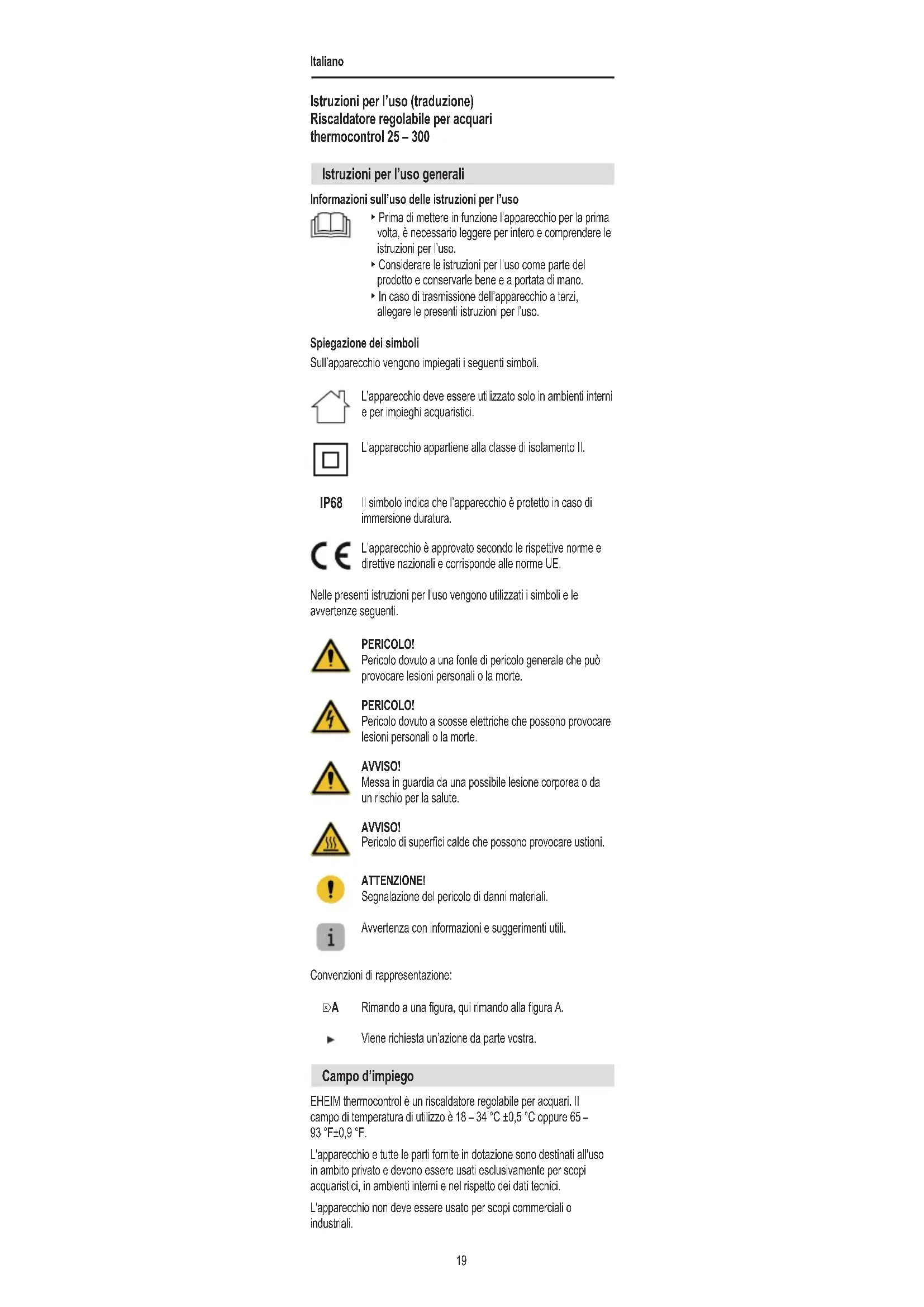 Istruzioni per l’uso (traduzione) Riscaldatore regolabile per acquari thermocontrol 25 – 300 Istruzioni per l’uso generali Informazioni sull’uso delle istruzioni per l’uso ▶ Prima di mettere in funzione l’apparecchio per la prima volta, è necessario leggere per intero e comprendere le istruzioni per l’uso. ▶ Considerare le istruzioni per l’uso come parte del prodotto e conservarle bene e a portata di mano. ▶ In caso di trasmissione dell’apparecchio a terzi, allegare le presenti istruzioni per l’uso. Spiegazione dei simboli Sull’apparecchio vengono impiegati i seguenti simboli. L'apparecchio deve essere utilizzato solo in ambienti interni e per impieghi acquaristici. L’apparecchio appartiene alla classe di isolamento II. IP68 Il simbolo indica che l’apparecchio è protetto in caso di immersione duratura. L’apparecchio è approvato secondo le rispettive norme e direttive nazionali e corrisponde alle norme UE. Nelle presenti istruzioni per l’uso vengono utilizzati i simboli e le avvertenze seguenti. PERICOLO! Pericolo dovuto a una fonte di pericolo generale che può provocare lesioni personali o la morte. PERICOLO! Pericolo dovuto a scosse elettriche che possono provocare lesioni personali o la morte. AVVISO! Messa in guardia da una possibile lesione corporea o da un rischio per la salute. AVVISO! Pericolo di superci calde che possono provocare ustioni. ATTENZIONE! Segnalazione del pericolo di danni materiali. Avvertenza con informazioni e suggerimenti utili. Convenzioni di rappresentazione: Rimando a una gura, qui rimando alla gura A. Viene richiesta un’azione da parte vostra.