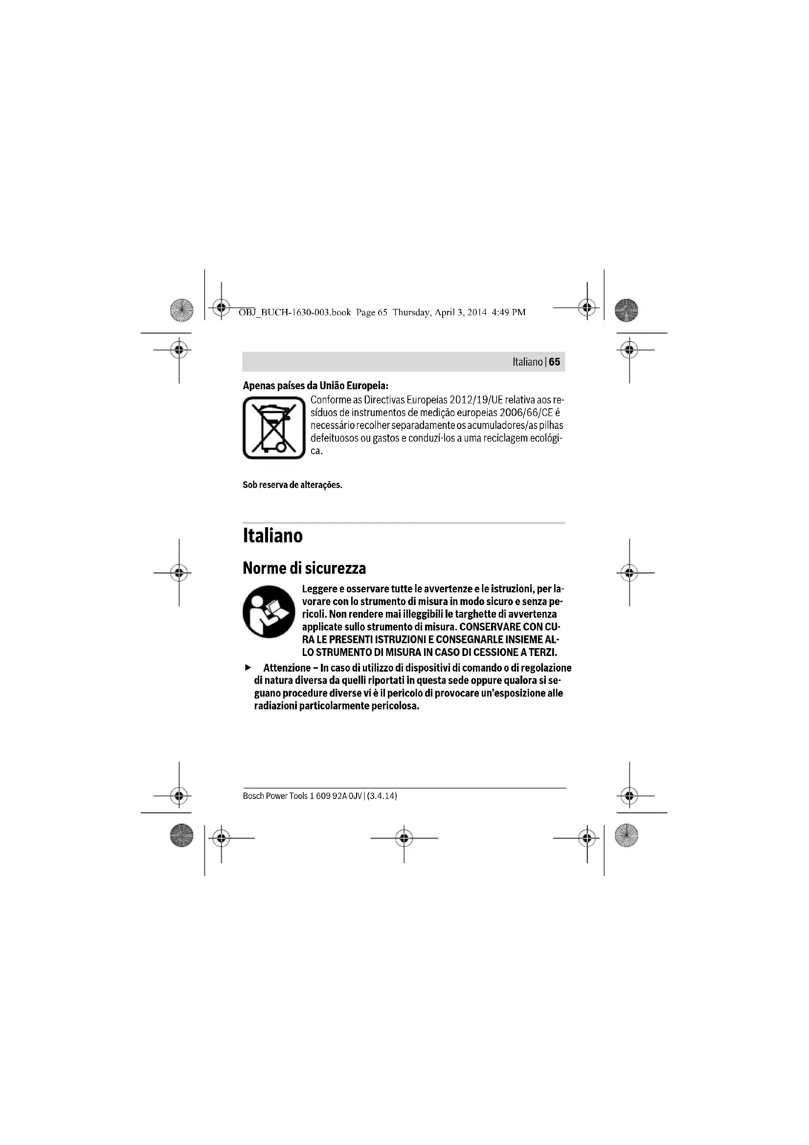 (p.es. esposizione diretta ai raggi solari). Per un’inequivocabile identificazione del Vostro strumento di misura fate riferimento al nume- ro di serie 15 riportato sulla targhetta di costruzione. OBJ_BUCH-1630-003.book Page 68 Thursday, April 3, 2014 4:49 PMItaliano | 69 Bosch Power Tools 1 609 92A 0JV | (3.4.14) Montaggio Applicazione/sostituzione delle batterie Per il funzionamento dello strumento di misura si consiglia l’impiego dei batterie alcaline al manganese. Per aprire il coperchio del vano batterie 6 premere il bloccaggio 5 in direzione della freccia e togliere il coperchio del vano batterie. Inserire le batterie fornite in dotazione, facendo attenzione alla corretta polarizzazione, conformemente all’illustrazione nel vano batterie. Tempo di autolivellamento tipico