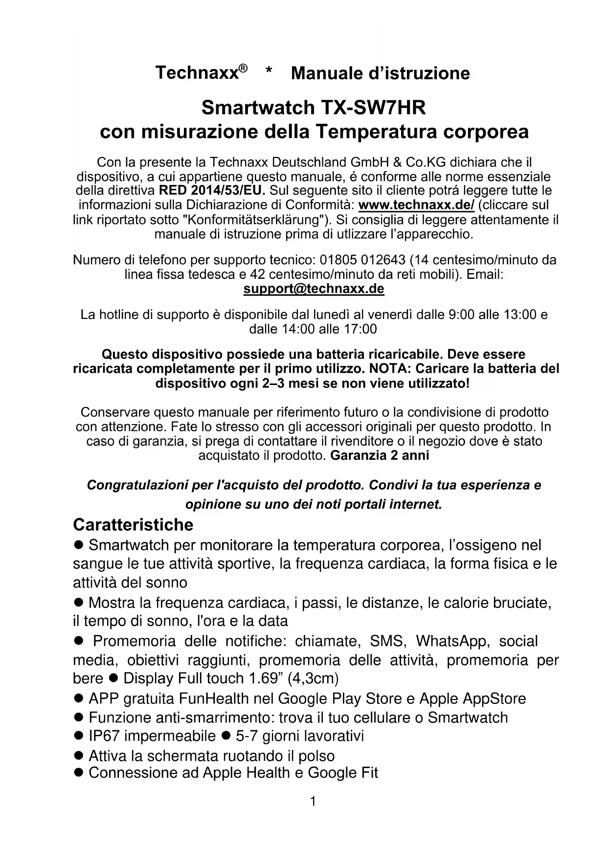 Numero di Telefono per supporto technique: 01805 012643 (14 centesimo/minute da linea fissa tedesa e 42 centesimo/minuto da reti mobili). Email: support@technaxx.de