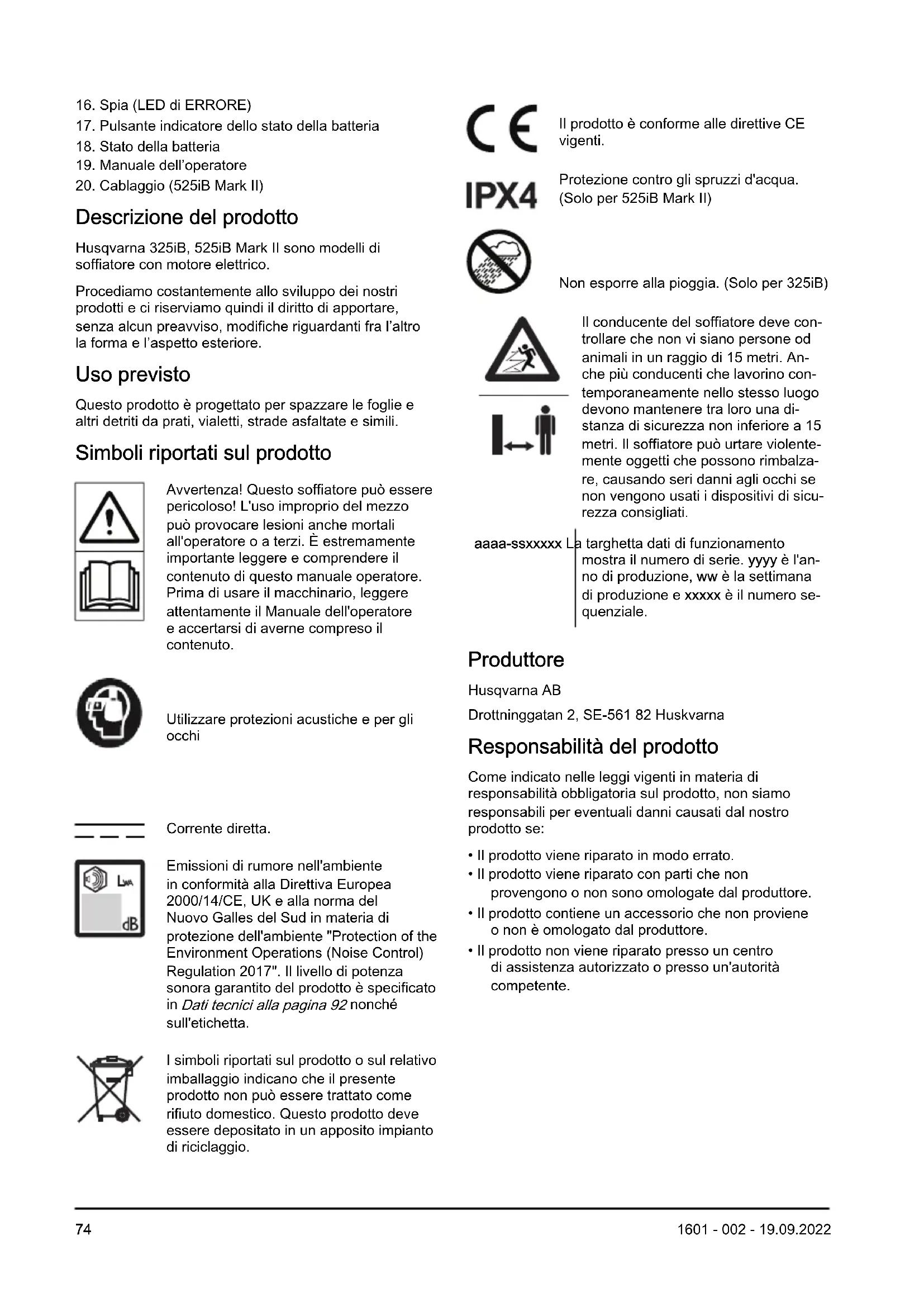 Dati tecnici alla pagina 92 nonché sull'etichetta. I simboli riportati sul prodotto o sul relativo imballaggio indicano che il presente prodotto non può essere trattato come rifiuto domestico. Questo prodotto deve essere depositato in un apposito impianto di riciclaggio. Il prodotto è conforme alle direttive CE vigenti. Protezione contro gli spruzzi d'acqua. (Solo per 525iB Mark II) Non esporre alla pioggia. (Solo per 325iB) Il conducente del soffiatore deve con- trollare che non vi siano persone od animali in un raggio di 15 metri. An- che più conducenti che lavorino con- temporaneamente nello stesso luogo devono mantenere tra loro una di- stanza di sicurezza non inferiore a 15 metri. Il soffiatore può urtare violente- mente oggetti che possono rimbalza- re, causando seri danni agli occhi se non vengono usati i dispositivi di sicu- rezza consigliati. aaaa-ssxxxxx La targhetta dati di funzionamento mostra il numero di serie. yyyy è l'an- no di produzione, ww è la settimana di produzione e xxxxx è il numero se- quenziale. Produttore Husqvarna AB Drottninggatan 2, SE-561 82 Huskvarna Responsabilità del prodotto Come indicato nelle leggi vigenti in materia di responsabilità obbligatoria sul prodotto, non siamo responsabili per eventuali danni causati dal nostro prodotto se: