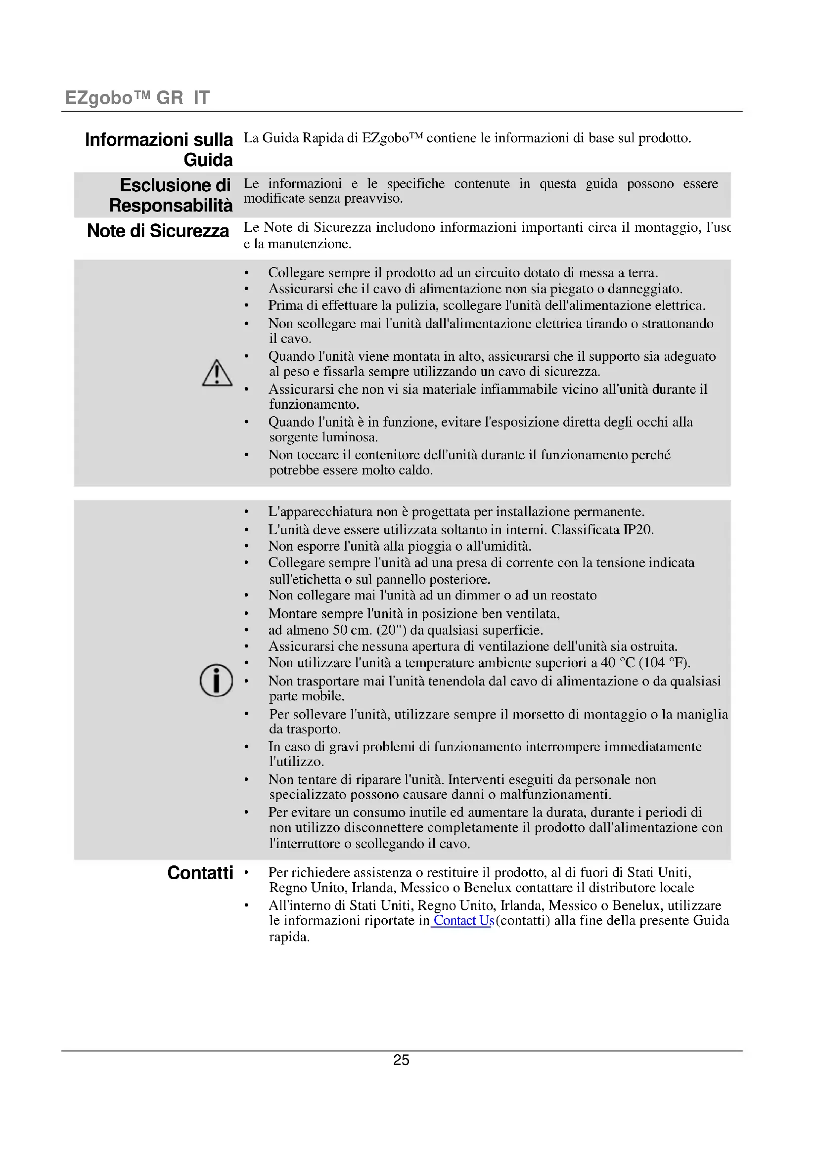 - All'interno di Stati Uniti, Regno Unito, Irlanda, Messico o Benelux, utilizzare le informazioni riportate in Contact Us (contatti) alla fine della presente Guida rapida.EZgobo™ GR IT