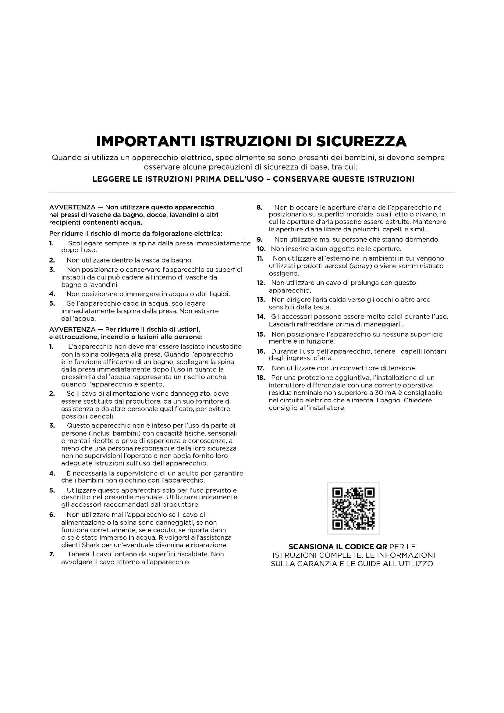 3RISOLUZIONE DEI PROBLEMI E CODICI DI ERRORE MANUTENZIONE / PULIZIA Riduzione del flusso d’aria, surriscaldamento Variazioni del flusso d’aria, surriscaldamento, ostruzioni del flusso d’aria, surriscaldamento e/o formazioni visibili sul retro dell’unità indicano che l’unità deve essere pulita. Raccomandiamo l’uso della spazzola di manutenzione in dotazione con il prodotto per una pulizia ottimale del retro dell’unità. Nota: la pulizia e la manutenzione non devono essere eettuate da bambini senza la supervisione di un adulto. SURRISCALDAMENTO L’asciugacapelli si surriscalda o si spegne. L’unità è provvista di un termostato di protezione del motore. Se per qualche ragione l’asciugacapelli si surriscalda, il termostato spegne automaticamente l’unità. Per evitare il verificarsi di questa interruzione, scollegare l’asciugacapelli dalla presa e lasciarlo rareddare. Oppure utilizzare il pulsante “colpo freddo” durante l’uso. Il surriscaldamento può essere il risultato di un funzionamento eccessivamente prolungato o può indicare un’ostruzione o una formazione di polvere. Raccomandiamo di utilizzare la spazzola di manutenzione in dotazione con il prodotto per una pulizia ottimale del retro dell’unità. Se il surriscaldamento continua a verificarsi, rivolgersi all’assistenza clienti (numero verde 800 961655). Codice di errore surriscaldamento Se si riscontra un codice di errore diverso, scansionare il codice QR per ulteriori informazioni sulla risoluzione dei problemi, oppure rivolgersi all’assistenza clienti (numero verde 800 961655). ITALIANOAVISO – Não utilize este aparelho perto de banheiras, chuveiros, bacias ou outros recipientes que contenham água. Para reduzir o risco de morte por choque elétrico: