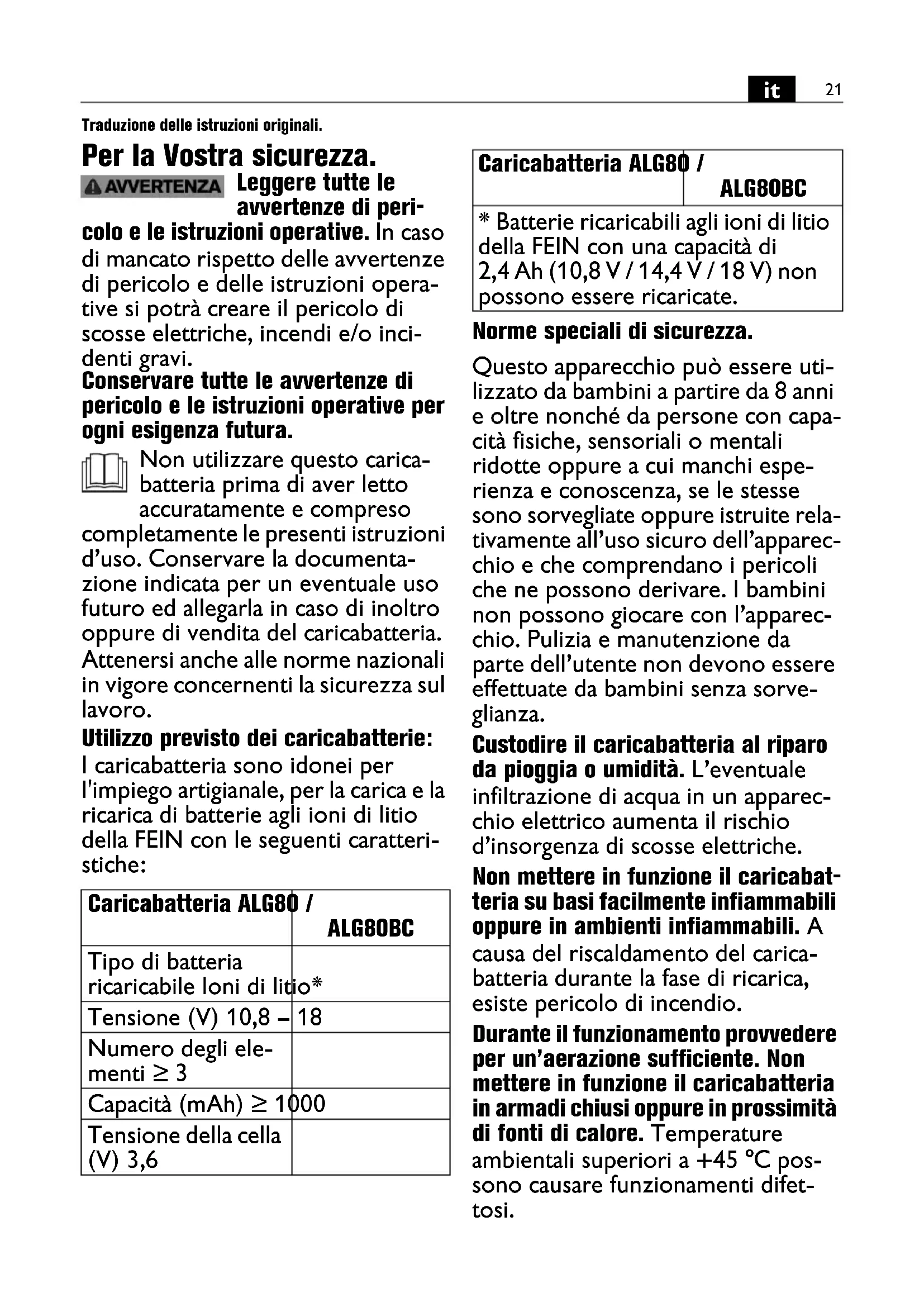 Ricaricare esclusivamente batterie ricaricabili originali FEIN intatte adatte per l'elettroutensile. In caso di ricarica di batterie non corrette, danneggiate riparate oppure rigenerate, di imitazioni e prodotti di terzi, esiste il pericolo di incendio e/o di esplosione.