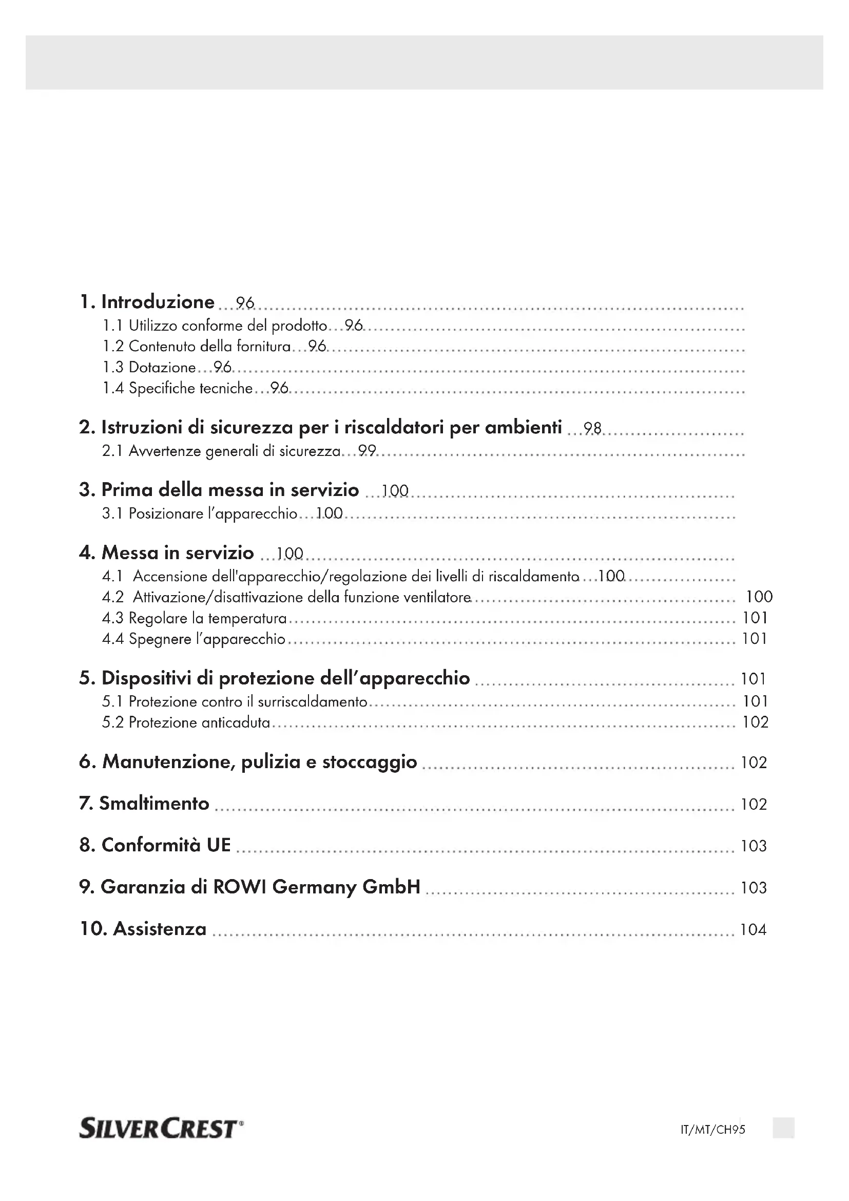 si trova sul- lo “0” e il cavo di alimentazione è staccato dalla presa. Lasciare che l’apparecchio si raffreddi per almeno 10 minuti. Controllare gli ingressi e le uscite dell’aria ed eliminare la causa del surriscaldamento prima di mettere nuovamente in funzione l’apparec- chio. ATTENZIONE! Se l’apparecchio si è surriscaldato in genere c’è un motivo! Può comportare pericolo d’incendio! Si prega di controllare che il dispositivo sia in grado di rilasciare il calore adeguatamente: il dispositivo è coperto o si trova troppo vicino ad un muro o ad un altro ostacolo? Gli ingressi e le uscite dell’aria sono liberi sia sul lato anteriore che posteriore? Il ventilatore è bloccato?IT/MT/CH102 Eliminare, se possibile, il problema oppure contattare il servizio di assistenza clienti (vedi capitolo “Assistenza”). Anche se non si trova l’origine del surriscaldamento, ma la protezione contro il surriscaldamento si innesca di nuovo, è necessario spegnere il dispositivo e contattare il servizio di assistenza clienti (vedi capitolo “Assistenza”).