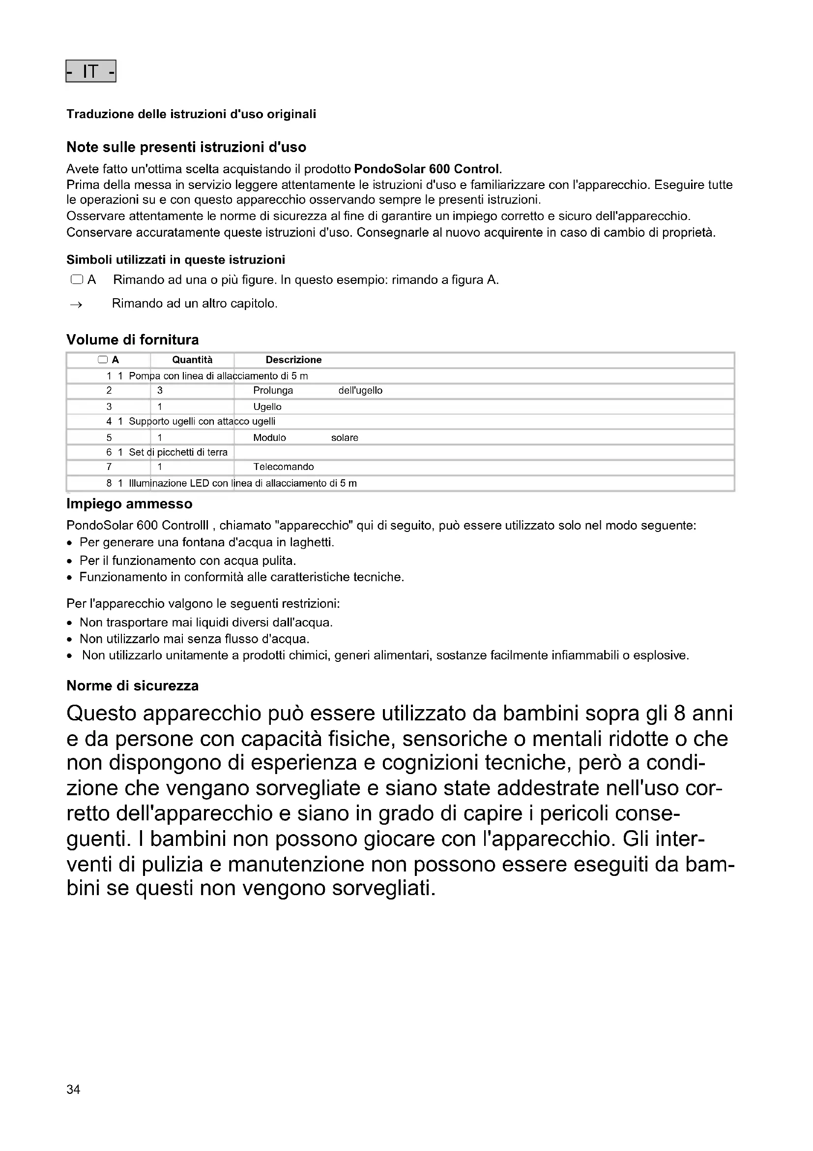 Note sulle presenti istruzioni d'uso Avete fatto un'ottima scelta acquistando il prodotto PondoSolar 600 Control. Prima della messa in servizio leggere attentamente le istruzioni d'uso e familiarizzare con l'apparecchio. Eseguire tutte le operazioni su e con questo apparecchio osservando sempre le presenti istruzioni. Osservare attentamente le norme di sicurezza al fine di garantire un impiego corretto e sicuro dell'apparecchio. Conservare accuratamente queste istruzioni d'uso. Consegnarle al nuovo acquirente in caso di cambio di proprietà.