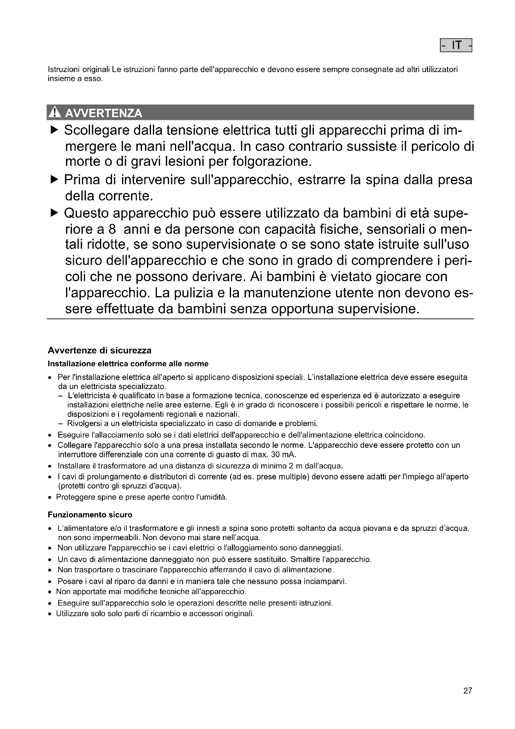 AVVI SO AVVERTENZA Scollegare dalla tensione elettrica tutti gli apparecchi prima di im- mergere le mani nell'acqua. In caso contrario sussiste il pericolo di morte o di gravi lesioni per folgorazione. Prima di intervenire sull'apparecchio, estrarre la spina dalla presa della corrente. Questo apparecchio può essere utilizzato da bambini di età supe- riore a 8 anni e da persone con capacità fisiche, sensoriali o men- tali ridotte, se sono supervisionate o se sono state istruite sull'uso sicuro dell'apparecchio e che sono in grado di comprendere i peri- coli che ne possono derivare. Ai bambini è vietato giocare con l'apparecchio. La pulizia e la manutenzione utente non devono es- sere effettuate da bambini senza opportuna supervisione.