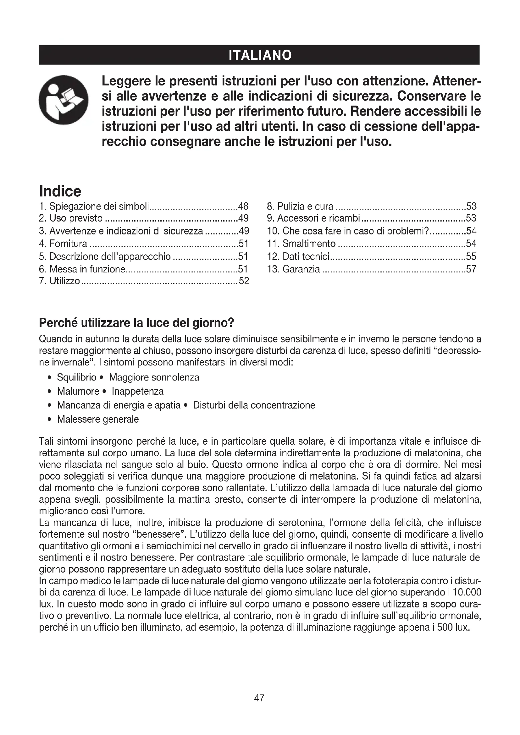 recchio consegnare anche le istruzioni per l'uso. Perché utilizzare la luce del giorno? Quando in autunno la durata della luce solare diminuisce sensibilmente e in inverno le persone tendono a restare maggiormente al chiuso, possono insorgere disturbi da carenza di luce, spesso definiti “depressio