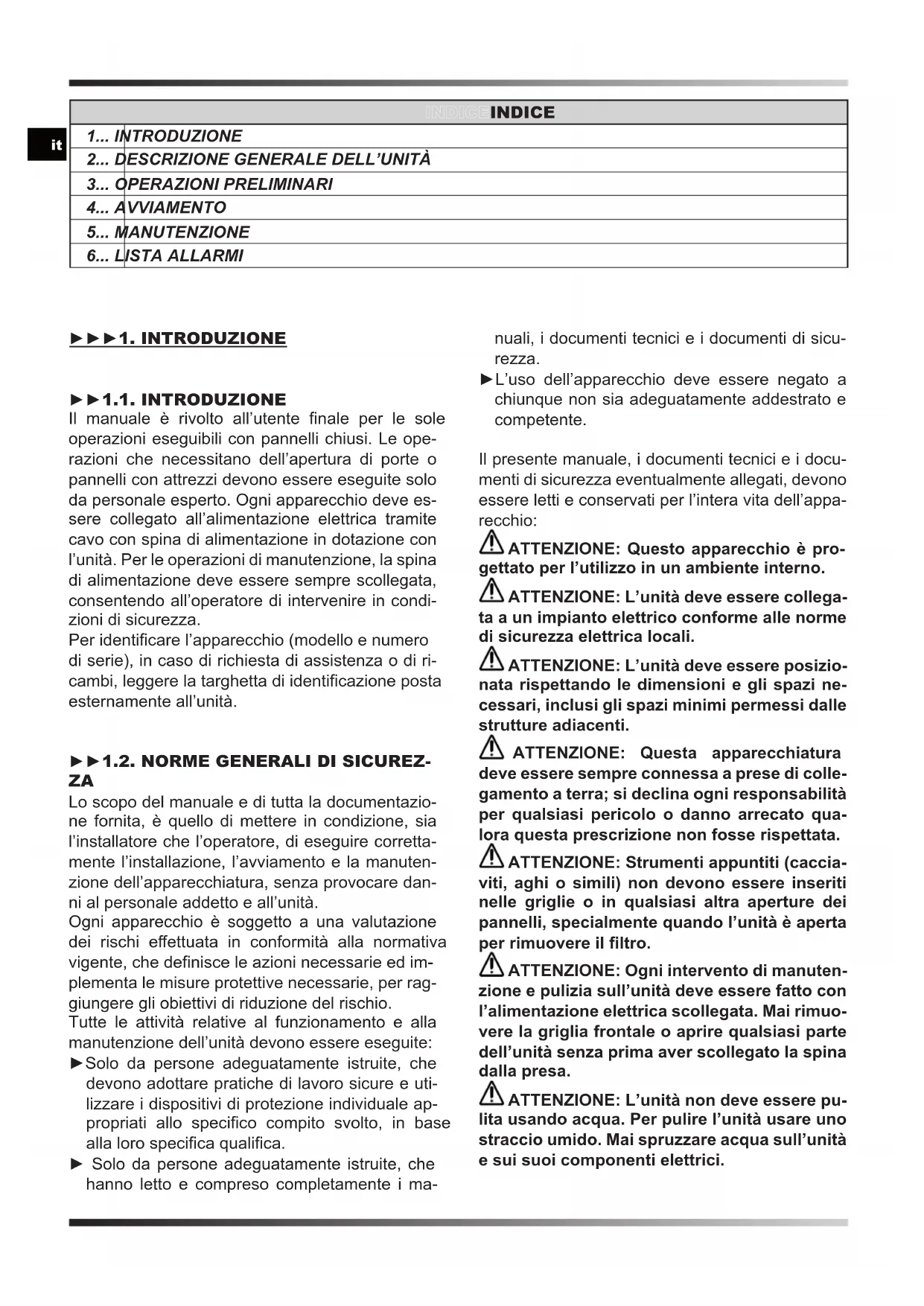 ►►►1. INTRODUZIONE ►►1.1. INTRODUZIONE Il manuale è rivolto all’utente nale per le sole operazioni eseguibili con pannelli chiusi. Le ope- razioni che necessitano dell’apertura di porte o pannelli con attrezzi devono essere eseguite solo da personale esperto. Ogni apparecchio deve es- sere collegato all’alimentazione elettrica tramite cavo con spina di alimentazione in dotazione con l’unità. Per le operazioni di manutenzione, la spina di alimentazione deve essere sempre scollegata, consentendo all’operatore di intervenire in condi- zioni di sicurezza. Per identicare l’apparecchio (modello e numero di serie), in caso di richiesta di assistenza o di ri- cambi, leggere la targhetta di identicazione posta esternamente all’unità.