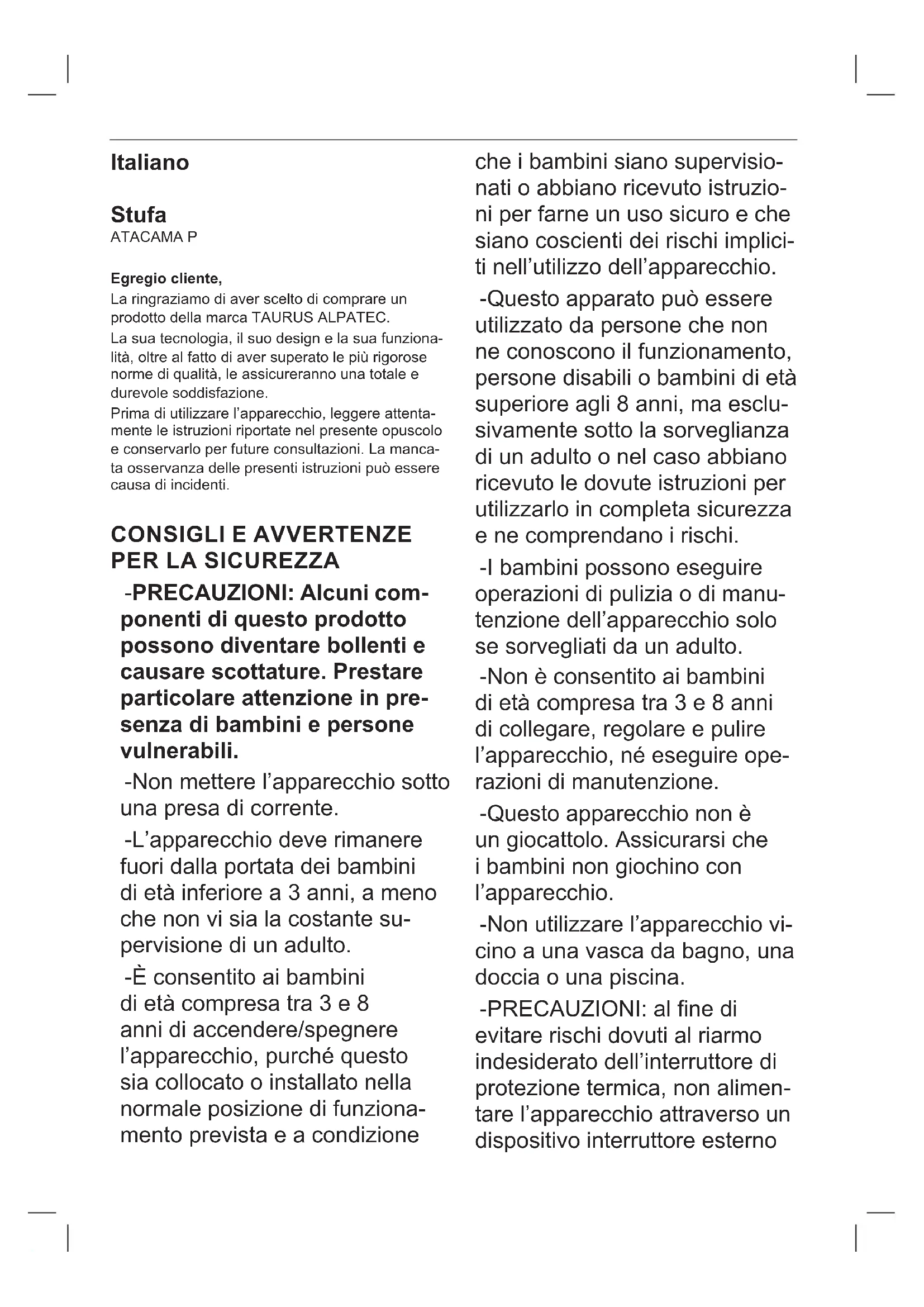 N/A “Tipo di potenza termica, solo per gli apparecchi per il riscaldamento d’ambiente locale elettrici ad accu- mulo Controllo manuale del carico termico, con termostato integrato N/A Controllo manuale del carico termico con riscontro della temperatura ambiente e/o esterna N/A Controllo elettronico del carico termico con riscontro della temperatura ambiente e/o esterna N/A Potenza termica assistita da ventilatore N/A Tipo di controllo del potere calorico / della temperatura interna Potere calorico di un solo livello, senza controllo della temperatura interna No Due o più livelli manuali, senza controllo della temperatura interna No Con controllo della temperatura interna mediante termostato meccanico Si Con controllo elettronico della temperatura interna No Controllo elettronico della temperatura interna e timer giornaliero No Controllo elettronico della temperatura interna e timer settimanale No Altre opzioni di controllo Controllo della temperatura interna con rilevamento di presenza No Controllo temperatura interna con rilevamento di nestre aperte No Con opzione di controllo a distanza No Con controllo di avvio adattabile No Con limitazione del tempo di funzionamento No Con sensore di lampada a luce nera No Informazioni di contatto “ELECTRODOMÉSTICOS TAURUS, S.L. Avda. Barcelona S/N, 25790 Oliana, Lleida, Spain”Português Aquecedor ATACAMA P Caro cliente: Obrigado por ter adquirido um produto da marca TAURUS ALPATEC. A sua tecnologia, design e funcionalidade, aliados às mais rigorosas normas de qualidade, garantir- lhe-ão uma total satisfação durante muito tempo. Leia atentamente este manual de instruções an- tes de ligar o aparelho e guarde-o para consultas futuras. A não observância e cumprimento destas instruções pode resultar em acidente.
