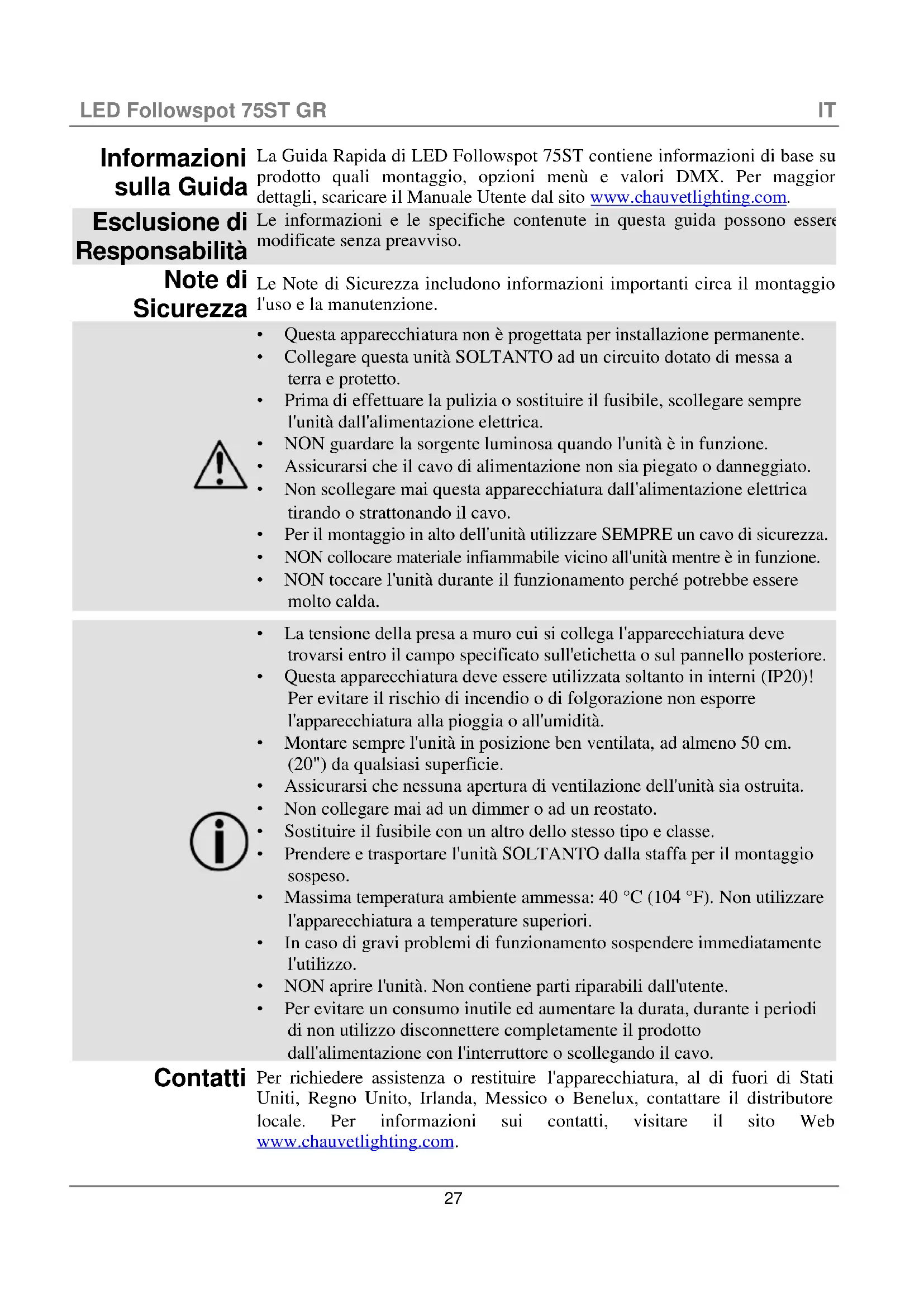 - Per evitare un consumo inutile ed aumentare la durata, durante i periodi di non utilizzo disconnettere completamente il prodotto dall'alimentazione con l'interruttore o scollegando il cavo. Contatti Per richiedere assistenza o restituire l'apparecchiatura, al di fuori di Stati Uniti, Regno Unito, Irlanda, Messico o Benelux , contattare il distributore locale. Per informazioni sui contatti, visitare il sito Web www.chauvetlighting.com.LED Followspot 75ST GR IT