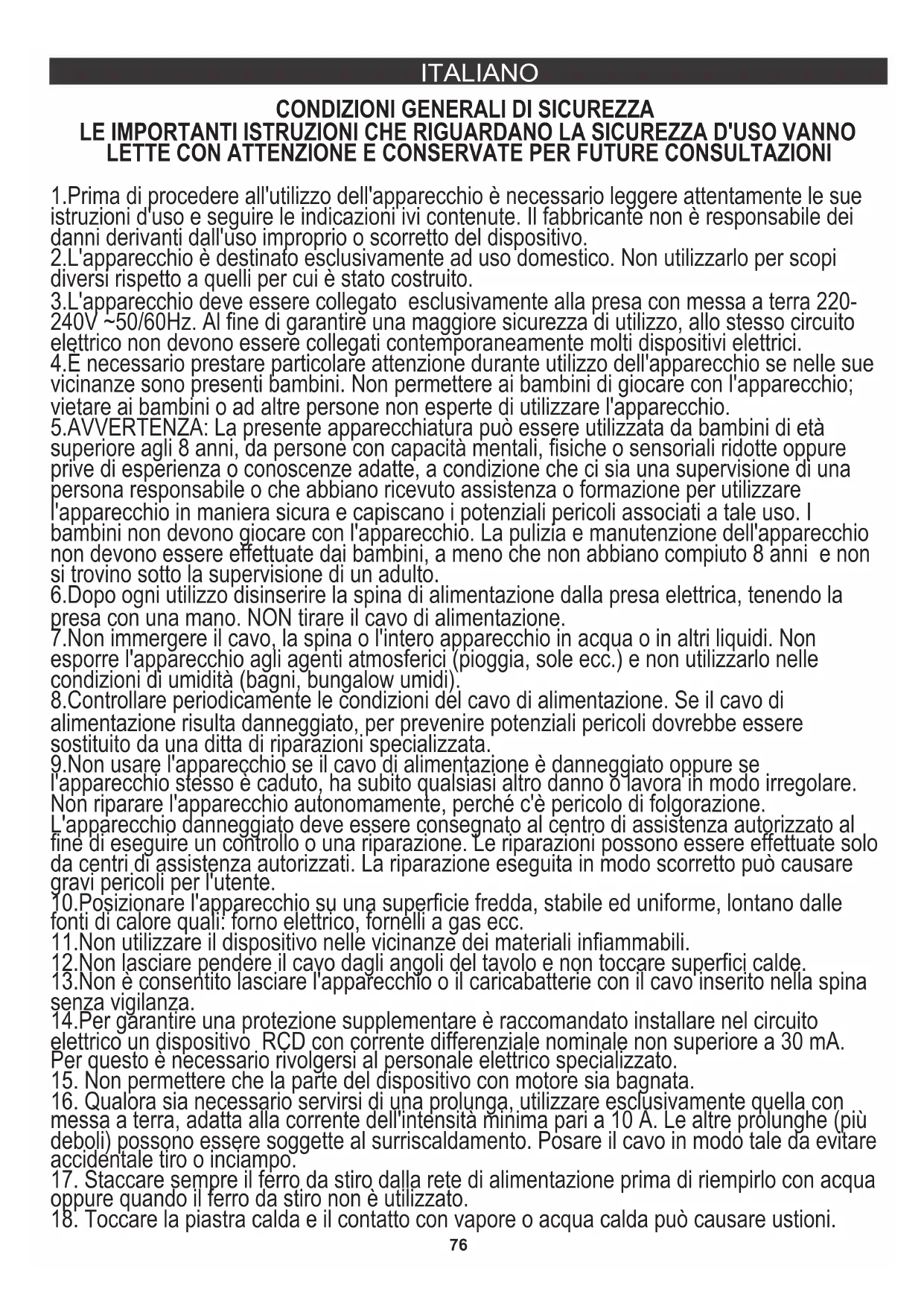 TEKNISK DATA: Spänning: 220-240V ~50/60Hz Max effekt: 3400W Effektnom.: 2600W 75istruzioni d'uso e seguire le indicazioni ivi contenute. Il fabbricante non è responsabile dei danni derivanti dall'uso improprio o scorretto del dispositivo. 2.L'apparecchio è destinato esclusivamente ad uso domestico. Non utilizzarlo per scopi diversi rispetto a quelli per cui è stato costruito. 5.AVVERTENZA: La presente apparecchiatura può essere utilizzata da bambini di età superiore agli 8 anni, da persone con capacità mentali, fisiche o sensoriali ridotte oppure prive di esperienza o conoscenze adatte, a condizione che ci sia una supervisione di una persona responsabile o che abbiano ricevuto assistenza o formazione per utilizzare l'apparecchio in maniera sicura e capiscano i potenziali pericoli associati a tale uso. I bambini non devono giocare con l'apparecchio. La pulizia e manutenzione dell'apparecchio non devono essere effettuate dai bambini, a meno che non abbiano compiuto 8 anni e non si trovino sotto la supervisione di un adulto. 6.Dopo ogni utilizzo disinserire la spina di alimentazione dalla presa elettrica, tenendo la presa con una mano. NON tirare il cavo di alimentazione. 10.Posizionare l'apparecchio su una superficie fredda, stabile ed uniforme, lontano dalle fonti di calore quali: forno elettrico, fornelli a gas ecc.
