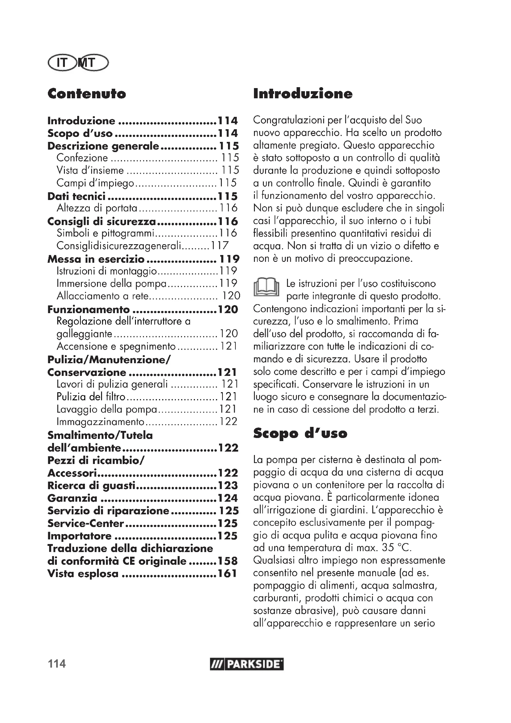 La protección del motor de- sconecta la bomba por dema- siada suciedad del agua Retirar el conector y limpiar. La temperatura del agua es de- masiado alta, la protección del motor apaga el aparato ¡Prestar atención a la temperatura máxima del agua de 35 ºC!114 IT MT Contenuto Introduzione ............................114 Scopo d’uso .............................114 Descrizione generale ................ 115 Confezione .................................. 115 Vista d’insieme ............................. 115 Campi d’impiego .......................... 115 Dati tecnici ...............................115 Altezza di portata ......................... 116 Consigli di sicurezza .................116 Simboli e pittogrammi .................... 116 Consigli di sicurezza generali......... 117 Messa in esercizio .................... 119 Istruzioni di montaggio ....................119 Immersione della pompa ................ 119 Allacciamento a rete...................... 120 Funzionamento ........................120 Regolazione dell‘interruttore a galleggiante ................................. 120 Accensione e spegnimento ............. 121 Pulizia/Manutenzione/ Conservazione .........................121 Lavori di pulizia generali ............... 121 Pulizia del ltro ............................. 121 Lavaggio della pompa ................... 121 Immagazzinamento ....................... 122 Smaltimento/Tutela dell’ambiente ...........................122 Pezzi di ricambio/ Accessori ..................................122 Ricerca di guasti .......................123 Garanzia .................................124 Servizio di riparazione ............. 125 Service-Center ..........................125 Importatore .............................125 Introduzione Congratulazioni per l’acquisto del Suo nuovo apparecchio. Ha scelto un prodotto altamente pregiato. Questo apparecchio è stato sottoposto a un controllo di qualità durante la produzione e quindi sottoposto a un controllo nale. Quindi è garantito il funzionamento del vostro apparecchio. Non si può dunque escludere che in singoli casi l‘apparecchio, il suo interno o i tubi essibili presentino quantitativi residui di acqua. Non si tratta di un vizio o difetto e non è un motivo di preoccupazione. Le istruzioni per l’uso costituiscono parte integrante di questo prodotto. Contengono indicazioni importanti per la si- curezza, l’uso e lo smaltimento. Prima dell’uso del prodotto, si raccomanda di fa- miliarizzare con tutte le indicazioni di co- mando e di sicurezza. Usare il prodotto solo come descritto e per i campi d’impiego specicati. Conservare le istruzioni in un luogo sicuro e consegnare la documentazio- ne in caso di cessione del prodotto a terzi. Scopo d’uso La pompa per cisterna è destinata al pom- paggio di acqua da una cisterna di acqua piovana o un contenitore per la raccolta di acqua piovana. È particolarmente idonea all‘irrigazione di giardini. L‘apparecchio è concepito esclusivamente per il pompag- gio di acqua pulita e acqua piovana no ad una temperatura di max. 35 °C. Qualsiasi altro impiego non espressamente consentito nel presente manuale (ad es. pompaggio di alimenti, acqua salmastra, carburanti, prodotti chimici o acqua con sostanze abrasive), può causare danni all’apparecchio e rappresentare un serio Traduzione della dichiarazione di conformità CE originale ........158 Vista esplosa ...........................161115 IT MT pericolo per l’utilizzatore. L’apparecchio non è adatto per un uso pro- lungato. Il funzionamento continuo riduce la durata e invalida la garanzia. Questo apparecchio non è adatto per l’uso industriale. In caso di un impiego per uso industriale decade la garanzia. L’utilizza- tore è responsabile per incidenti o danni ad altre persone o alla proprietà delle medesime. Il fabbricante declina ogni responsabilità per danni causati da un uso conforme alle disposizioni o da un comando errato. Descrizione generale Le immagini dei principali componenti funzionali sono riportate nelle pagine apribili. Confezione Rimuovere l’apparecchio dalla confezione e controllare se è completo: - Pompa per cisterna - 2 tubi di alluminio - Tubo essibile - 5 anelli di tenuta - Supporto tubo - Gancio in plastica con vite e dado a galletto - Pezzo di collegamento - Adattatore - Istruzioni per l’uso Vista d’insieme Pompa 1 Interruttore a galleggiante 2 Manico 3 Alloggiamento della pompa 4 Base di aspirazione 5 Cavo 6 Fissaggio Accessori 7 Gancio in plastica 8 Dado a galletto 9 Vite 10 Pezzo di collegamento 11 Adattatore 12 Supporto tubo 13 Anello di tenuta piccolo 14 Anello di tenuta medio 15 Anello di tenuta grande 16 Rubinetto di arresto 17 Tubo essibile 18 Manicotti lettati 19 Tubo di alluminio inferiore/superiore 20 Manicotti lettati 21 Raccordo di mandata 22 Copertura ltro 23 Filtro Campi d’impiego La pompa è provvista di un interruttore a galleggiante che spegne o accende auto- maticamente la pompa in base al livello dell’acqua. In caso di sovraccarico la pompa viene spenta dall‘interruttore termico di sicurezza integrato. Dopo il raffreddamento il motore si riavvia da solo. Un gancio in plastica di altezza regolabile applicato al tubo di alluminio può essere agganciato alla cisterna permettendo di prelevare comodamente l‘acqua tramite un essibile. Il rubinetto di arresto funge da rubinetto dell‘acqua. Dati tecnici Pompa per cisterna ...... PRP 400 B1 Tensione di ingresso (U) .... 230 V~; 50 Hz Potenza di presa (P) ...................... 400 W Classe di protezione ............................... I Tipo di protezione ............................IPX8116 IT MT Portata massima (Qmax) ............. 4000 l/h Altezza massima di portata (Hmax) ...13 mMassima profondità di immersione ......7 mCorpi estranei dimensione mass. ......3 mmTemperatura massima dell’acqua(Tmax) ..........................................35 °CConduttura rete ...............................10 m Altezza di porta