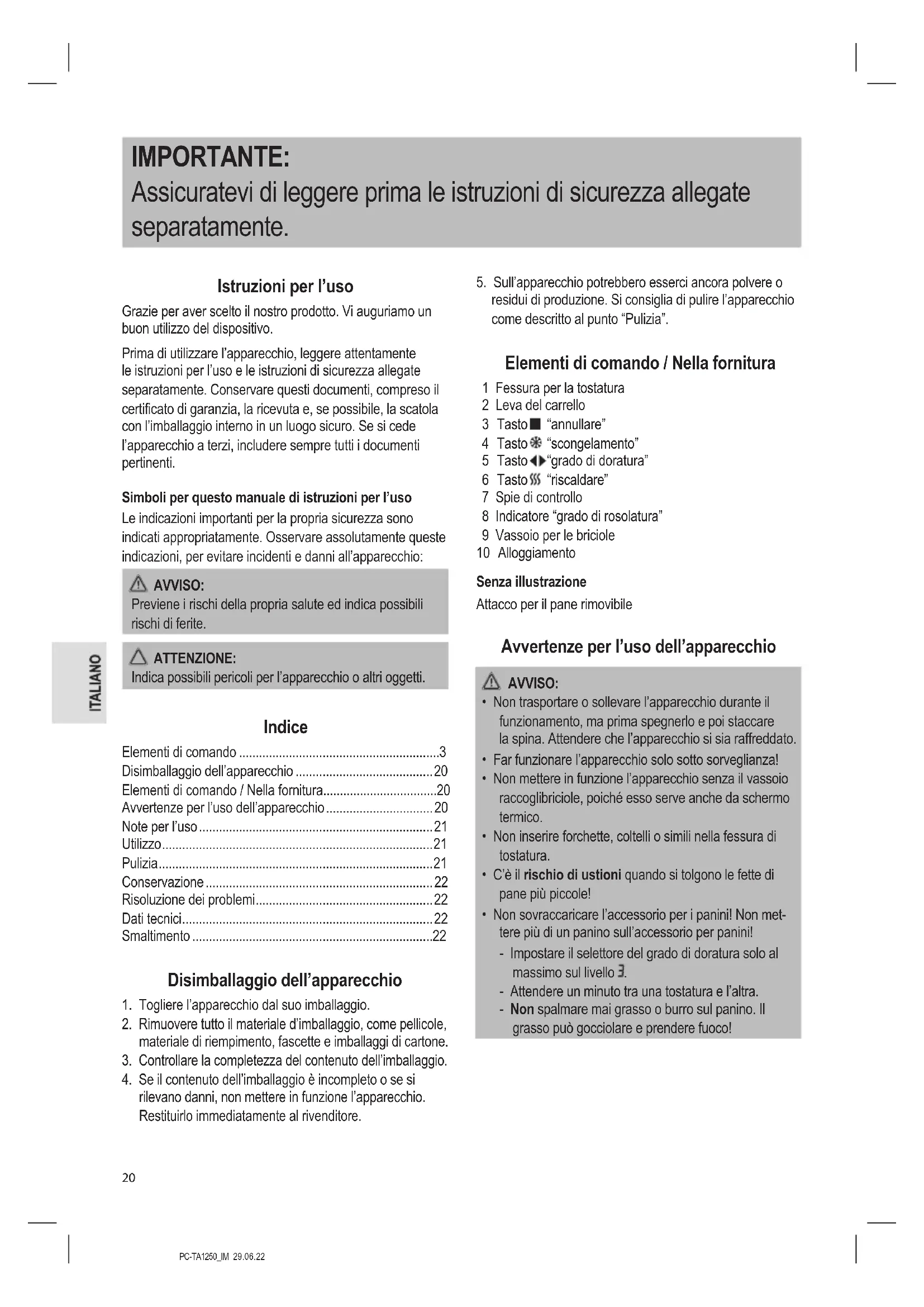 - Attendere un minuto tra una tostatura e l’altra. - Non spalmare mai grasso o burro sul panino. Il grasso può gocciolare e prendere fuoco!PC-TA1250_IM 29.06.22