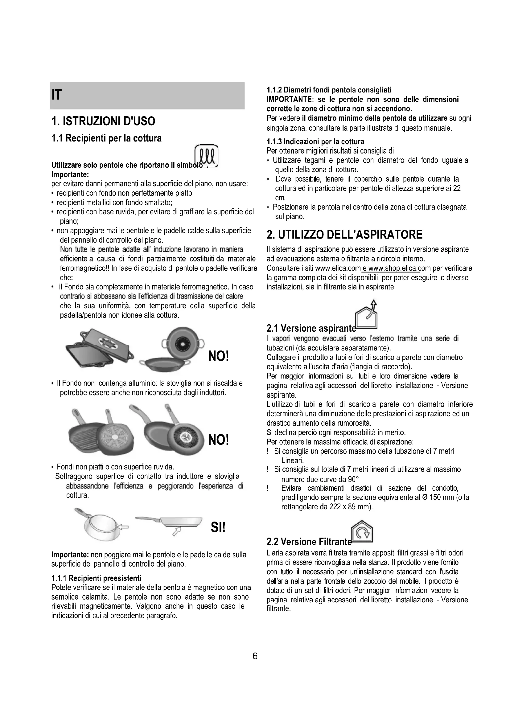 Il sistema di aspirazione può essere utilizzato in versione aspirante ad evacuazione esterna o filtrante a ricircolo interno. Consultare i siti www.elica.com e www.shop.elica.com per verificare la gamma completa dei kit disponibili, per poter eseguire le diverse installazioni, sia in filtrante sia in aspirante.
