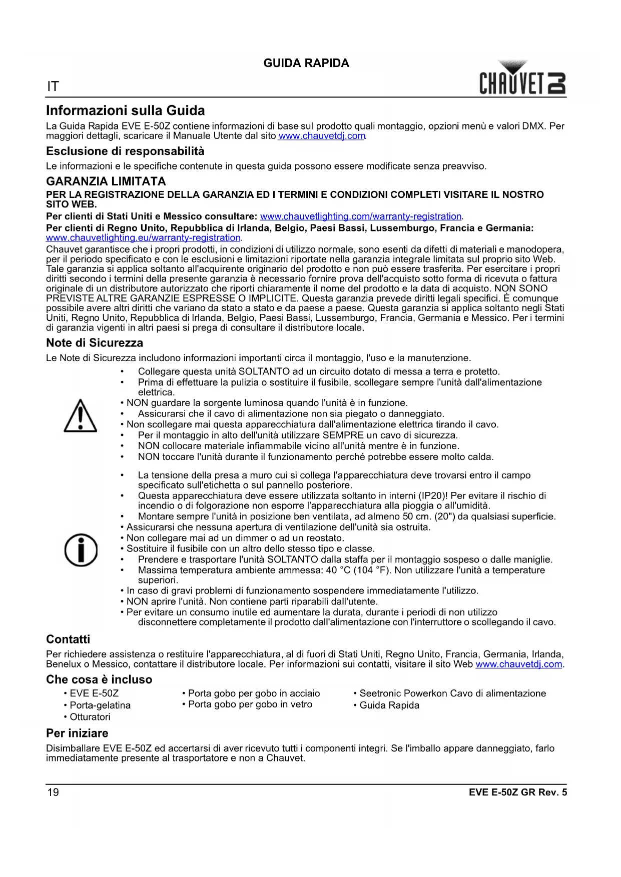 Chauvet garantisce che i propri prodotti, in condizioni di utilizzo normale, sono esenti da difetti di materiali e manodopera, per il periodo specificato e con le esclusioni e limitazioni riportate nella garanzia integrale limitata sul proprio sito Web. Tale garanzia si applica soltanto all'acquirente originario del prodotto e non può essere trasferita. Per esercitare i propri diritti secondo i termini della presente garanzia è necessario fornire prova dell'acquisto sotto forma di ricevuta o fattura originale di un distributore autorizzato che riporti chiaramente il nome del prodotto e la data di acquisto. NON SONO PREVISTE ALTRE GARANZIE ESPRESSE O IMPLICITE. Questa garanzia prevede diritti legali specifici. È comunque possibile avere altri diritti che variano da stato a stato e da paese a paese. Questa garanzia si applica soltanto negli Stati Uniti, Regno Unito, Repubblica di Irlanda, Belgio, Paesi Bassi, Lussemburgo, Francia, Germania e Messico. Per i termini di garanzia vigenti in altri paesi si prega di consultare il distributore locale. Note di Sicurezza Le Note di Sicurezza includono informazioni importanti circa il montaggio, l'uso e la manutenzione. Contatti Per richiedere assistenza o restituire l'apparecchiatura, al di fuori di Stati Uniti, Regno Unito, Francia, Germania, Irlanda, Benelux o Messico, contattare il distributore locale. Per informazioni sui contatti, visitare il sito Web www.chauvetdj.com. Che cosa è incluso Per iniziare Disimballare EVE E-50Z ed accertarsi di aver ricevuto tutti i componenti integri. Se l'imballo appare danneggiato, farlo immediatamente presente al trasportatore e non a Chauvet.