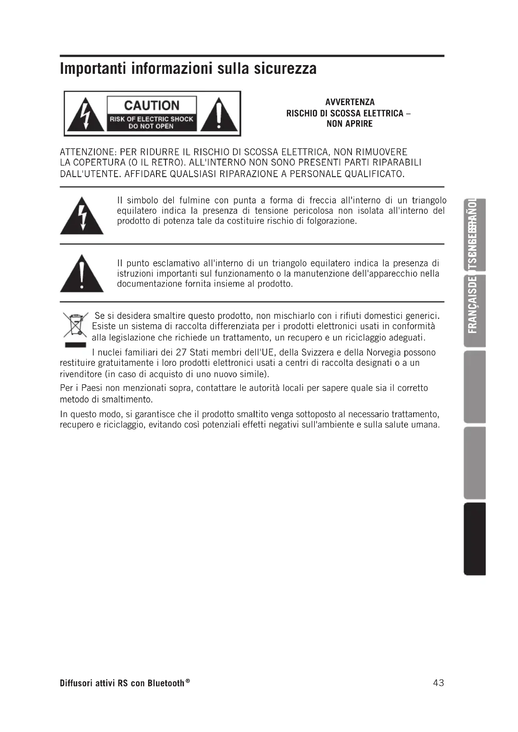 ATTENZIONE: PER RIDURRE IL RISCHIO DI SCOSSA ELETTRICA, NON RIMUOVERE LA COPERTURA (O IL RETRO). ALL'INTERNO NON SONO PRESENTI PARTI RIPARABILI DALL'UTENTE. AFFIDARE QUALSIASI RIPARAZIONE A PERSONALE QUALIFICATO.