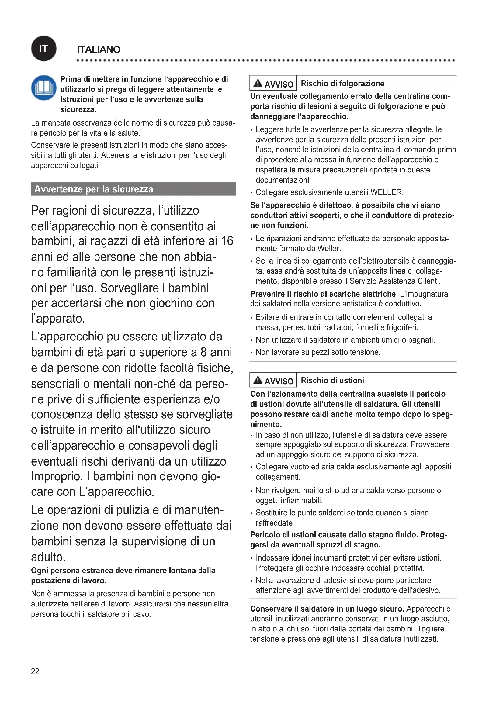 - Collegare esclusivamente utensili WELLER. Se l‘apparecchio è difettoso, è possibile che vi siano conduttori attivi scoperti, o che il conduttore di protezio- ne non funzioni.