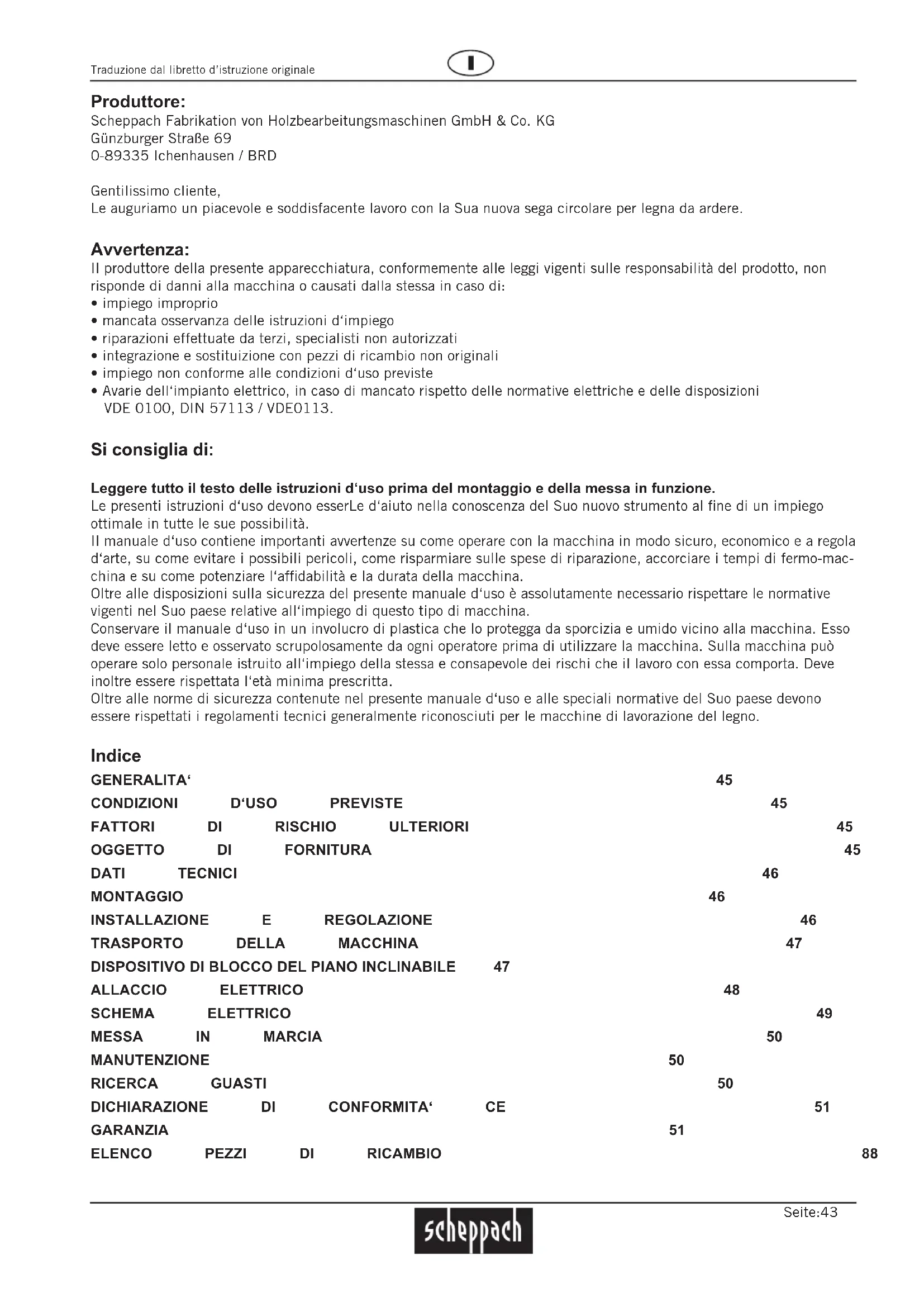 - Avarie dell‘impianto elettrico, in caso di mancato rispetto delle normative elettriche e delle disposizioni VDE 0100, DIN 57113 / VDE0113. Si consiglia di: Leggere tutto il testo delle istruzioni d‘uso prima del montaggio e della messa in funzione. Le presenti istruzioni d‘uso devono esserLe d‘aiuto nella conoscenza del Suo nuovo strumento al fine di un impiego ottimale in tutte le sue possibilità. Il manuale d‘uso contiene importanti avvertenze su come operare con la macchina in modo sicuro, economico e a regola d‘arte, su come evitare i possibili pericoli, come risparmiare sulle spese di riparazione, accorciare i tempi di fermo-mac- china e su come potenziare l‘affidabilità e la durata della macchina. Oltre alle disposizioni sulla sicurezza del presente manuale d‘uso è assolutamente necessario rispettare le normative vigenti nel Suo paese relative all‘impiego di questo tipo di macchina. Conservare il manuale d‘uso in un involucro di plastica che lo protegga da sporcizia e umido vicino alla macchina. Esso deve essere letto e osservato scrupolosamente da ogni operatore prima di utilizzare la macchina. Sulla macchina può operare solo personale istruito all‘impiego della stessa e consapevole dei rischi che il lavoro con essa comporta. Deve inoltre essere rispettata l‘età minima prescritta. Oltre alle norme di sicurezza contenute nel presente manuale d‘uso e alle speciali normative del Suo paese devono essere rispettati i regolamenti tecnici generalmente riconosciuti per le macchine di lavorazione del legno. Indice GENERALITA‘ 45