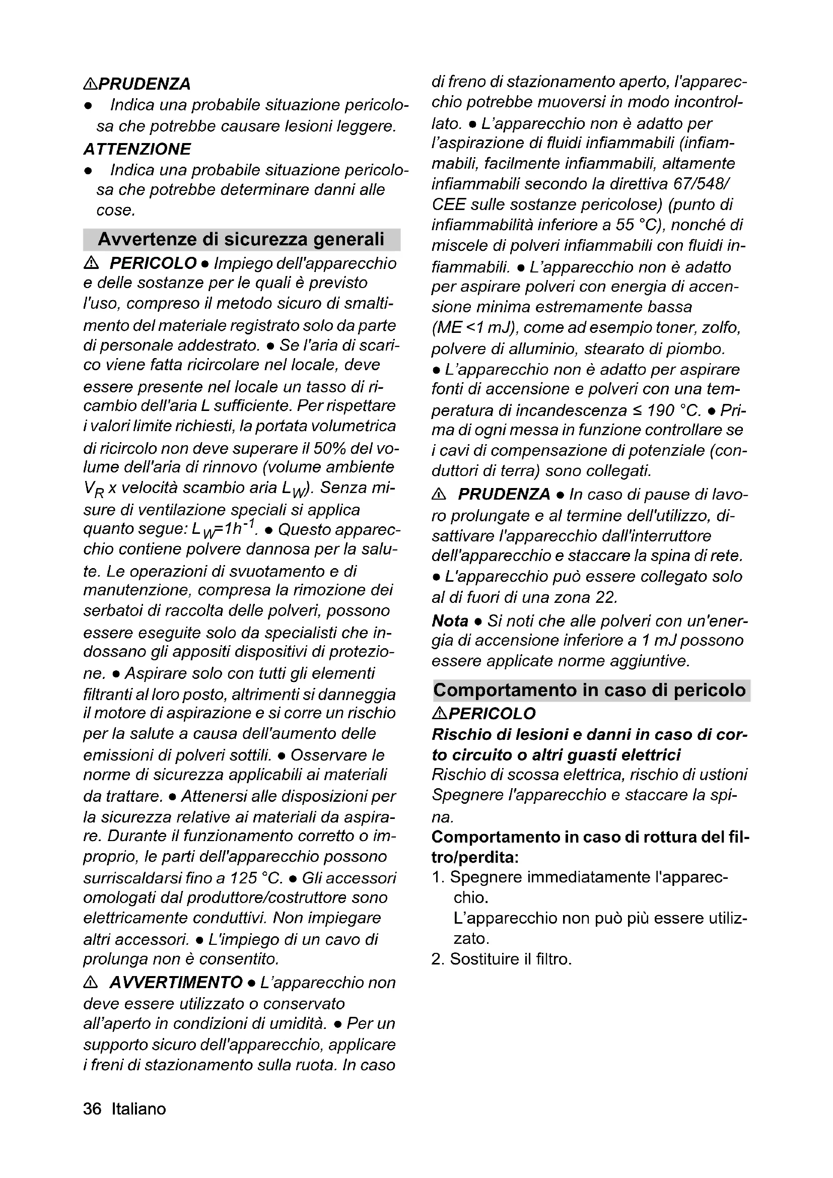 . ● Questo apparec- chio contiene polvere dannosa per la salu- te. Le operazioni di svuotamento e di manutenzione, compresa la rimozione dei serbatoi di raccolta delle polveri, possono essere eseguite solo da specialisti che in- dossano gli appositi dispositivi di protezio- ne. ● Aspirare solo con tutti gli elementi filtranti al loro posto, altrimenti si danneggia il motore di aspirazione e si corre un rischio per la salute a causa dell'aumento delle emissioni di polveri sottili. ● Osservare le norme di sicurezza applicabili ai materiali da trattare. ● Attenersi alle disposizioni per la sicurezza relative ai materiali da aspira- re. Durante il funzionamento corretto o im- proprio, le parti dell'apparecchio possono surriscaldarsi fino a 125 °C. ● Gli accessori omologati dal produttore/costruttore sono elettricamente conduttivi. Non impiegare altri accessori. ● L'impiego di un cavo di prolunga non è consentito. 몇 AVVERTIMENTO ● L’apparecchio non deve essere utilizzato o conservato all’aperto in condizioni di umidità. ● Per un supporto sicuro dell'apparecchio, applicare i freni di stazionamento sulla ruota. In caso di freno di stazionamento aperto, l'apparec- chio potrebbe muoversi in modo incontrol- lato. ● L’apparecchio non è adatto per l’aspirazione di fluidi infiammabili (infiam- mabili, facilmente infiammabili, altamente infiammabili secondo la direttiva 67/548/ CEE sulle sostanze pericolose) (punto di infiammabilità inferiore a 55 °C), nonché di miscele di polveri infiammabili con fluidi in- fiammabili. ● L’apparecchio non è adatto per aspirare polveri con energia di accen- sione minima estremamente bassa (ME <1 mJ), come ad esempio toner, zolfo, polvere di alluminio, stearato di piombo. ● L’apparecchio non è adatto per aspirare fonti di accensione e polveri con una tem- peratura di incandescenza ≤ 190 °C. ● Pri- ma di ogni messa in funzione controllare se i cavi di compensazione di potenziale (con- duttori di terra) sono collegati. 몇 PRUDENZA ● In caso di pause di lavo- ro prolungate e al termine dell'utilizzo, di- sattivare l'apparecchio dall'interruttore dell'apparecchio e staccare la spina di rete. ● L'apparecchio può essere collegato solo al di fuori di una zona 22. Nota ● Si noti che alle polveri con un'ener- gia di accensione inferiore a 1 mJ possono essere applicate norme aggiuntive. Comportamento in caso di pericolo PERICOLO Rischio di lesioni e danni in caso di cor- to circuito o altri guasti elettrici Rischio di scossa elettrica, rischio di ustioni Spegnere l'apparecchio e staccare la spi- na. Comportamento in caso di rottura del fil- tro/perdita: