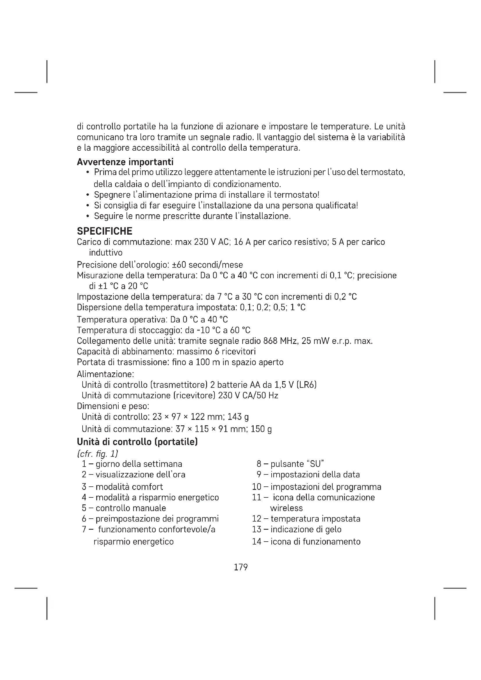 - Seguire le norme prescritte durante l’installazione. SPECIFICHE Carico di commutazione: max 230 V AC; 16 A per carico resistivo; 5 A per carico induttivo Precisione dell’orologio: ±60 secondi/mese Misurazione della temperatura: Da 0 °C a 40 °C con incrementi di 0,1 °C; precisione di ±1 °C a 20 °C Impostazione della temperatura: da 7 °C a 30 °C con incrementi di 0,2 °C Dispersione della temperatura impostata: 0,1; 0,2; 0,5; 1 °C Temperatura operativa: Da 0 °C a 40 °C Temperatura di stoccaggio: da -10 °C a 60 °C Collegamento delle unità: tramite segnale radio 868 MHz, 25 mW e.r.p. max. Capacità di abbinamento: massimo 6 ricevitori Portata di trasmissione: no a 100 m in spazio aperto Alimentazione: Unità di controllo (trasmettitore) 2 batterie AA da 1,5 V (LR6) Unità di commutazione (ricevitore) 230 V CA/50 Hz Dimensioni e peso: Unità di controllo: 23 × 97 × 122 mm; 143 g Unità di commutazione: 37 × 115 × 91 mm; 150 g Unità di controllo (portatile) (cfr. g. 1) 1 – giorno della settimana 2 – visualizzazione dell’ora 3 – modalità comfort 4 – modalità a risparmio energetico 5 – controllo manuale 6 – preimpostazione dei programmi 7 – funzionamento confortevole/a risparmio energetico 8 – pulsante “SU” 9 – impostazioni della data 10 – impostazioni del programma 11 – icona della comunicazione wireless 12 – temperatura impostata 13 – indicazione di gelo 14 – icona di funzionamento180 15 – indicazione dello stato della batteria 16 – visualizzazione della temperatura ambiente attuale 17 – visualizza del prolo del giorno 18 – pulsante “GIÙ” 19 – regolazione della temperatura 20 – retroilluminazione del display 21 – RESET del dispositivo Rimozione del coperchio posteriore dell’unità di controllo (cfr. g. 2)