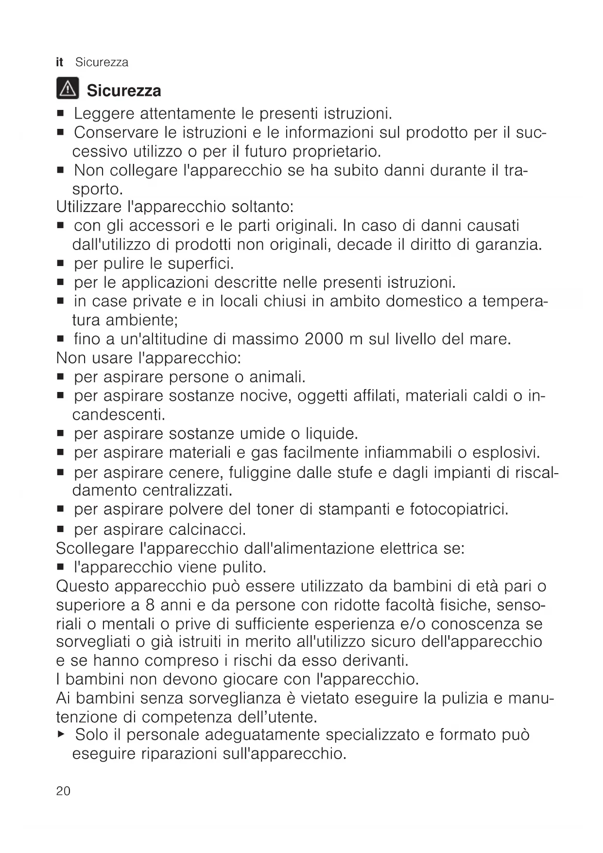 Sicurezza ¡ Leggere attentamente le presenti istruzioni. ¡ Conservare le istruzioni e le informazioni sul prodotto per il suc- cessivo utilizzo o per il futuro proprietario. ¡ Non collegare l'apparecchio se ha subito danni durante il tra- sporto. Utilizzare l'apparecchio soltanto: ¡ con gli accessori e le parti originali. In caso di danni causati dall'utilizzo di prodotti non originali, decade il diritto di garanzia. ¡ per pulire le superfici. ¡ per le applicazioni descritte nelle presenti istruzioni. ¡ in case private e in locali chiusi in ambito domestico a tempera- tura ambiente; ¡ fino a un'altitudine di massimo 2000m sul livello del mare. Non usare l'apparecchio: ¡ per aspirare persone o animali. ¡ per aspirare sostanze nocive, oggetti affilati, materiali caldi o in- candescenti. ¡ per aspirare sostanze umide o liquide. ¡ per aspirare materiali e gas facilmente infiammabili o esplosivi. ¡ per aspirare cenere, fuliggine dalle stufe e dagli impianti di riscal- damento centralizzati. ¡ per aspirare polvere del toner di stampanti e fotocopiatrici. ¡ per aspirare calcinacci. Scollegare l'apparecchio dall'alimentazione elettrica se: ¡ l'apparecchio viene pulito. Questo apparecchio può essere utilizzato da bambini di età pari o superiore a 8 anni e da persone con ridotte facoltà fisiche, senso- riali o mentali o prive di sufficiente esperienza e/o conoscenza se sorvegliati o già istruiti in merito all'utilizzo sicuro dell'apparecchio e se hanno compreso i rischi da esso derivanti. I bambini non devono giocare con l'apparecchio. Ai bambini senza sorveglianza è vietato eseguire la pulizia e manu- tenzione di competenza dell’utente. ▶ Solo il personale adeguatamente specializzato e formato può eseguire riparazioni sull'apparecchio.Sicurezza it