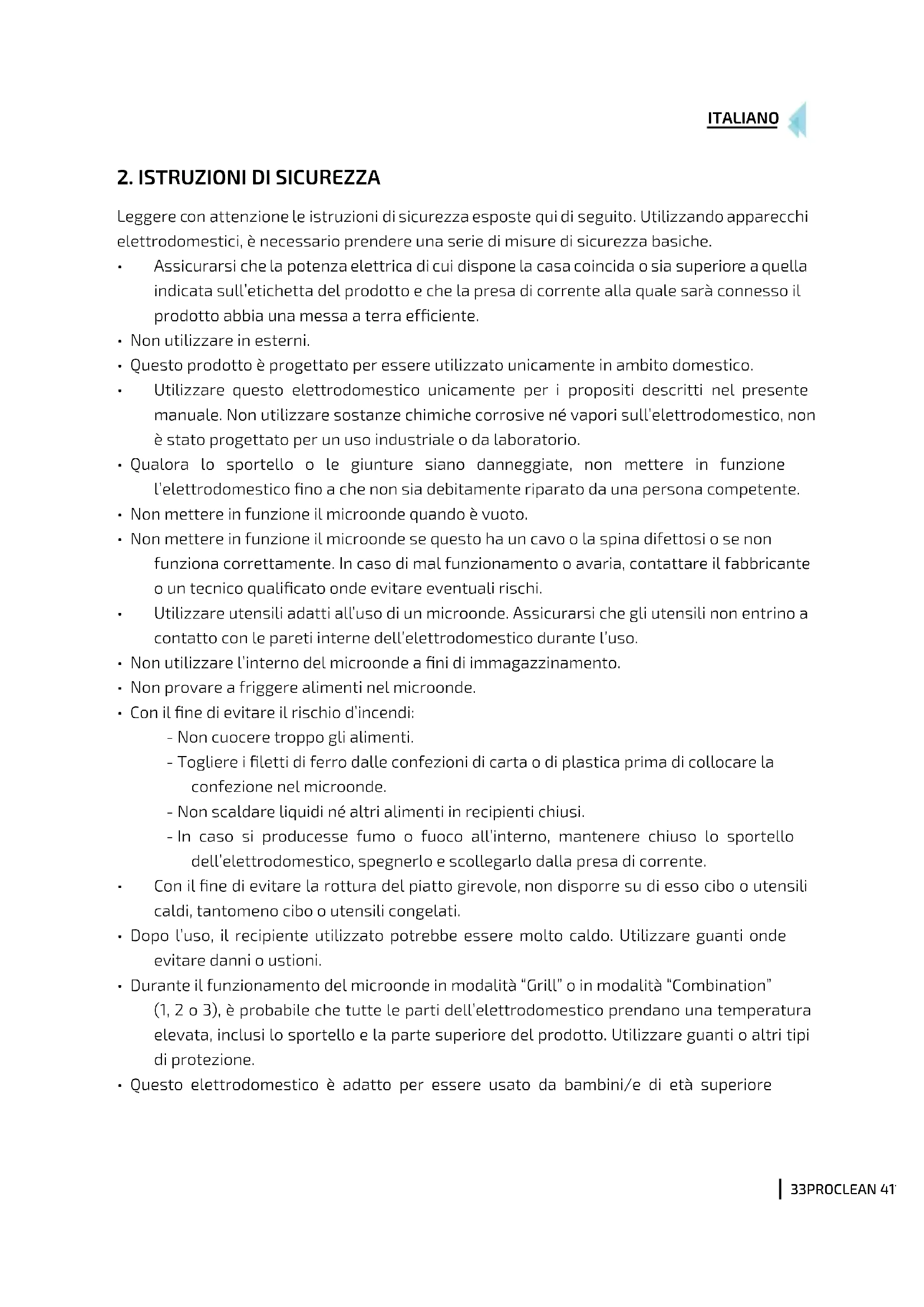 - Questo prodotto è un’attrezzatura ISM Gruppo 2 Classe B. La denizione di Gruppo 2 include tutte le attrezzature ISM (Industrial, Scientico e Medico) nelle quali si generi e/o si utilizzi energia a radiofrequenza in forma di radiazioni elettromagnetiche per il trattamento materiale, e ogni attrezzatura a elettroerosione. L’attrezzatura di classe B è un tipo di apparecchiatura adeguata per l’uso in uno stabilimento domestico e uno stabilimento direttamente connesso a una rete di energia elettrica a basso voltaggio che rifornisca edici utilizzati a ni domestici. AVVERTENZA: Qualsiasi servizio di manutenzione o di riparazione che preveda il ritiro di qualcuno dei coperchi o che si esponga ai cavi, dovrà sempre essere svolto da un professionista competente e qualicato. AVVERTENZA: È importante utilizzare materiali e recipienti compatibili a un uso sicuro in microonde. Qui di seguito, è possibile vedere nella tabella quali sono i materiali adatti e quali no: Materiale del recipiente Microonde Grill Combi Note Ceramica resistente al calore Si Si Si Mai utilizzare ceramiche decorate con vetro o riniture. Plastica resistente al calore Si No No Mai scaldarlo in modo prolungato. Vetro resistente al calore Si Si Si Pellicola in plastica Si No No Mai utilizzarlo per cuocere carne, le alte temperature potrebbero danneggiarlo. Griglia No Si Si Recipiente in me- tallo No No No Le radiazioni del microonde non attraversano il metallo. Recipiente laccato No No No Poco resistente al calore. Bambù o carta No No No Poco resistente al calore.ITALIANO 35PROCLEAN 4110