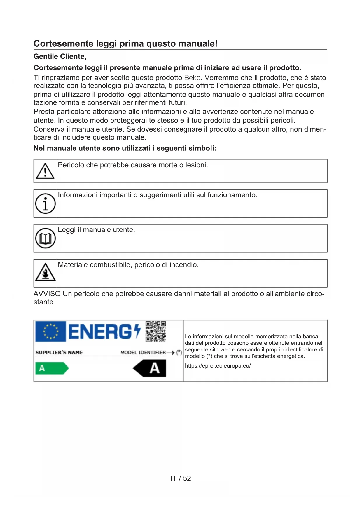 Cortesemente leggi prima questo manuale! Gentile Cliente, Cortesemente leggi il presente manuale prima di iniziare ad usare il prodotto. Ti ringraziamo per aver scelto questo prodotto Beko. Vorremmo che il prodotto, che è stato realizzato con la tecnologia più avanzata, ti possa offrire l’efficienza ottimale. Per questo, prima di utilizzare il prodotto leggi attentamente questo manuale e qualsiasi altra documen- tazione fornita e conservali per riferimenti futuri. Presta particolare attenzione alle informazioni e alle avvertenze contenute nel manuale utente. In questo modo proteggerai te stesso e il tuo prodotto da possibili pericoli. Conserva il manuale utente. Se dovessi consegnare il prodotto a qualcun altro, non dimen- ticare di includere questo manuale. Nel manuale utente sono utilizzati i seguenti simboli: Pericolo che potrebbe causare morte o lesioni. Informazioni importanti o suggerimenti utili sul funzionamento. Leggi il manuale utente. Materiale combustibile, pericolo di incendio. AVVISO Un pericolo che potrebbe causare danni materiali al prodotto o all'ambiente circo- stante Le informazioni sul modello memorizzate nella banca dati del prodotto possono essere ottenute entrando nel seguente sito web e cercando il proprio identificatore di modello (*) che si trova sull'etichetta energetica. https://eprel.ec.europa.eu/IT / 53 1 Istruzioni di sicurezza................... 54