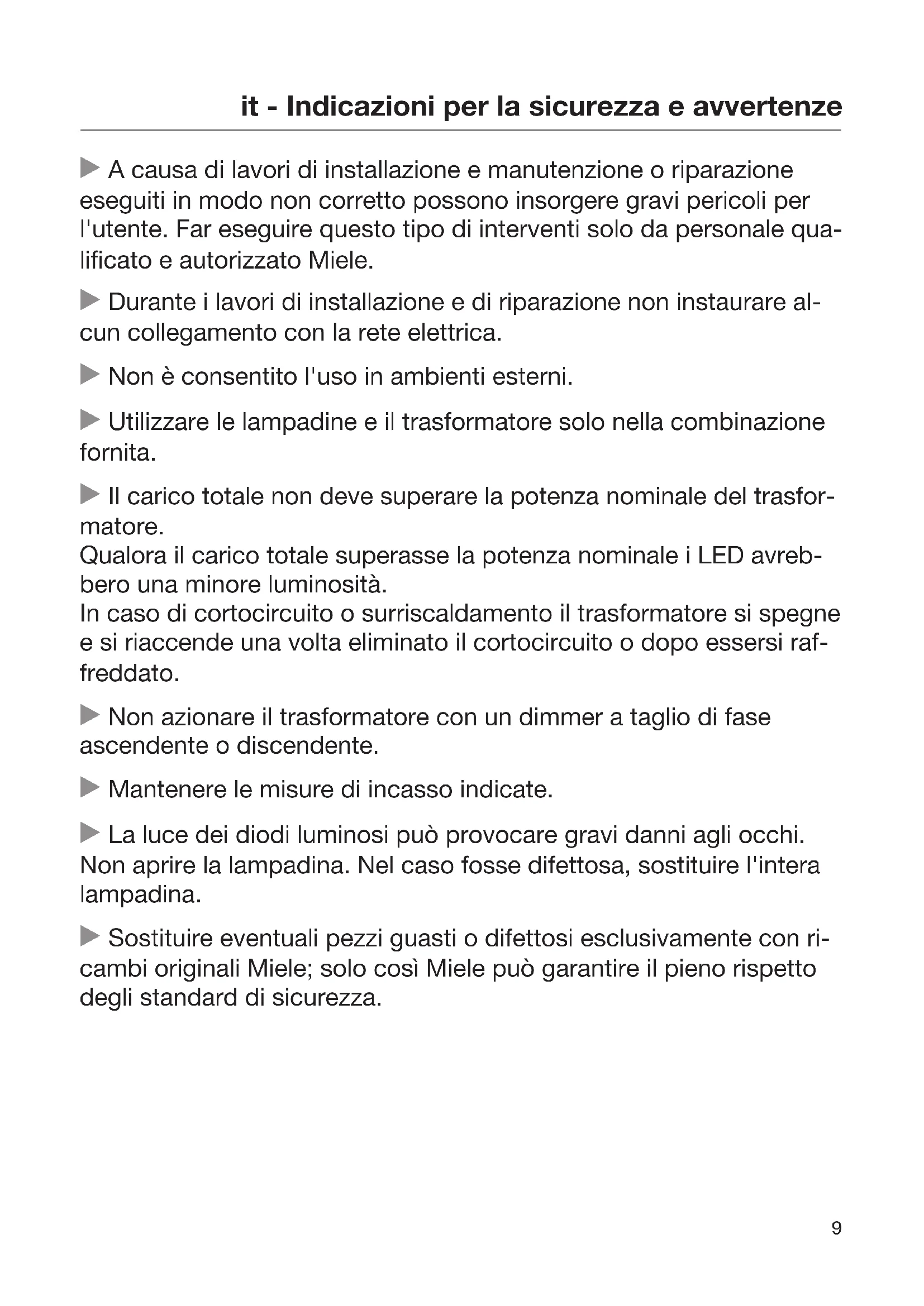 A causa di lavori di installazione e manutenzione o riparazione eseguiti in modo non corretto possono insorgere gravi pericoli per l'utente. Far eseguire questo tipo di interventi solo da personale qua- lificato e autorizzato Miele. Durante i lavori di installazione e di riparazione non instaurare al- cun collegamento con la rete elettrica. Non è consentito l'uso in ambienti esterni. Utilizzare le lampadine e il trasformatore solo nella combinazione fornita. Il carico totale non deve superare la potenza nominale del trasfor- matore. Qualora il carico totale superasse la potenza nominale i LED avreb- bero una minore luminosità. In caso di cortocircuito o surriscaldamento il trasformatore si spegne e si riaccende una volta eliminato il cortocircuito o dopo essersi raf- freddato. Non azionare il trasformatore con un dimmer a taglio di fase ascendente o discendente. Mantenere le misure di incasso indicate. La luce dei diodi luminosi può provocare gravi danni agli occhi. Non aprire la lampadina. Nel caso fosse difettosa, sostituire l'intera lampadina. Sostituire eventuali pezzi guasti o difettosi esclusivamente con ri- cambi originali Miele; solo così Miele può garantire il pieno rispetto degli standard di sicurezza.it - DES 6000