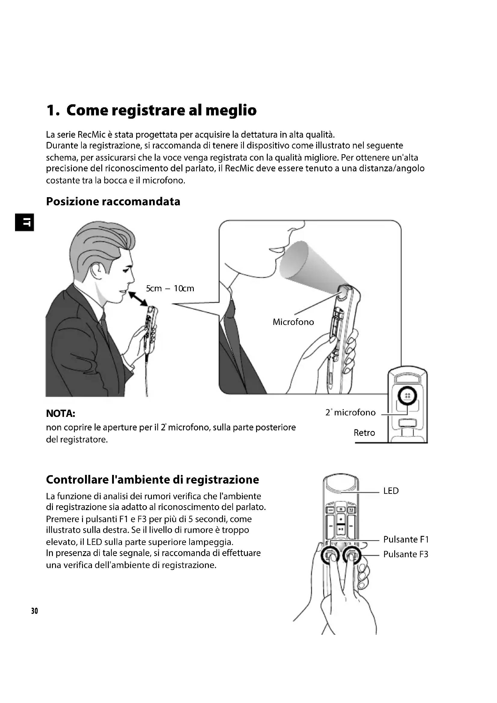 Microfono Controllare l'ambiente di registrazione La funzione di analisi dei rumori verifica che l'ambiente di registrazione sia adatto al riconoscimento del parlato. Premere i pulsanti F1 e F3 per più di 5 secondi, come illustrato sulla destra. Se il livello di rumore è troppo elevato, il LED sulla parte superiore lampeggia. In presenza di tale segnale, si raccomanda di effettuare unaverifica dell'ambiente di registrazione. Pulsante F3 LED Pulsante F1 Retro