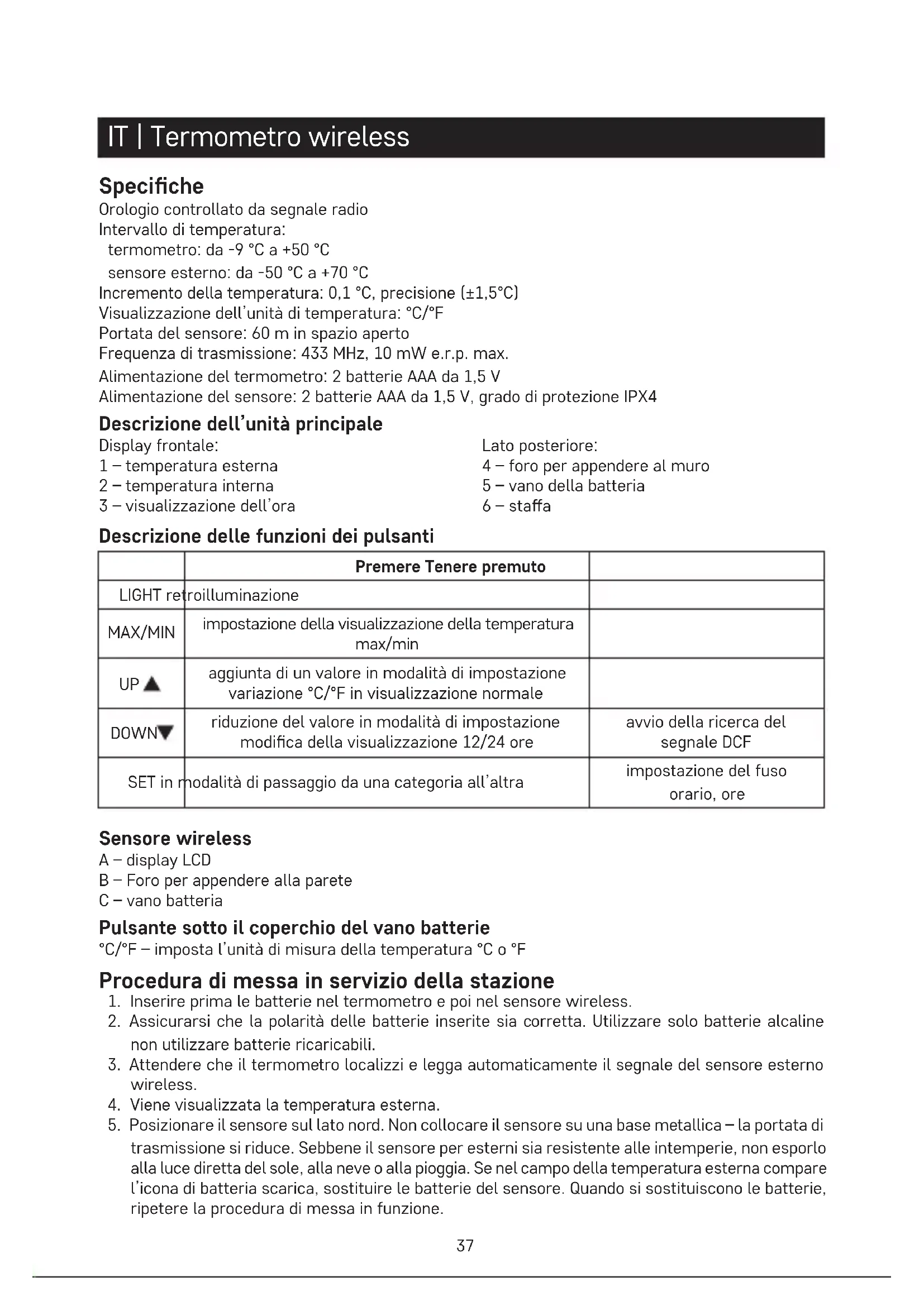 aggiunta di un valore in modalità di impostazione variazione °C/°F in visualizzazione normale DOWN riduzione del valore in modalità di impostazione modica della visualizzazione 12/24 ore avvio della ricerca del segnale DCF SET in modalità di passaggio da una categoria all’altra impostazione del fuso orario, ore Sensore wireless A – display LCD B – Foro per appendere alla parete C – vano batteria Pulsante sotto il coperchio del vano batterie °C/°F – imposta l’unità di misura della temperatura °C o °F Procedura di messa in servizio della stazione