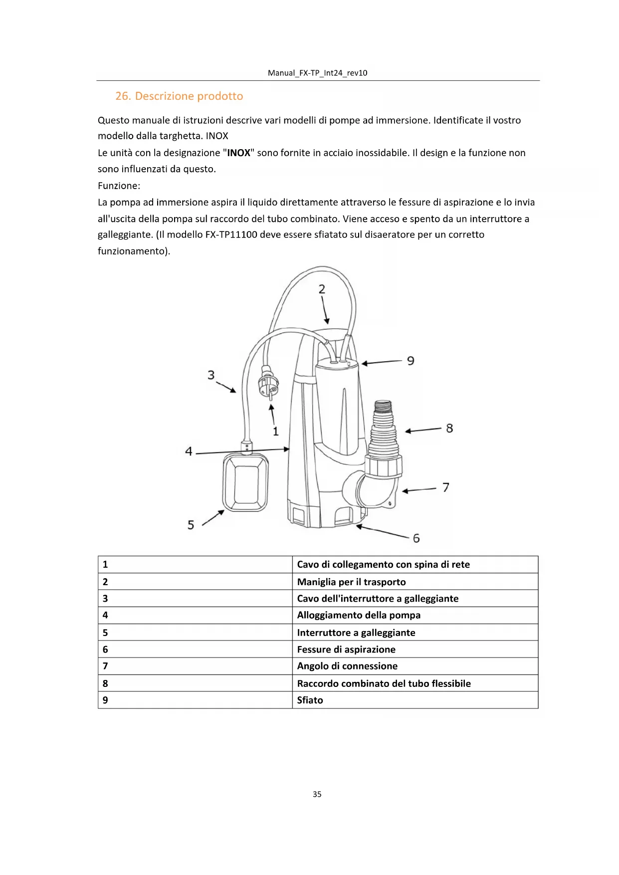 Questo manuale di istruzioni descrive vari modelli di pompe ad immersione. Identificate il vostro modello dalla targhetta. INOX Le unità con la designazione "INOX" sono fornite in acciaio inossidabile. Il design e la funzione non sono influenzati da questo. Funzione: La pompa ad immersione aspira il liquido direttamente attraverso le fessure di aspirazione e lo invia all'uscita della pompa sul raccordo del tubo combinato. Viene acceso e spento da un interruttore a galleggiante. (Il modello FX-TP11100 deve essere sfiatato sul disaeratore per un corretto funzionamento).
